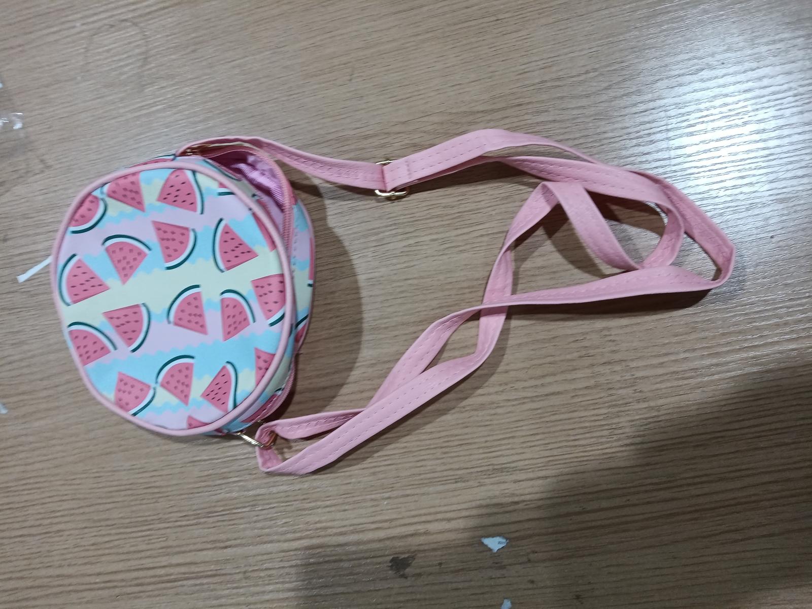 - Яркий дизайн: Сумочка выполнена в нежных розовых тонах с забавным принтом в виде арбузных долек, что обязательно понравится ребенку.