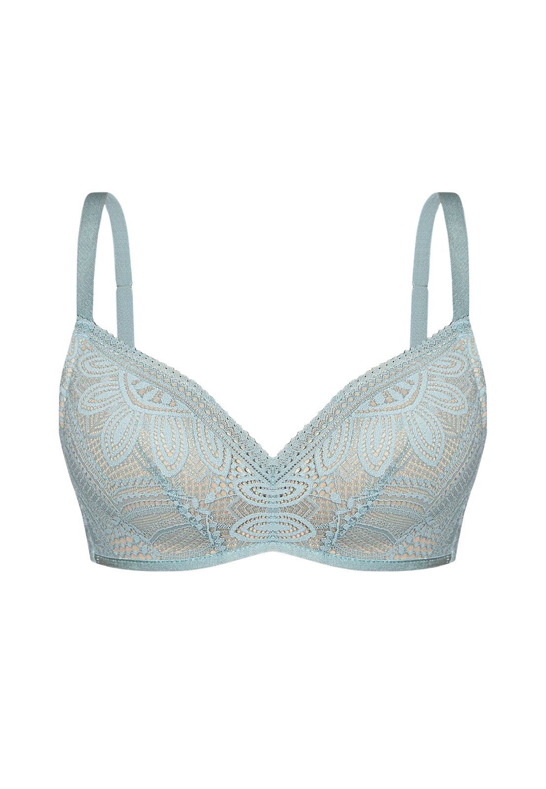 Модель размером 65F с чашками голубого оттенка выполнена по бесшовной технологии. Удлинённая застёжка на спине (3 крючка) и продублированная сетчатая спинка гарантируют надёжную фиксацию. Подходит для ежедневной носки и особых случаев.