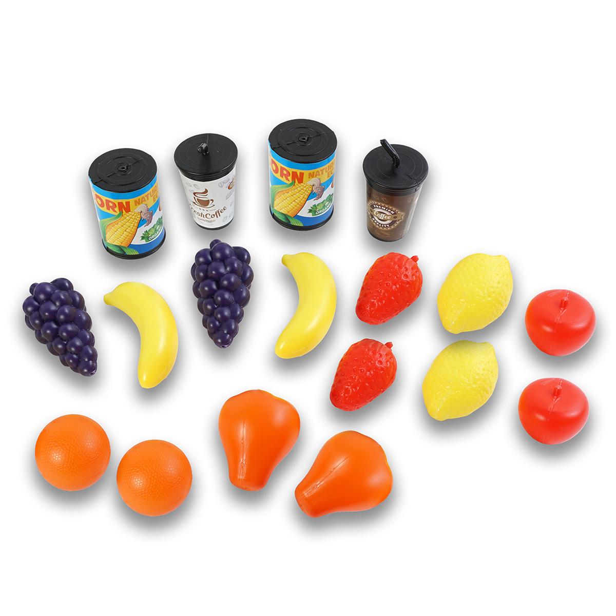 Пластиковая поверхность тележки и аксессуаров легко очищается от загрязнений, что делает ее отличным выбором для игры в песочнице или на детской площадке. Детализированные муляжи продуктов с этикетками (например, Corn Natur или Fresh Coffee) добавляют игре реалистичности, помогая ребенку запоминать названия товаров.