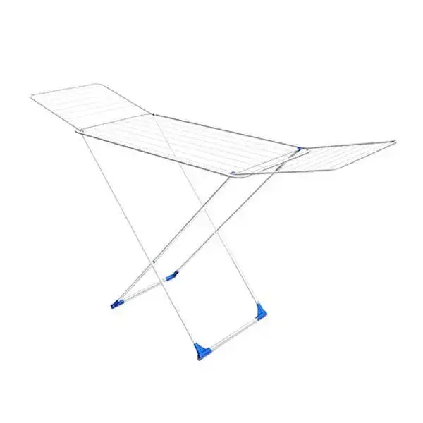 Сушилка выполнена из прочного металла с белым покрытием и синего пластика на соединениях и ножках. Конструкция состоит из центральной части и двух боковых откидных секций, которые позволяют размещать белье различных размеров. Прямоугольная форма и устойчивые опорные ножки обеспечивают надежность и удобство ежедневного использования. Легкий вес и простая сборка делают сушилку идеальным выбором как для квартиры, так и для частного дома.