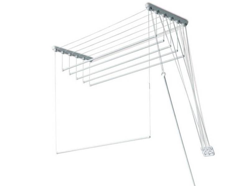 Размер сушилки — 1,4 метра, материал основы — металл, цвет — белый. Конструкция крепится к потолку с помощью подвесов и гарантирует удобство использования даже в ограниченном пространстве. Подойдет для установки на балконе, в ванной или хозяйственной комнате.