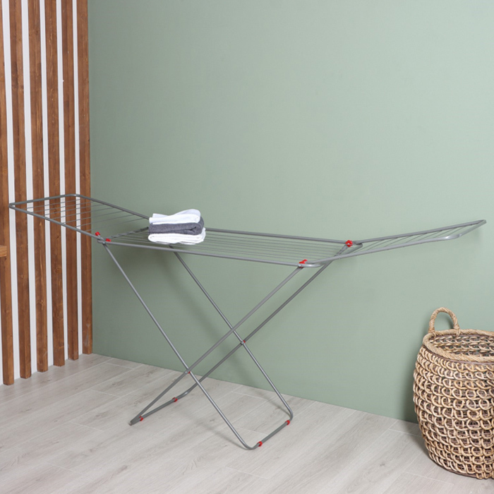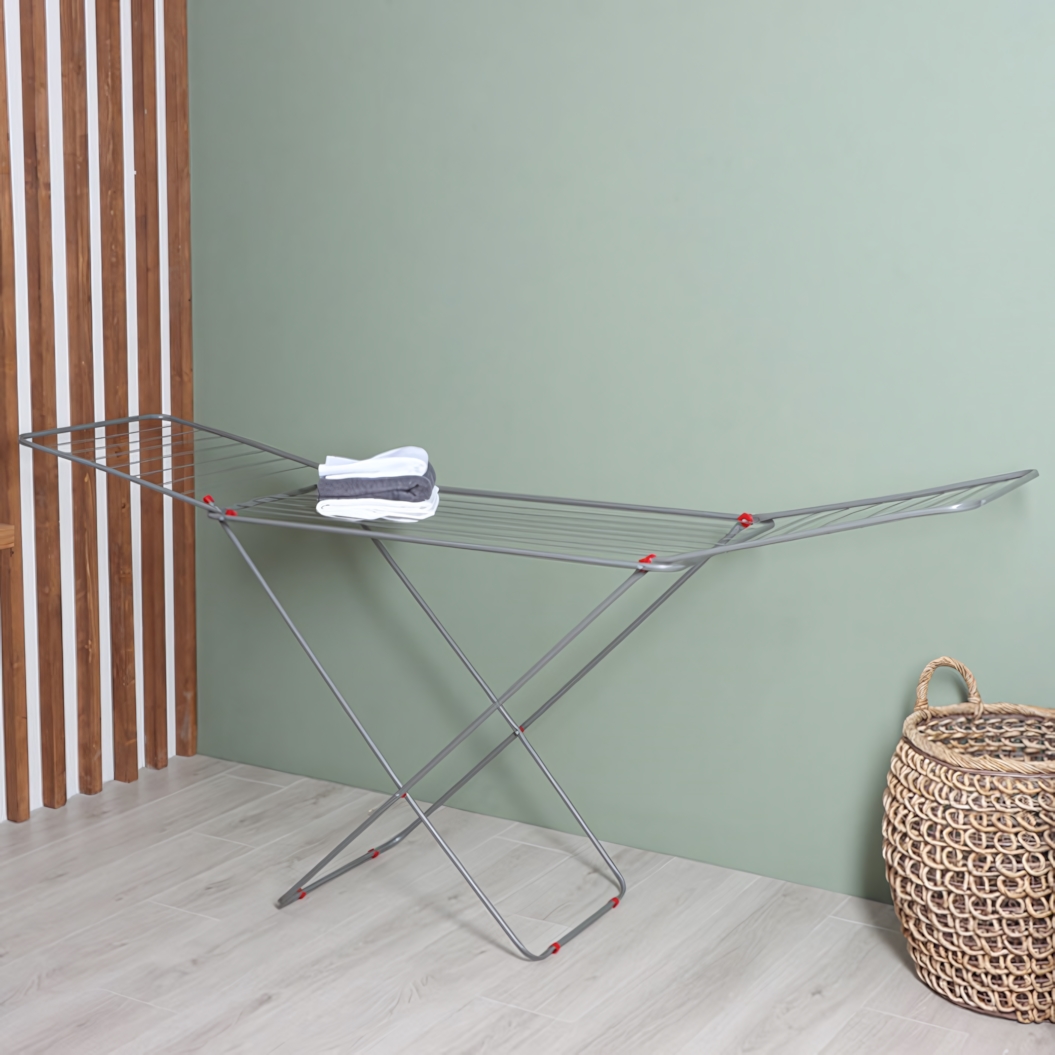 Компактная высота 79 см позволяет разместить сушилку даже в небольших помещениях. Складная конструкция упрощает хранение, а красные пластиковые элементы добавляют эстетики.