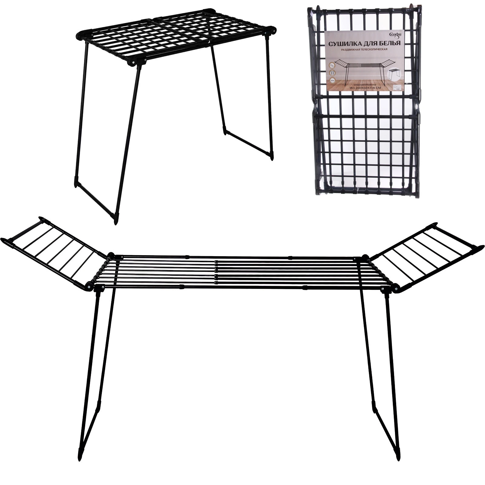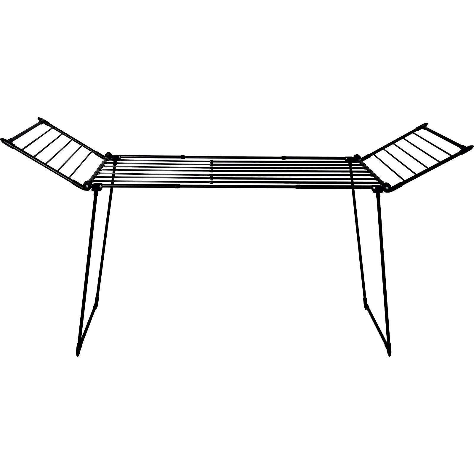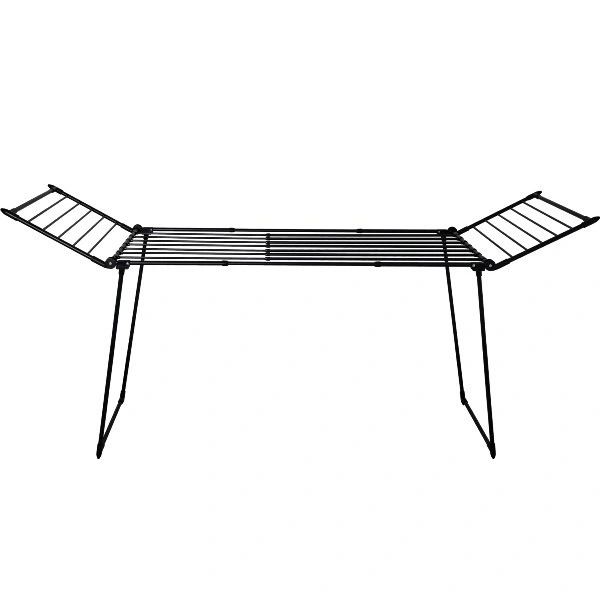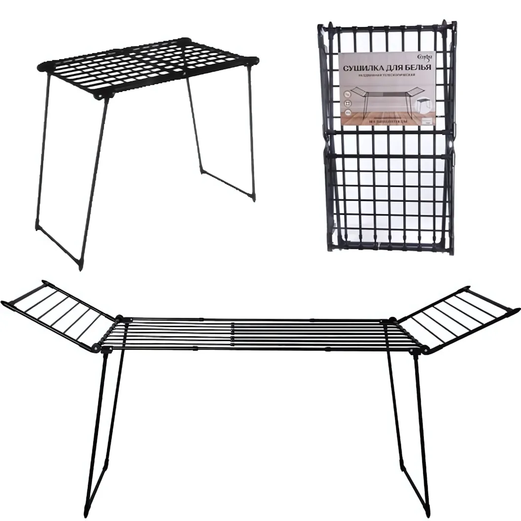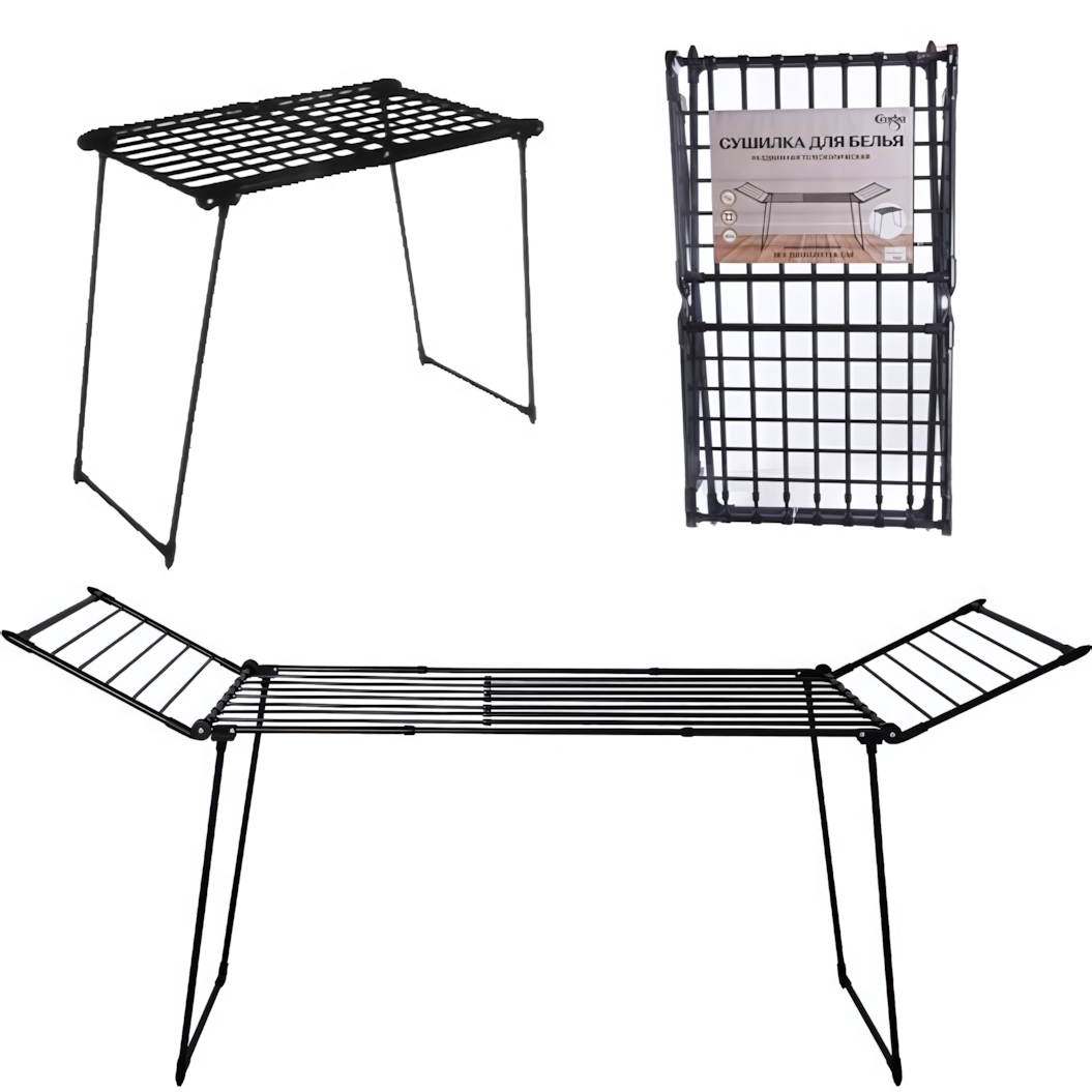 Сушилка изготовлена из прочного металла с черным покрытием, устойчивым к коррозии и влаге. Все соединения надежны, а шарнирные механизмы боковых крыльев обеспечивают плавное открывание и фиксацию. Решетчатая поверхность центральной части и поперечные прутья боковин позволяют воздуху свободно циркулировать, ускоряя процесс сушки.