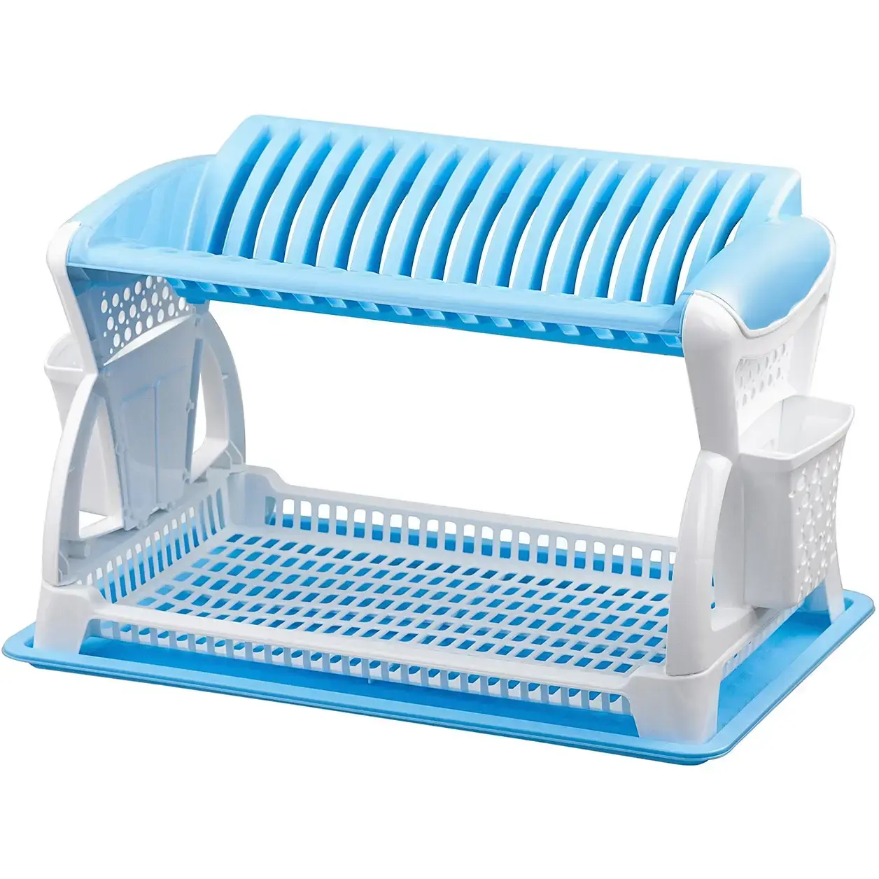 Выбирая эту сушилку, вы получаете не только функциональный, но и стильный элемент для вашей кухни. Голубой цвет с белыми элементами гармонично впишется в любой интерьер. Вертикальные ребра на верхней полке способствуют быстрому стеканию воды, а перфорированные стенки обеспечивают хорошую вентиляцию. Дополнительный контейнер для столовых принадлежностей позволяет удобно организовать пространство.