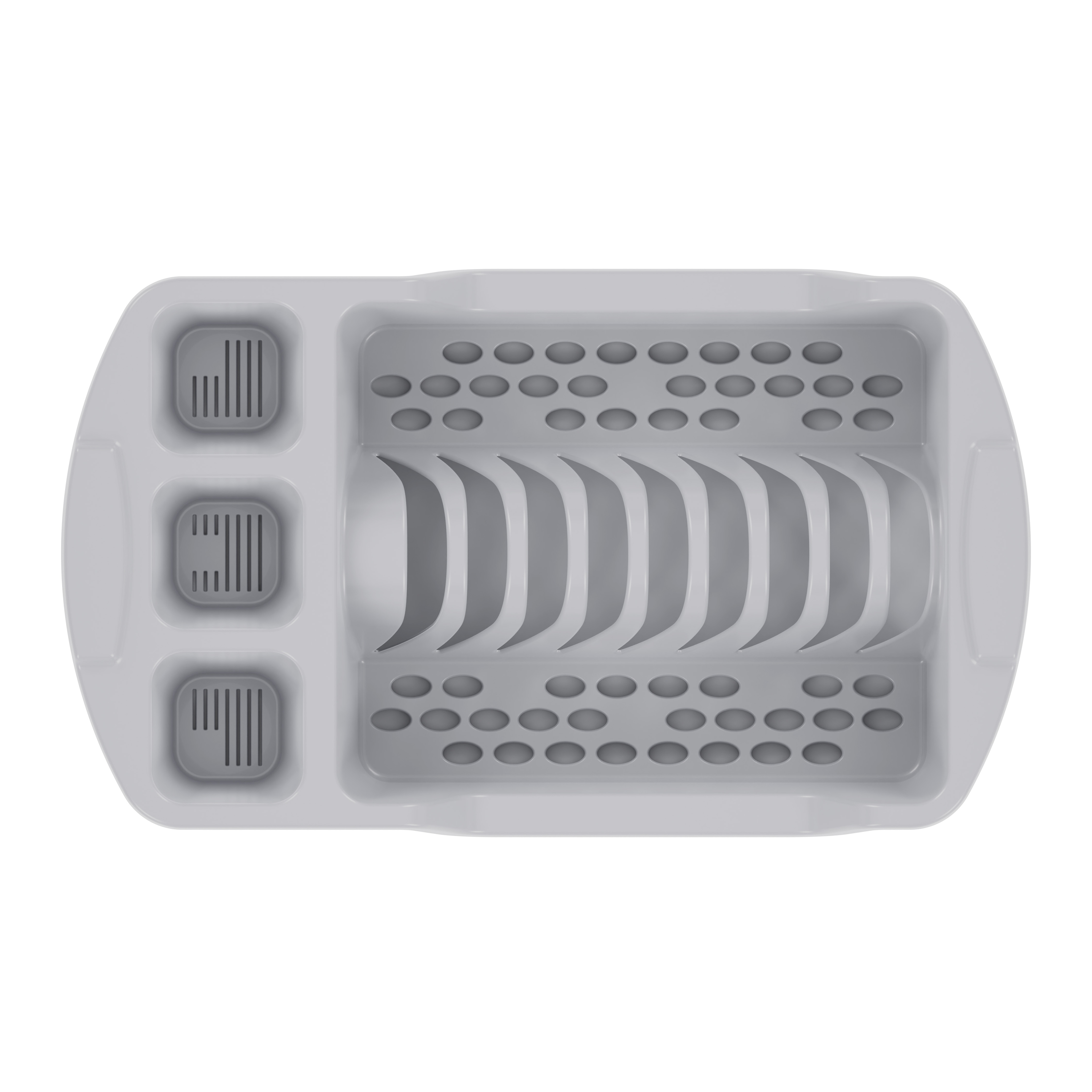 Сушилка Хозяюшка имеет несколько отделений, что позволяет удобно разместить различные предметы посуды. Отделение с ребрами обеспечивает надежную установку тарелок, а углубление с отверстиями для стока воды предотвращает накопление влаги.