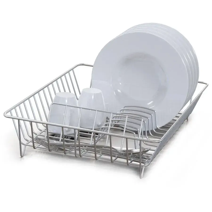 Металлическая сушилка с продуманной конструкцией избавит от лужиц на столешнице и аккуратно разместит посуду после мытья. Сетчатое основание и многоуровневое расположение полочек обеспечивают эффективную сушку даже крупных тарелок и стаканов.
