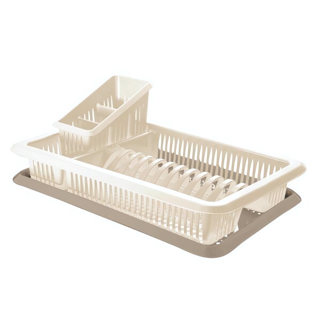 Универсальный дизайн в нежном оттенке шампань гармонично впишется в любой интерьер. Рифлёные бортики надёжно фиксируют посуду, а съёмная корзина для приборов может использоваться как самостоятельный органайзер в шкафу.