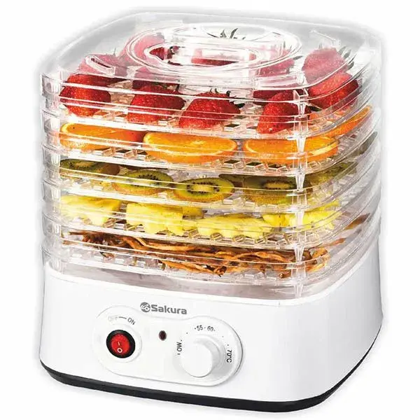 Сушилка для фруктов и овощей SAKURA SA-7808, 5 прозрачных лотков, 250 Вт, регулировка температуры 50-70°C, белый
