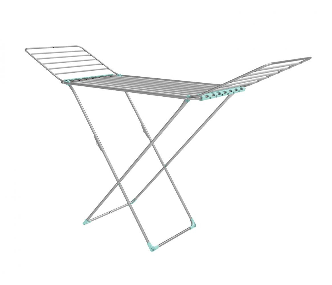 Сушилка выполнена из высококачественных материалов: прочные металлические трубы серебристого цвета обеспечивают долговечность и устойчивость к коррозии, а яркие светло-голубые пластиковые элементы на ножках добавляют не только устойчивости, но и эстетическую привлекательность. Минималистичный дизайн идеально впишется в любой интерьер, не нарушая гармонии вашего пространства. Пластиковые вставки на ножках также защищают напольное покрытие от царапин.
