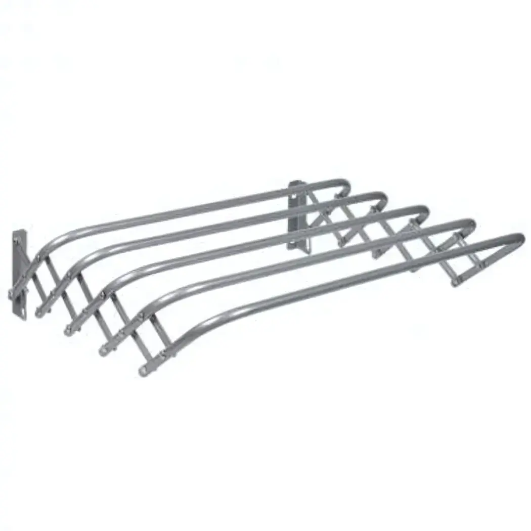 Металлическая сушилка имеет прочные крепления и состоит из 4 параллельных перекладин. Специальный механизм складывания позволяет быстро развернуть или сложить изделие. Вес конструкции всего 2.1кг, что делает её удобной для монтажа на любую стену.