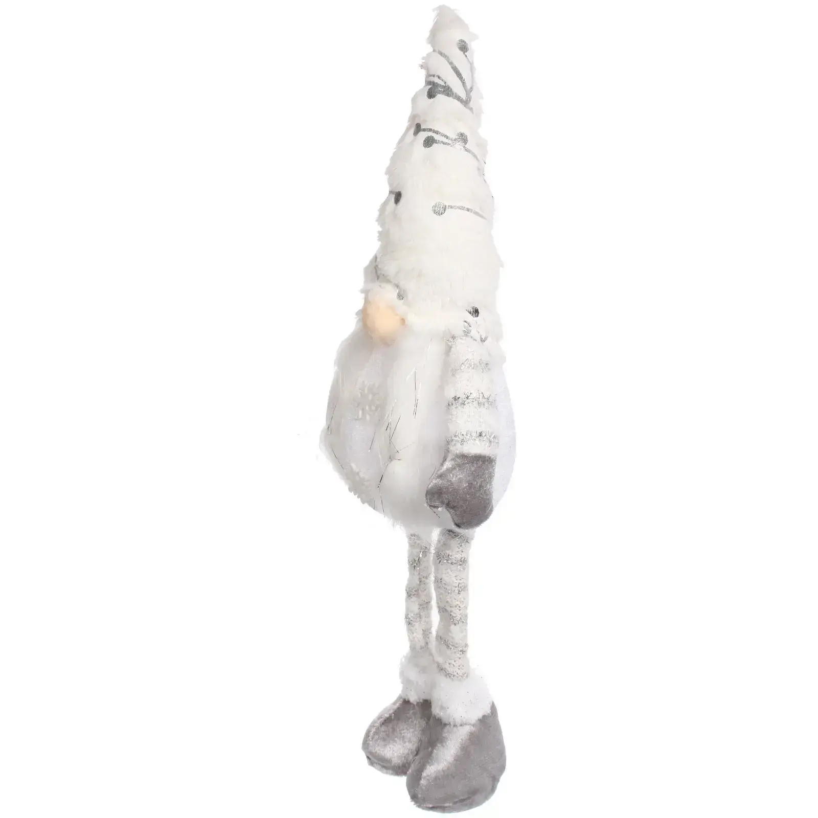 Размеры: 47 см в высоту (включая шапку) × 9 см в ширину. Материал корпуса — прочный пластик с текстурной обработкой, элементы одежды выполнены из гипоаллергенного текстиля. Цветовая гамма сочетает серебристые оттенки с теплым белым свечением. Подсветка работает от 3 батареек типа АА (не входят в комплект).