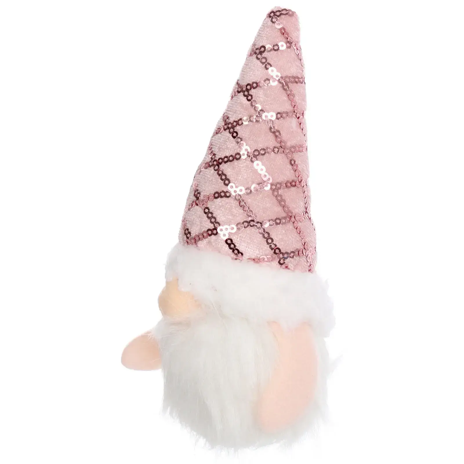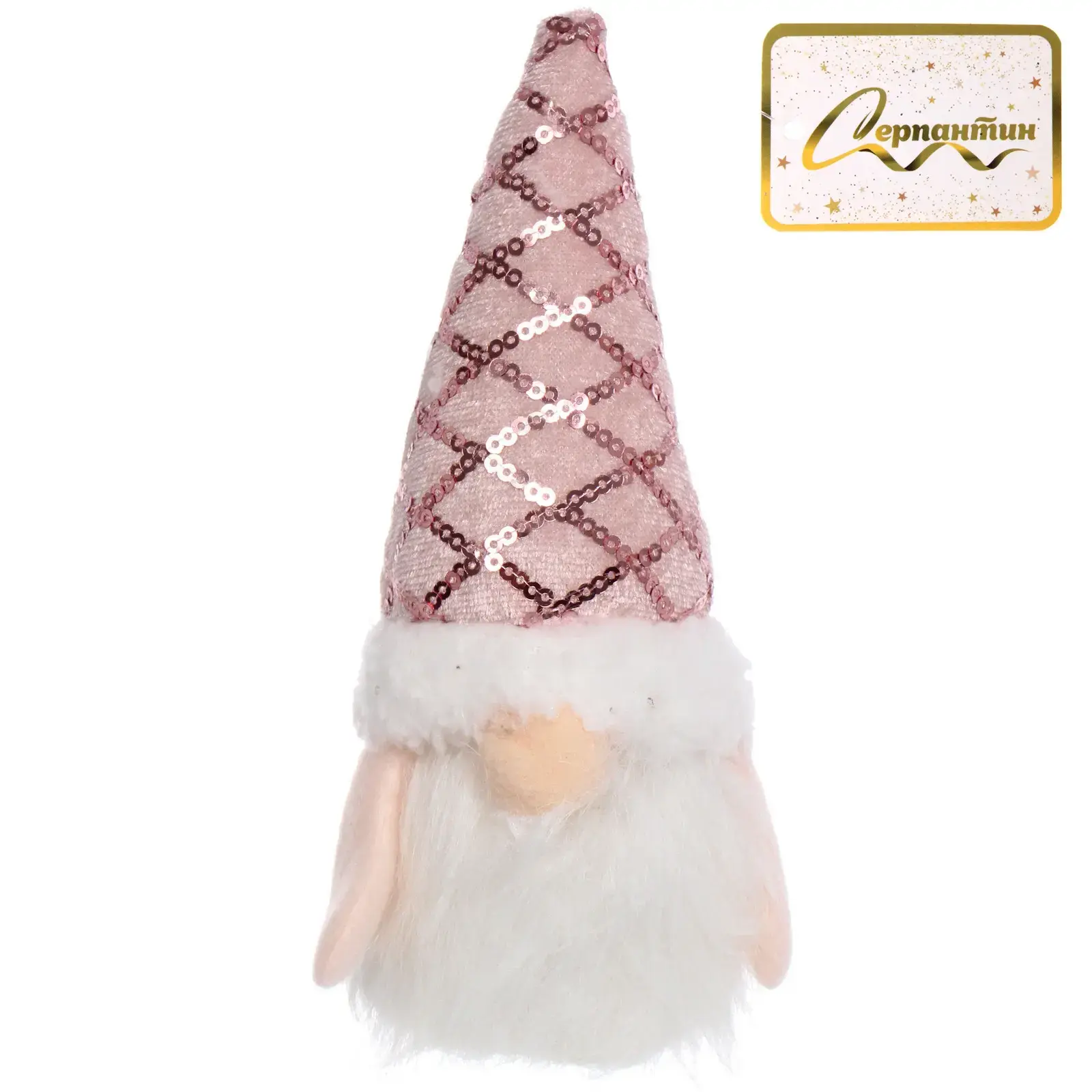 Розовая шапка с блестками и ромбовидным узором сочетается с белоснежной бородой из мягкого текстиля. Пластиковое основание обеспечивает устойчивость, а ручная проработка деталей делает фигурку узнаваемым элементом декора.