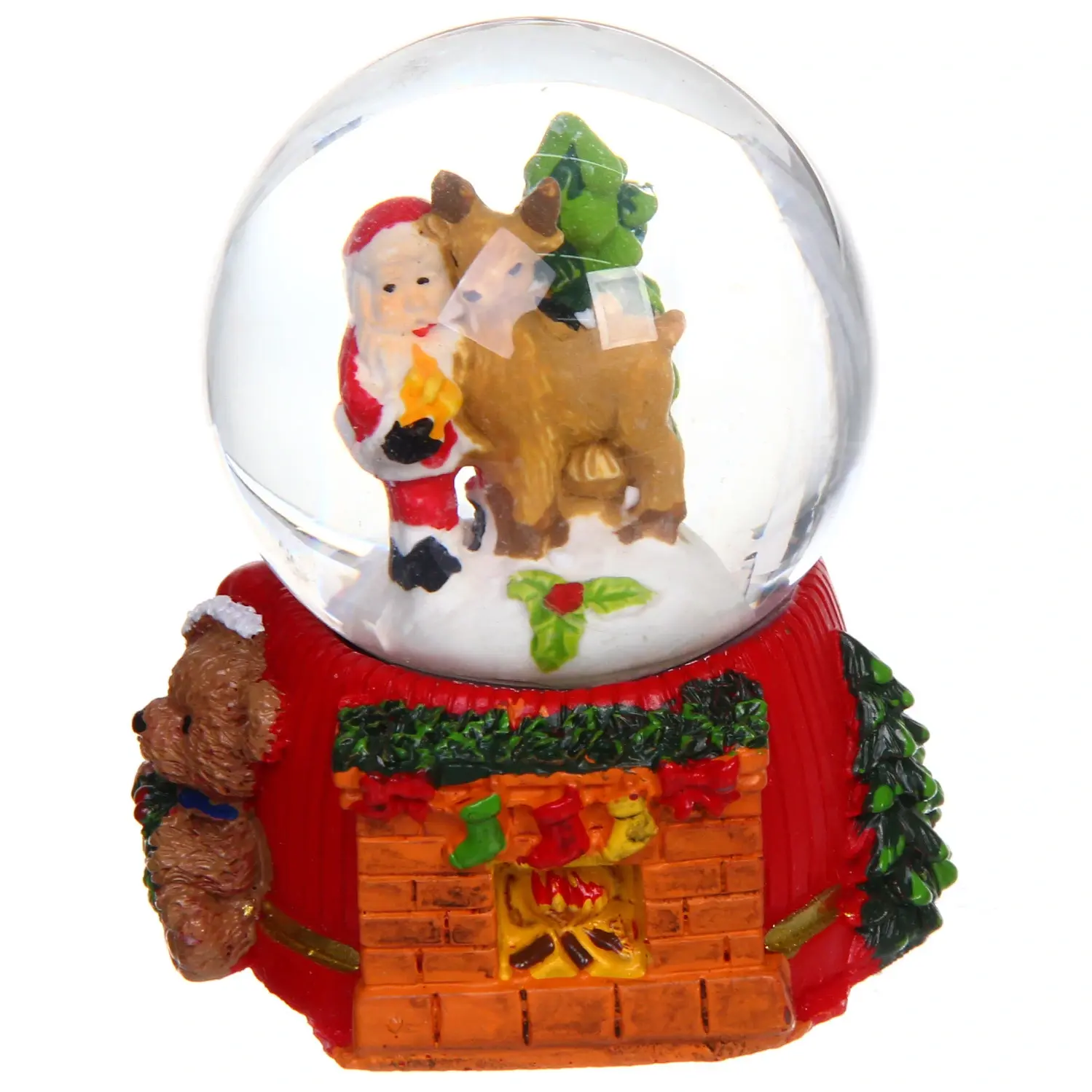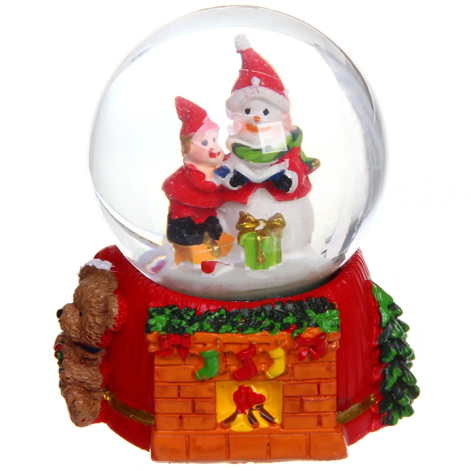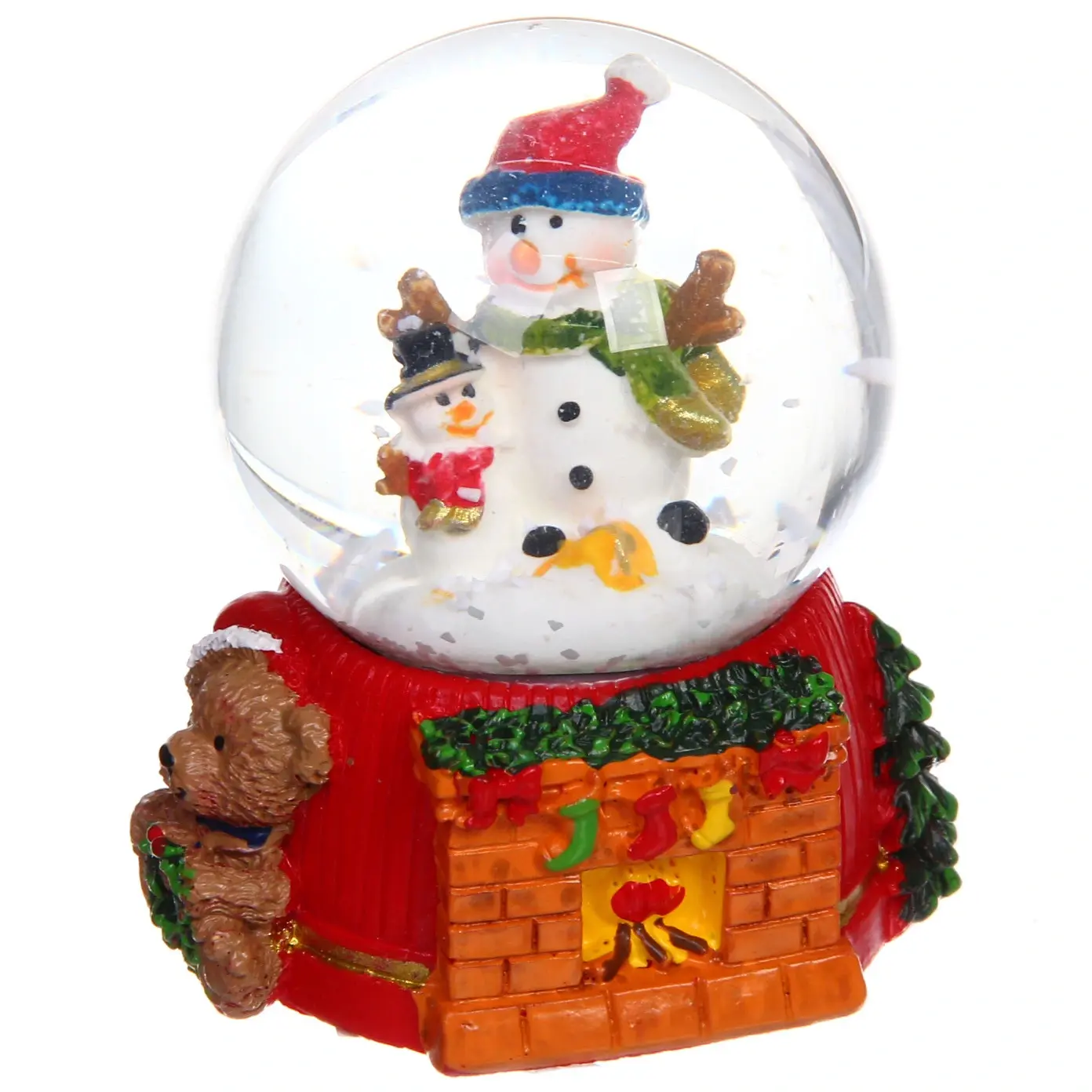 Этот снежный шар предназначен для праздничных интерьеров, подарков и новогодних композиции. Он подходит как для дома, так и для офиса, добавляя зимний стиль и настроение. Внутри расположены фигуры персонажей — снеговики, Санта-Клаусы, олени и другие тематические элементы, выполненные из полистоуна и стекла. Основание — декоративное, выполнено из пластика или полимера, с элементами украшения в зимней тематике.