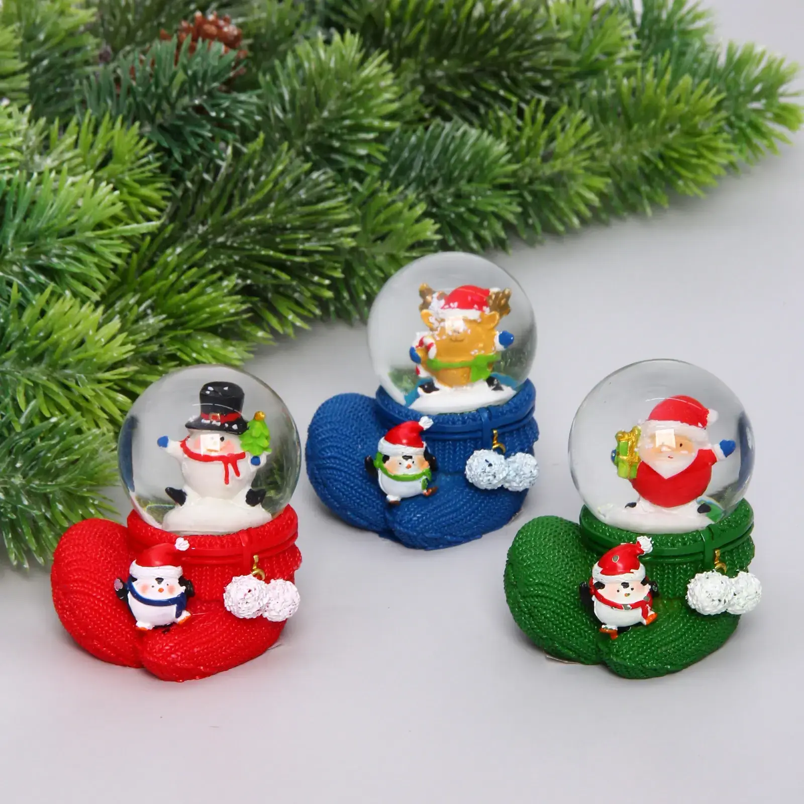 Каждый шар украшен уникальной фигуркой — снеговиком или Санта-Клаусом, что делает его особенным. Декоративная подставка в виде ботинка (высота 7,5 см) выполнена из текстильного материала с текстурной поверхностью, что добавляет изделию элегантности. Прочный полистоун и стекло гарантируют долговечность и надежность.