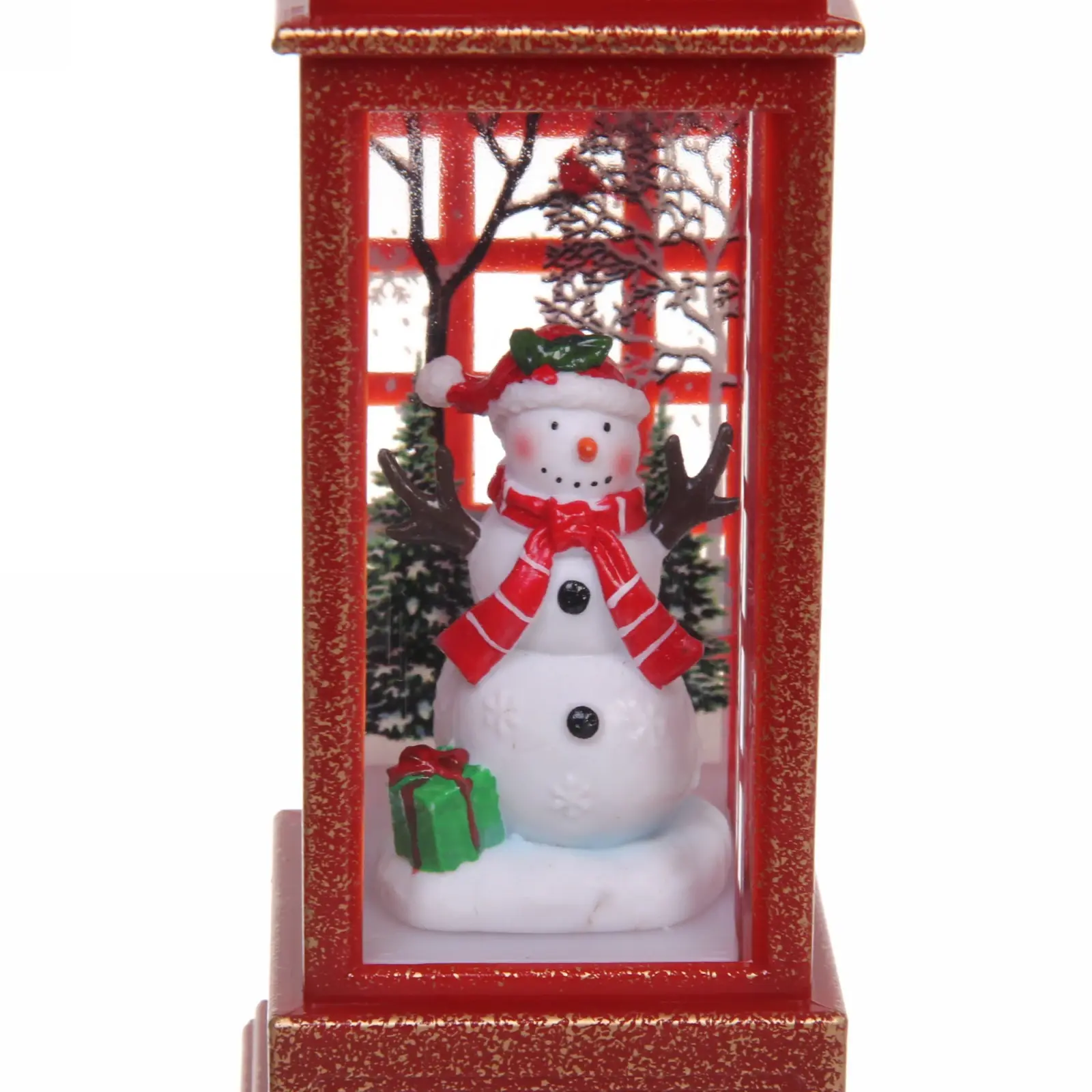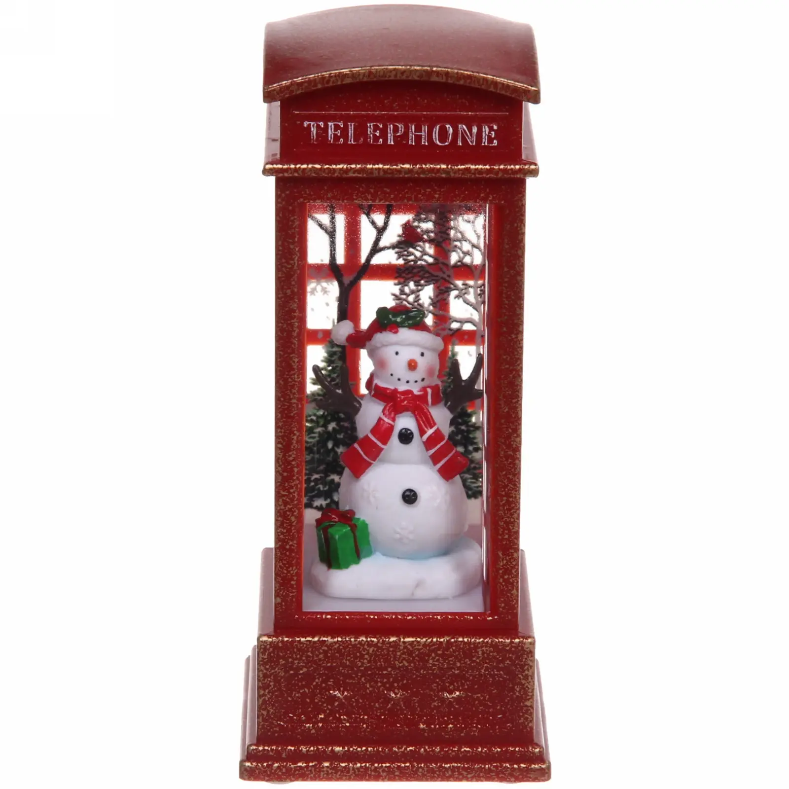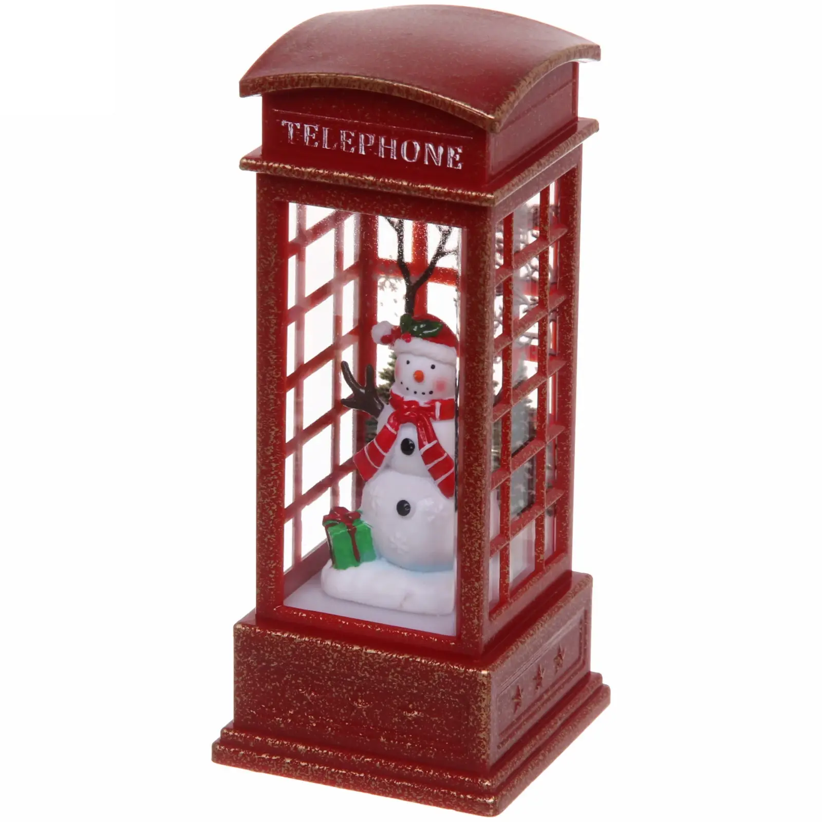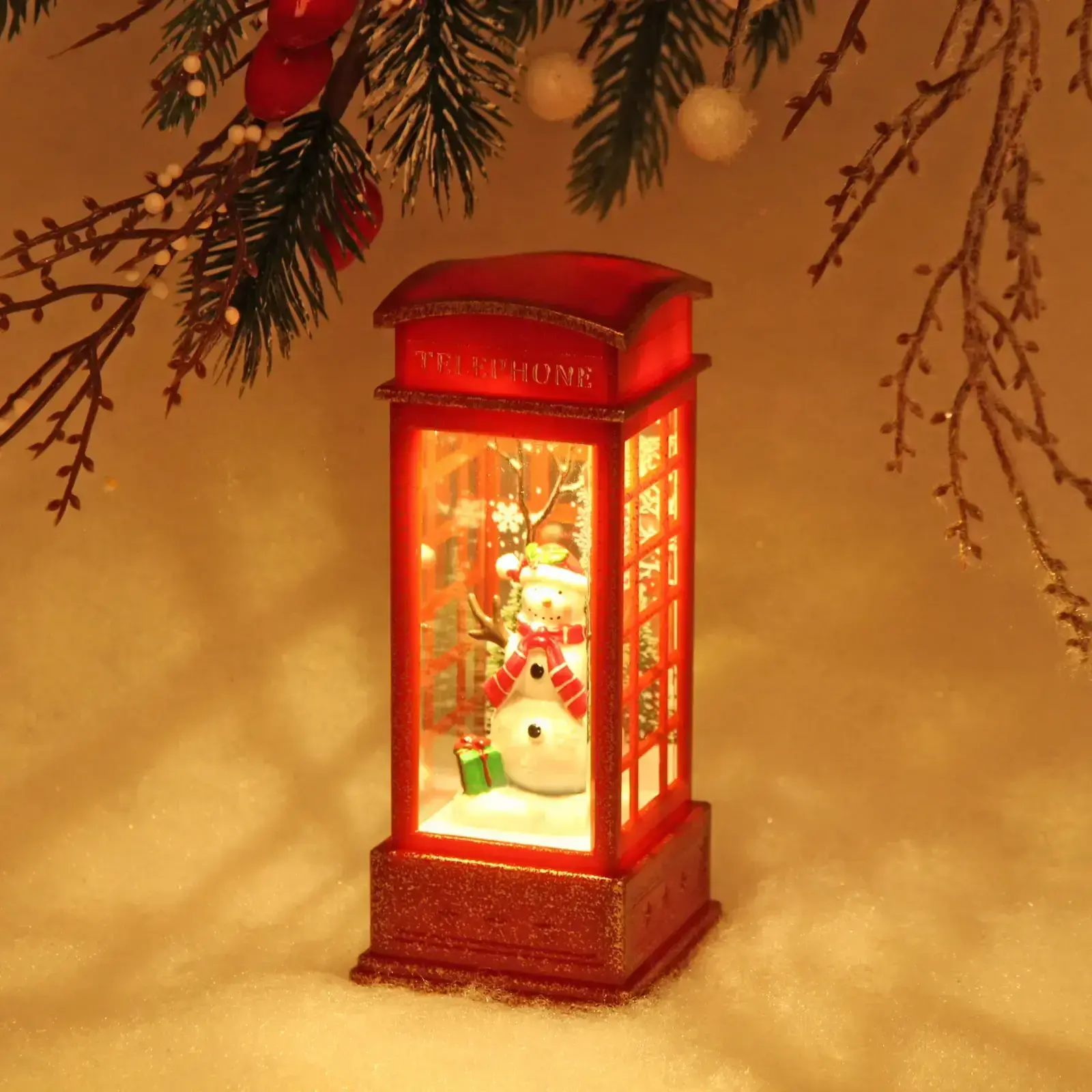 Погрузитесь в уютное новогоднее настроение с декоративной телефонной будкой. Мягкое свечение и очаровательный снеговик внутри создают идеальную праздничную композицию.