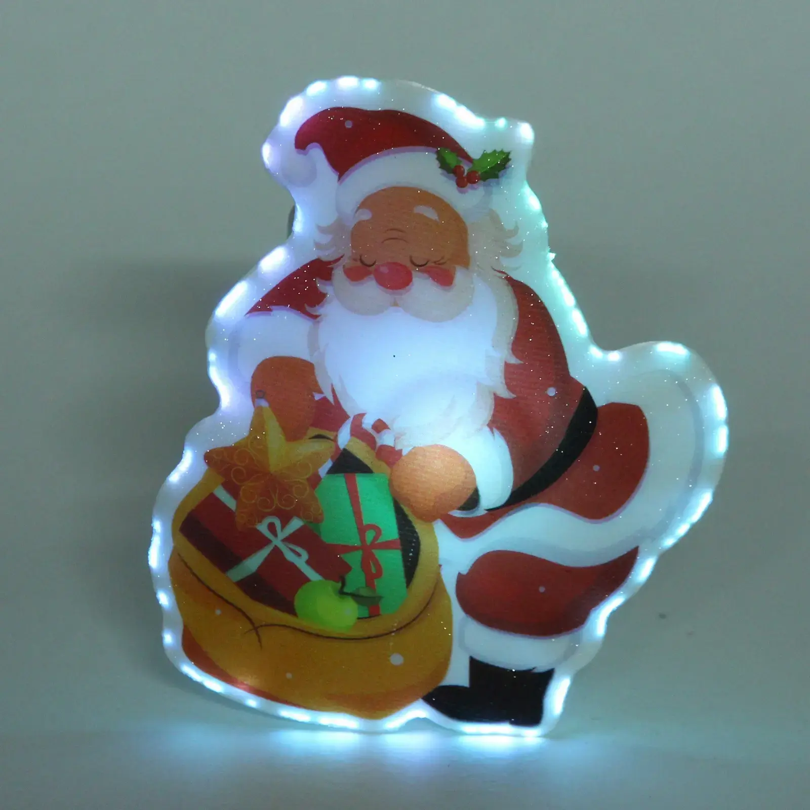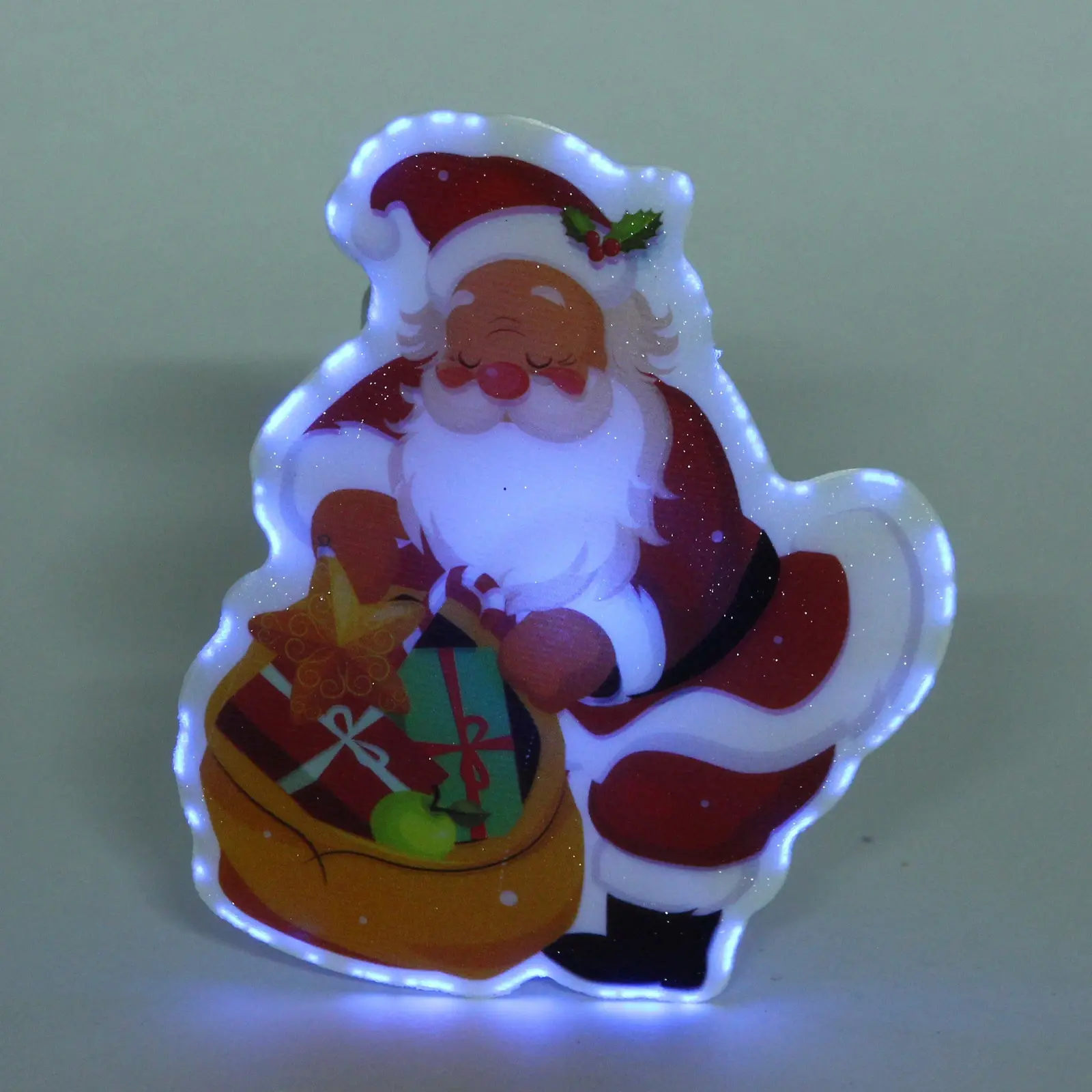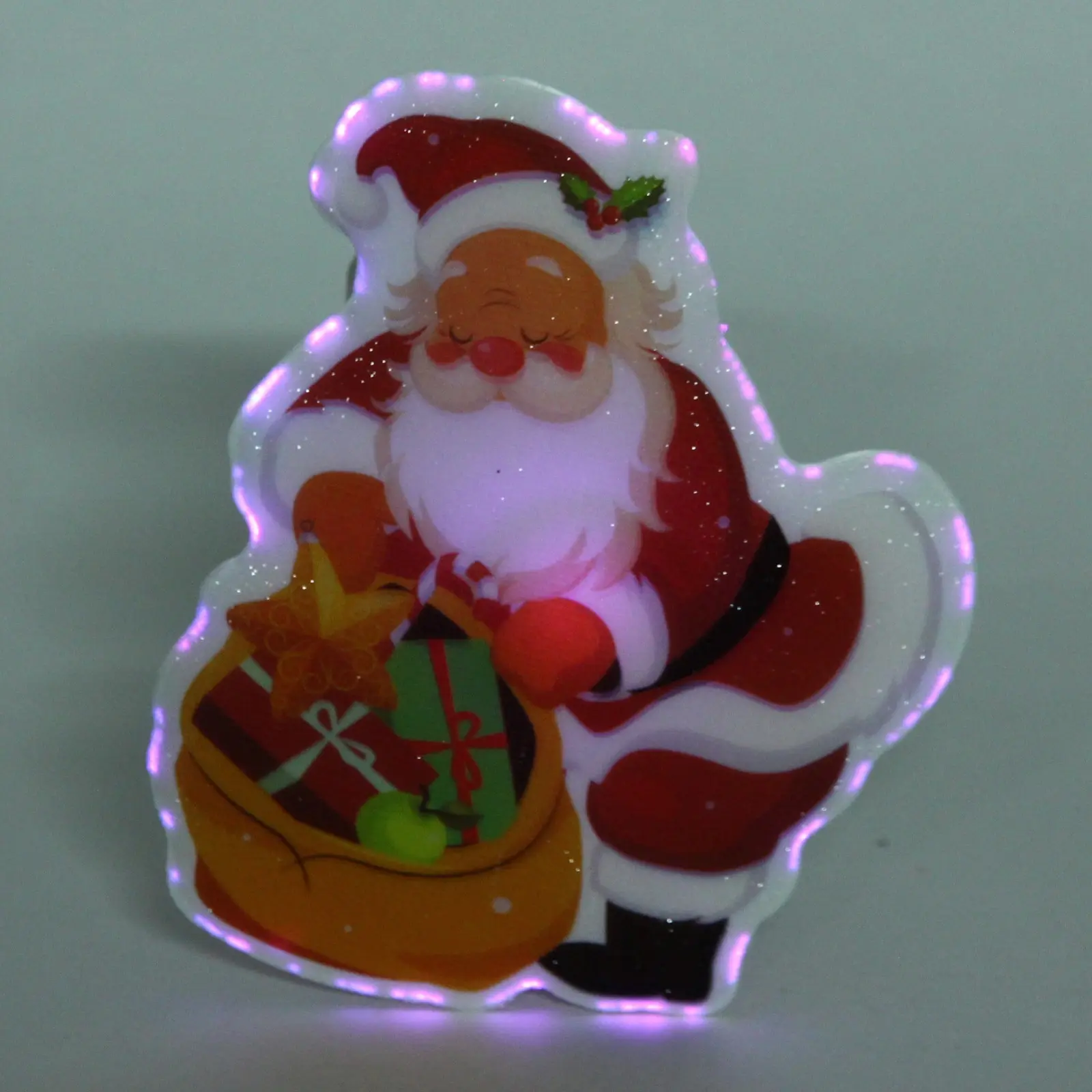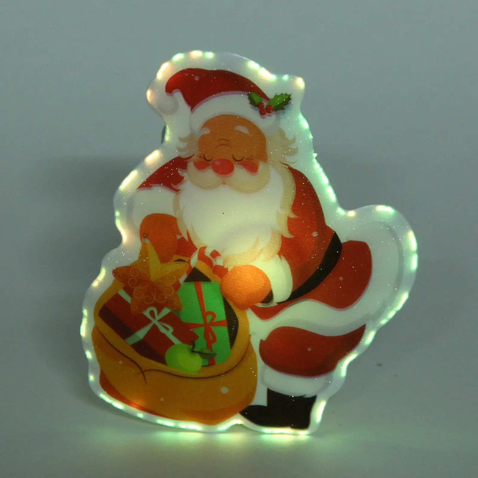 Светильник выполнен в форме Санта-Клауса, который держит мешок с подарками. Он идеально подходит для использования в качестве настольного украшения или для создания праздничного настроения в любом уголке вашего дома. Благодаря яркой подсветке, которая меняет цвет, светильник привлекает внимание и создает волшебное свечение, которое будет радовать вас и ваших гостей.