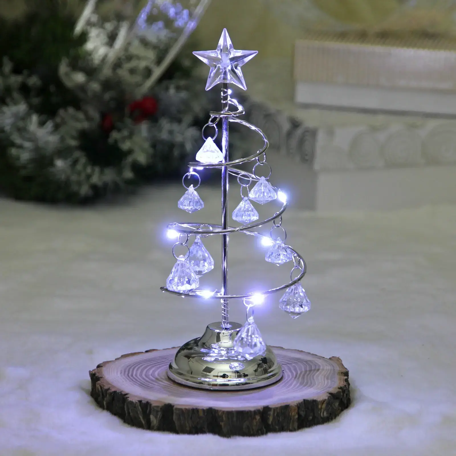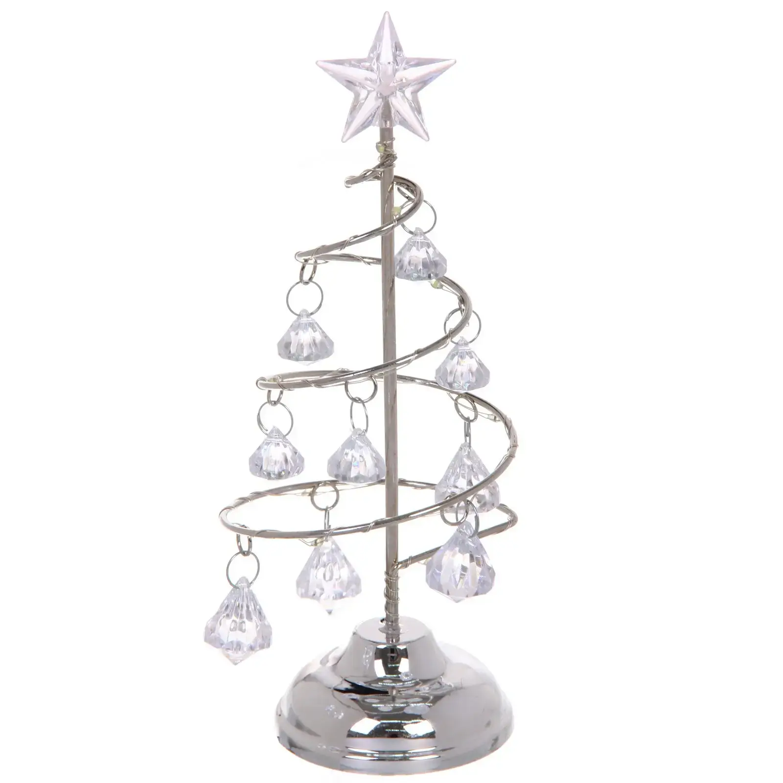 Новогоднее украшение выполнено в виде спиральной елочки с прозрачными кристаллическими подвесками. Металлическое основание с хромированным покрытием придает изделию элегантный вид и обеспечивает устойчивость. Верхушка украшена звездой из прозрачного материала.