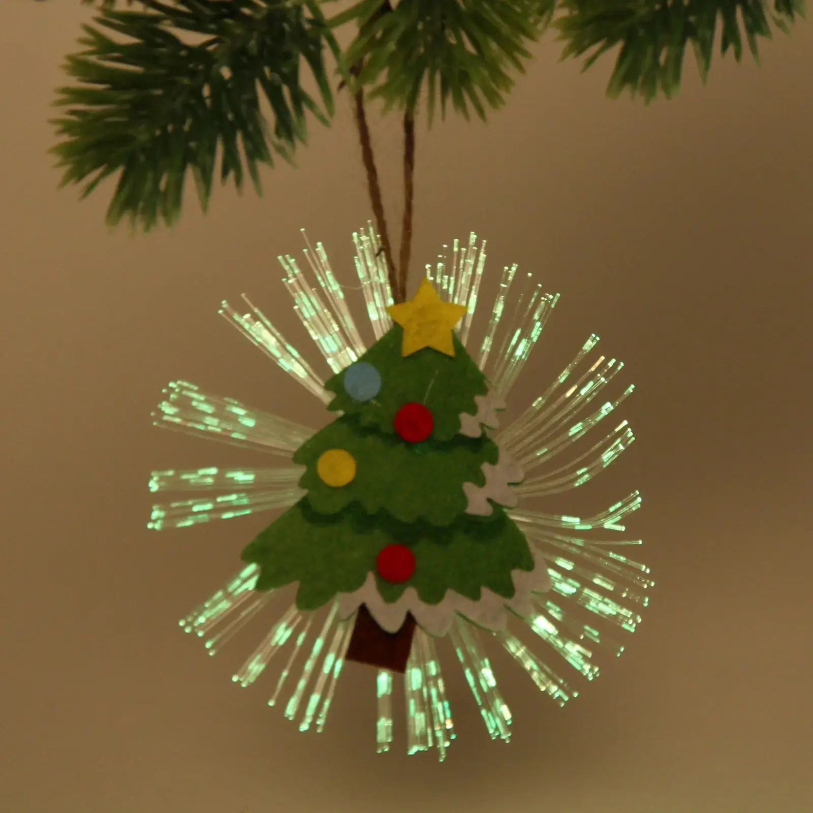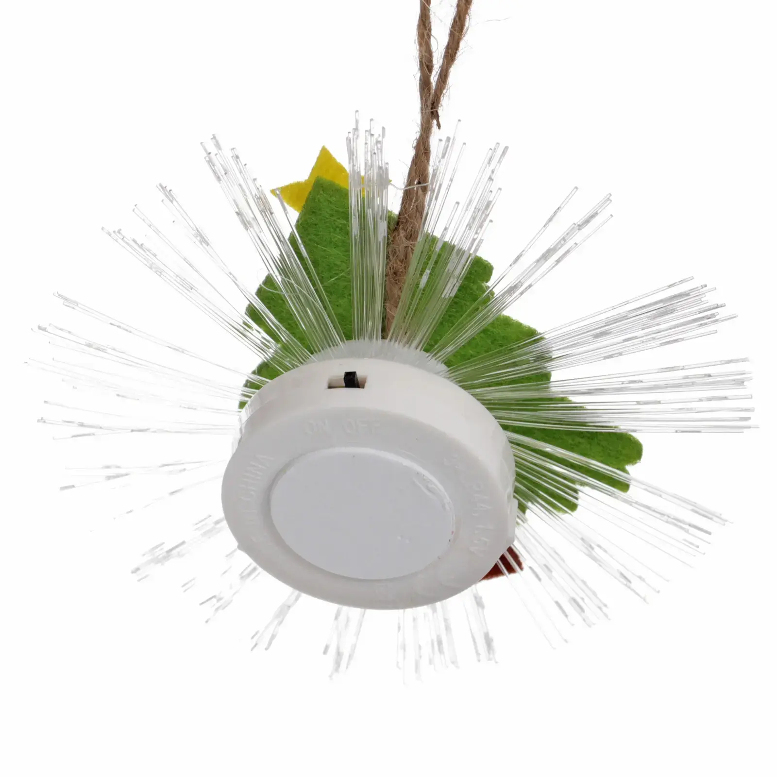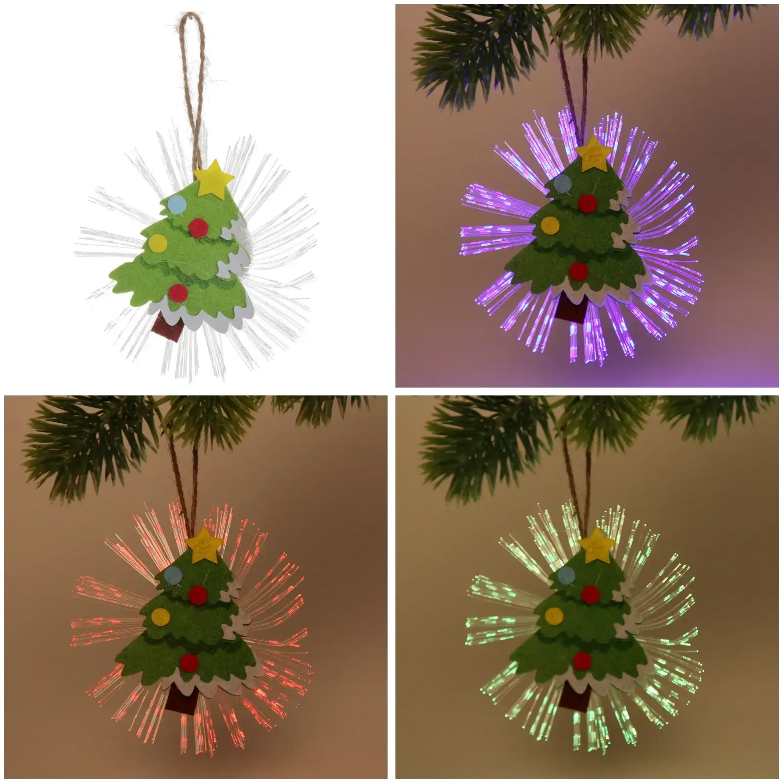 Этот сувенир выделяется среди других новогодних украшений благодаря своей уникальной форме и ярким цветам. Елочка украшена разноцветными элементами, которые делают её привлекательной и запоминающейся. Она выполнена из фетра и пластика, что обеспечивает долговечность и лёгкость в уходе. Подсветка работает от батареек, что делает её удобной в использовании.