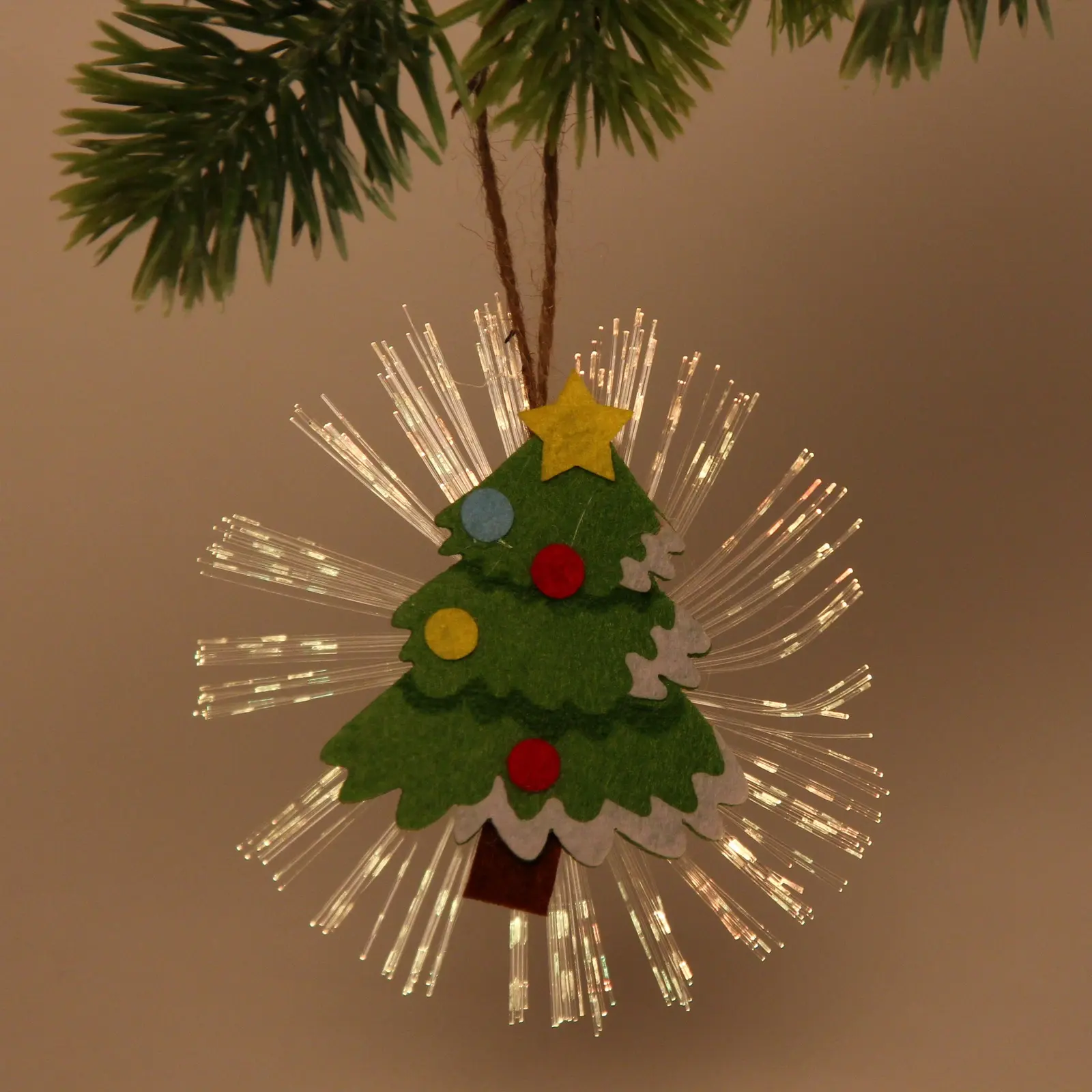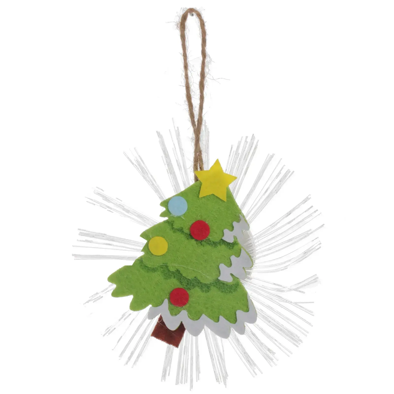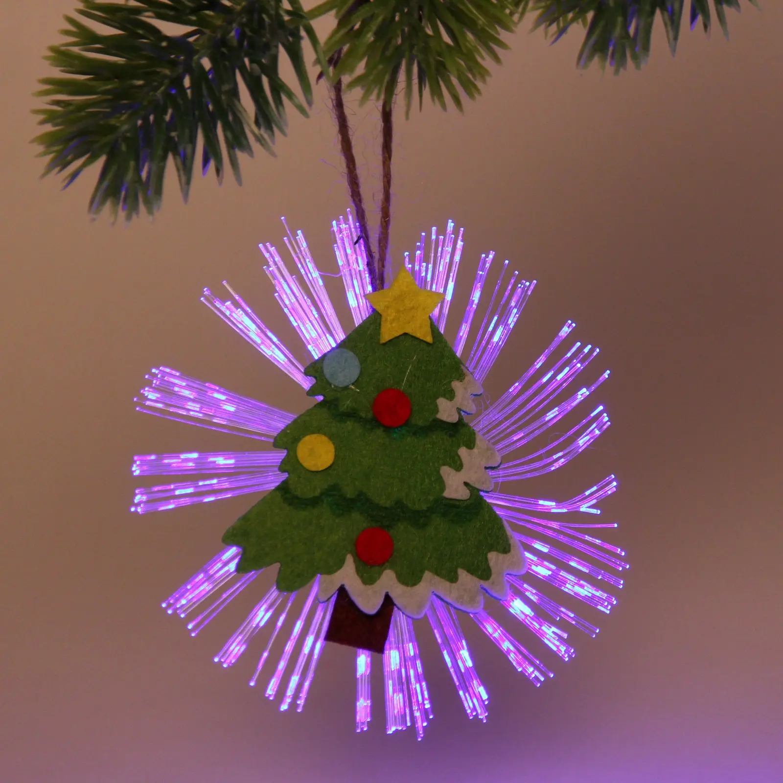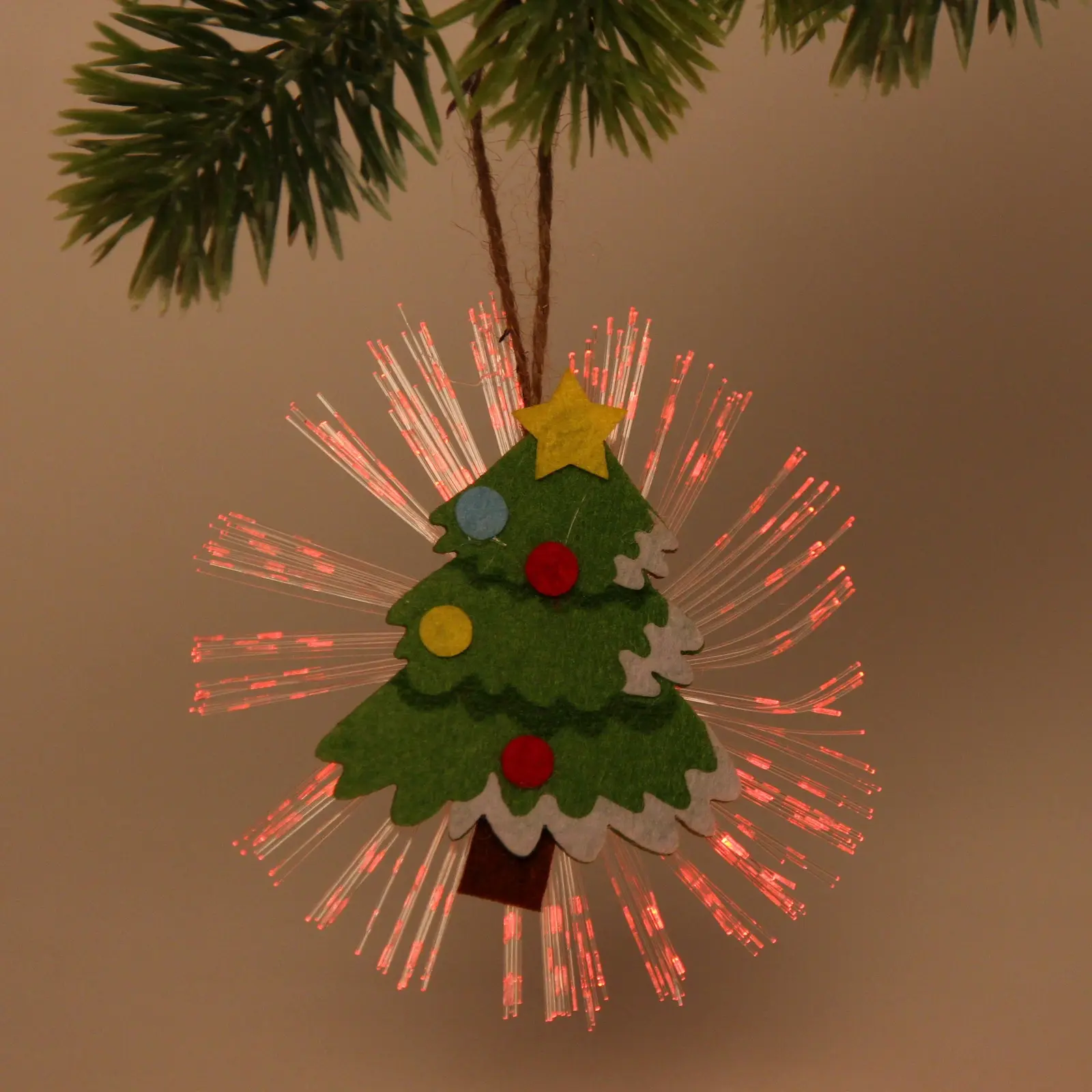 Этот сувенир выделяется среди других новогодних украшений благодаря своей уникальной форме и ярким цветам. Елочка украшена разноцветными элементами, которые делают её привлекательной и запоминающейся. Она выполнена из фетра и пластика, что обеспечивает долговечность и лёгкость в уходе. Подсветка работает от батареек, что делает её удобной в использовании.