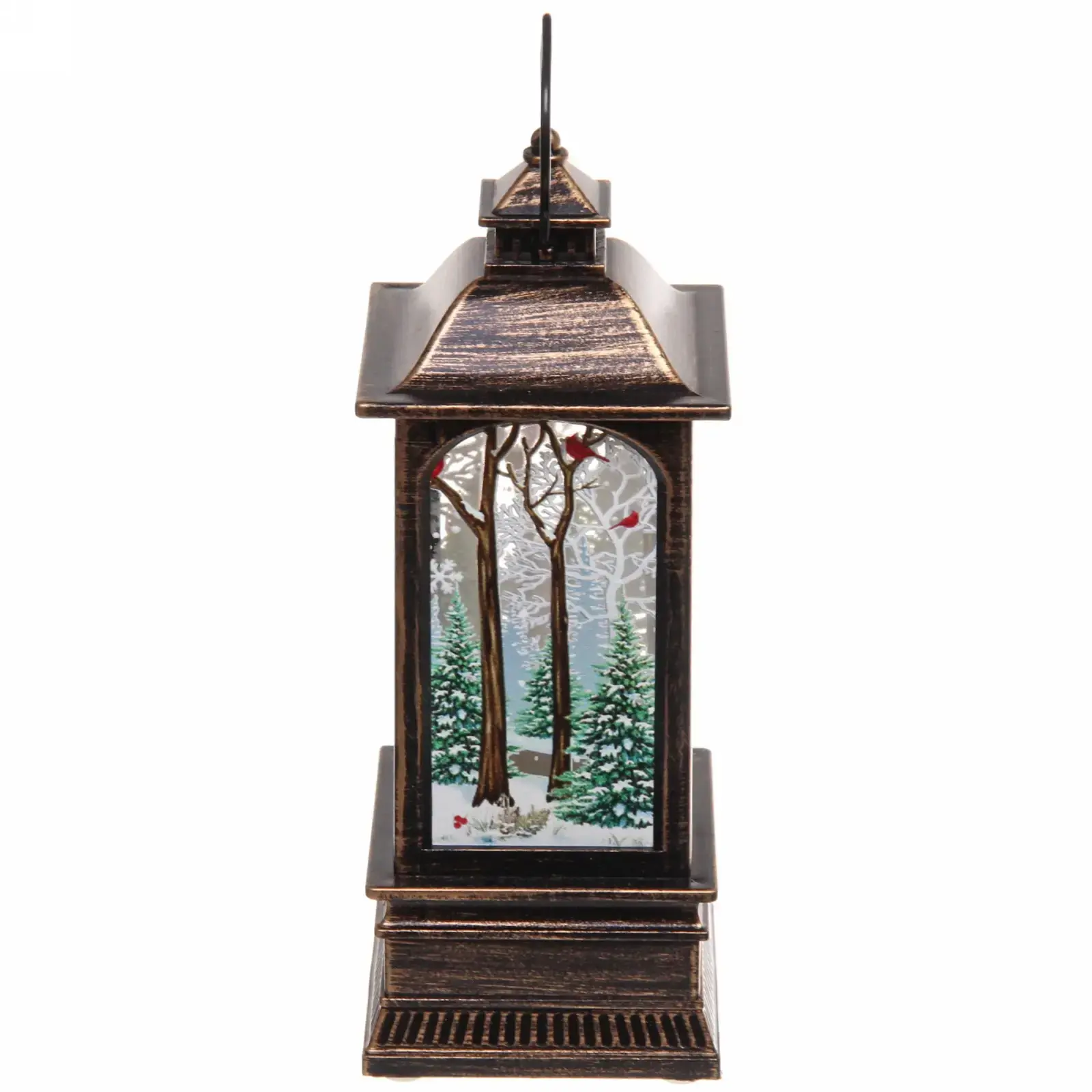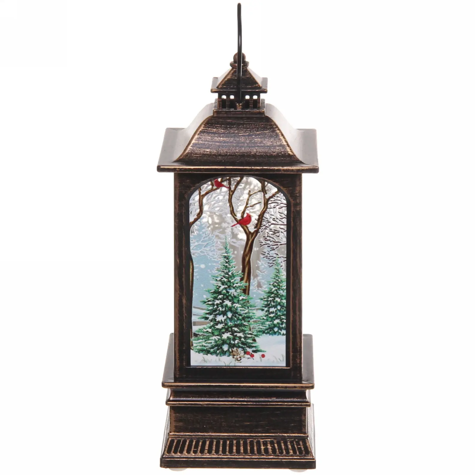 Фонарь предназначен для декоративного использования, идеально подходит для создания праздничного настроения в вашем доме. Он может быть использован как настольный декор или подвешен, благодаря удобной ручке на верхней части. Внутри фонаря изображен Дед Мороз в красной одежде, окруженный зимним пейзажем, что добавляет волшебства в атмосферу праздника.