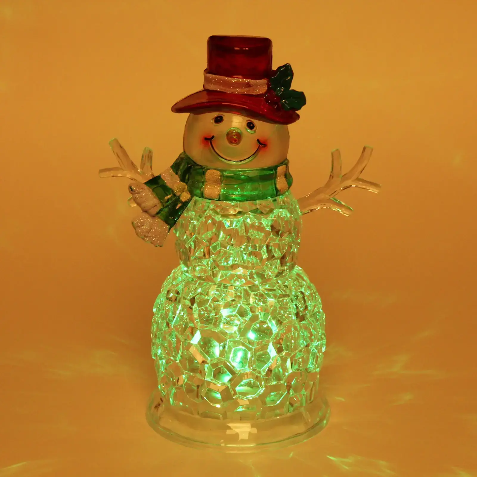 Фигурка выполнена из прочного пластика, который имитирует хрустальную текстуру. Благодаря встроенной подсветке снеговик излучает яркий свет различных оттенков: голубой, фиолетовый, розовый — что создаёт неповторимую праздничную атмосферу.