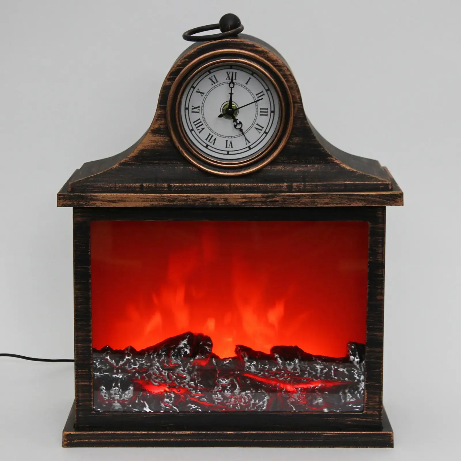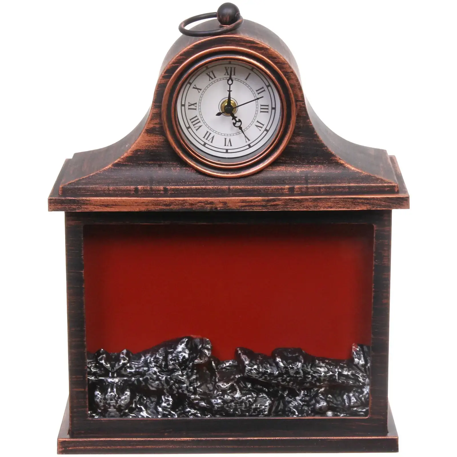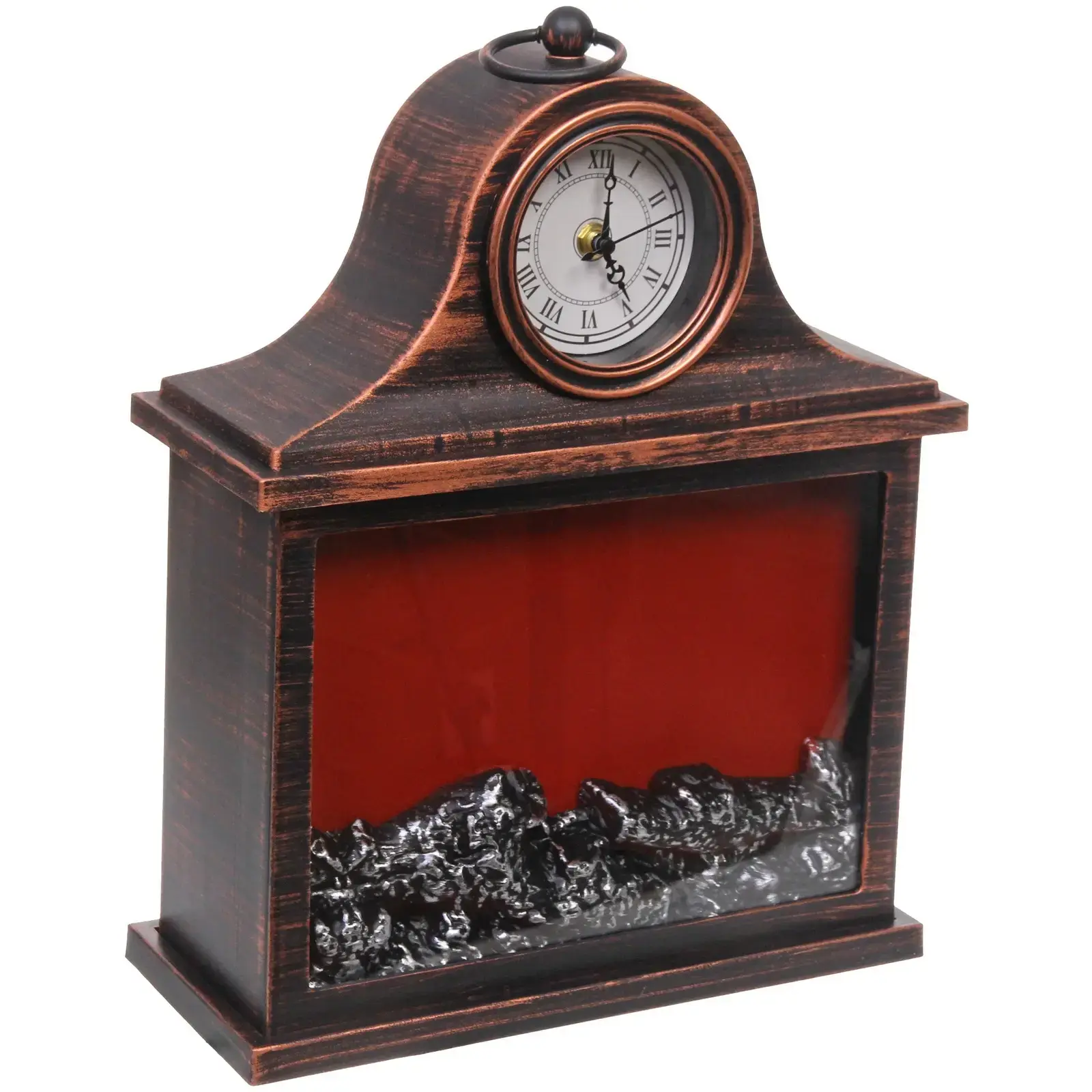 Сувенир имеет деревянный корпус темного цвета с металлическими элементами, что придает ему винтажный вид. В верхней части расположены круглые часы с римскими цифрами, а в центре — стеклянная панель с имитацией огня красного и оранжевого цветов. Внизу под панелью видна текстура, имитирующая дрова или камни, что добавляет реалистичности. Устройство легко подключается к сети с помощью шнура, который удобно прячется, если вы используете батарейки.