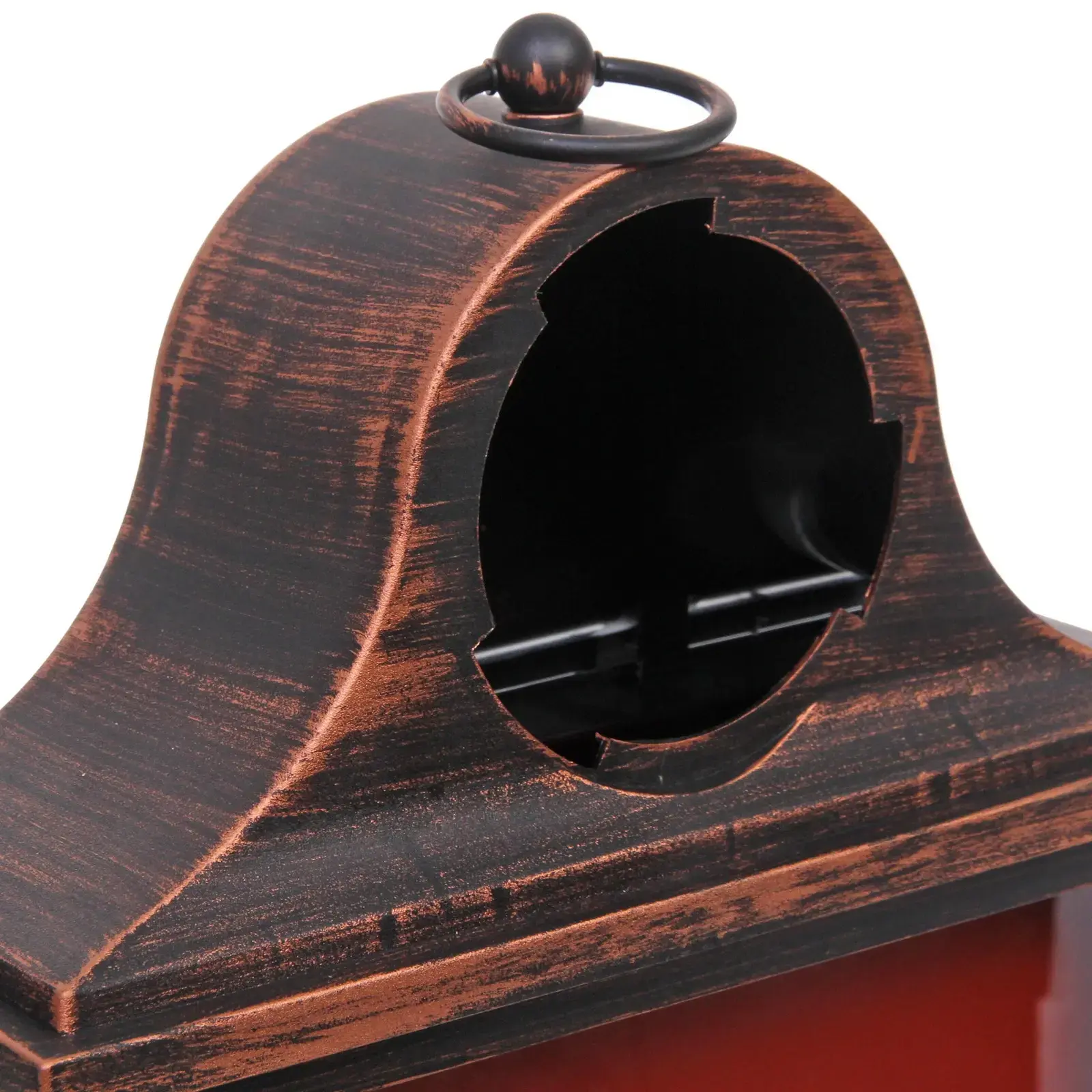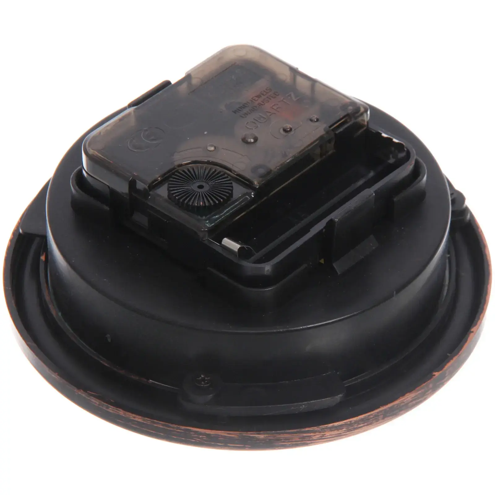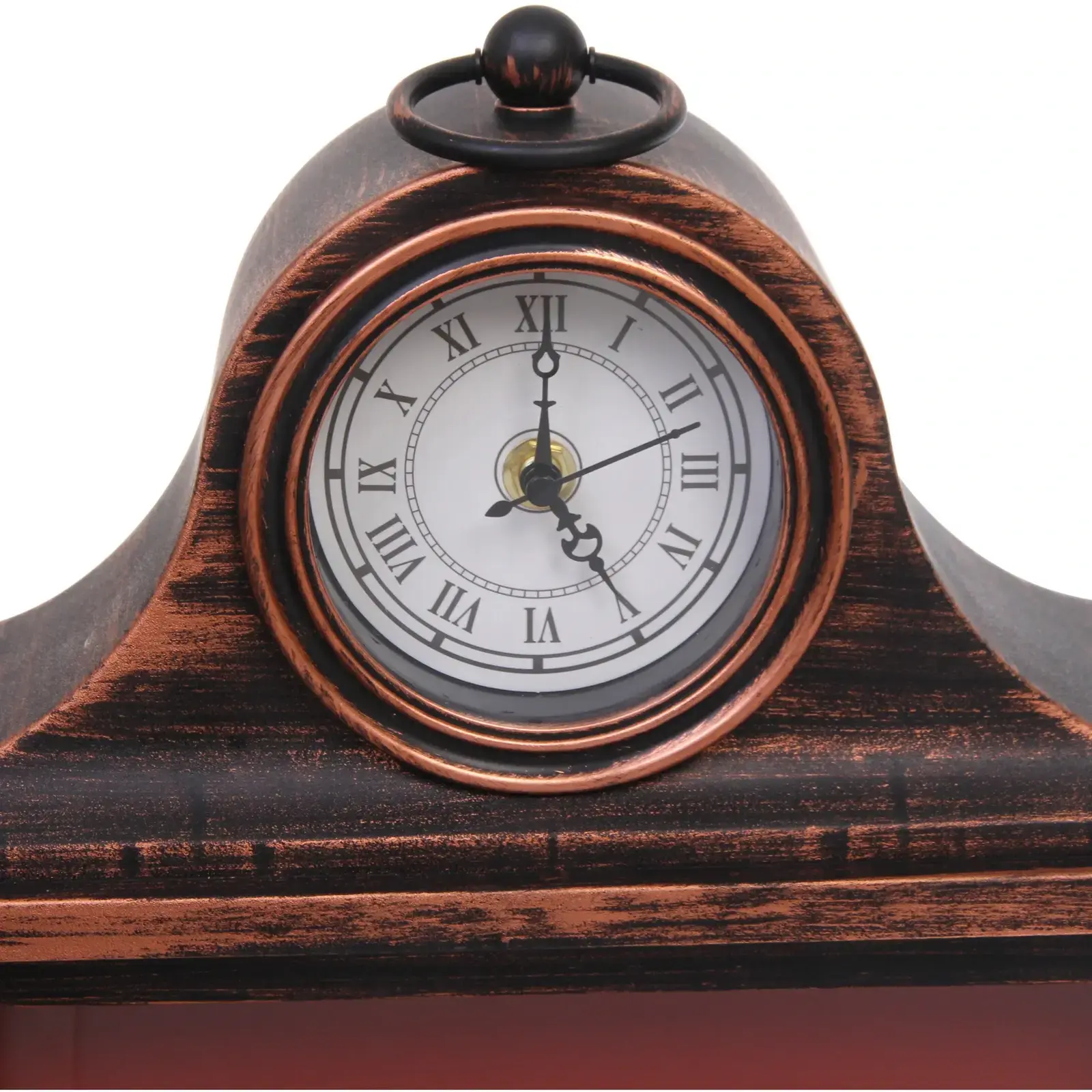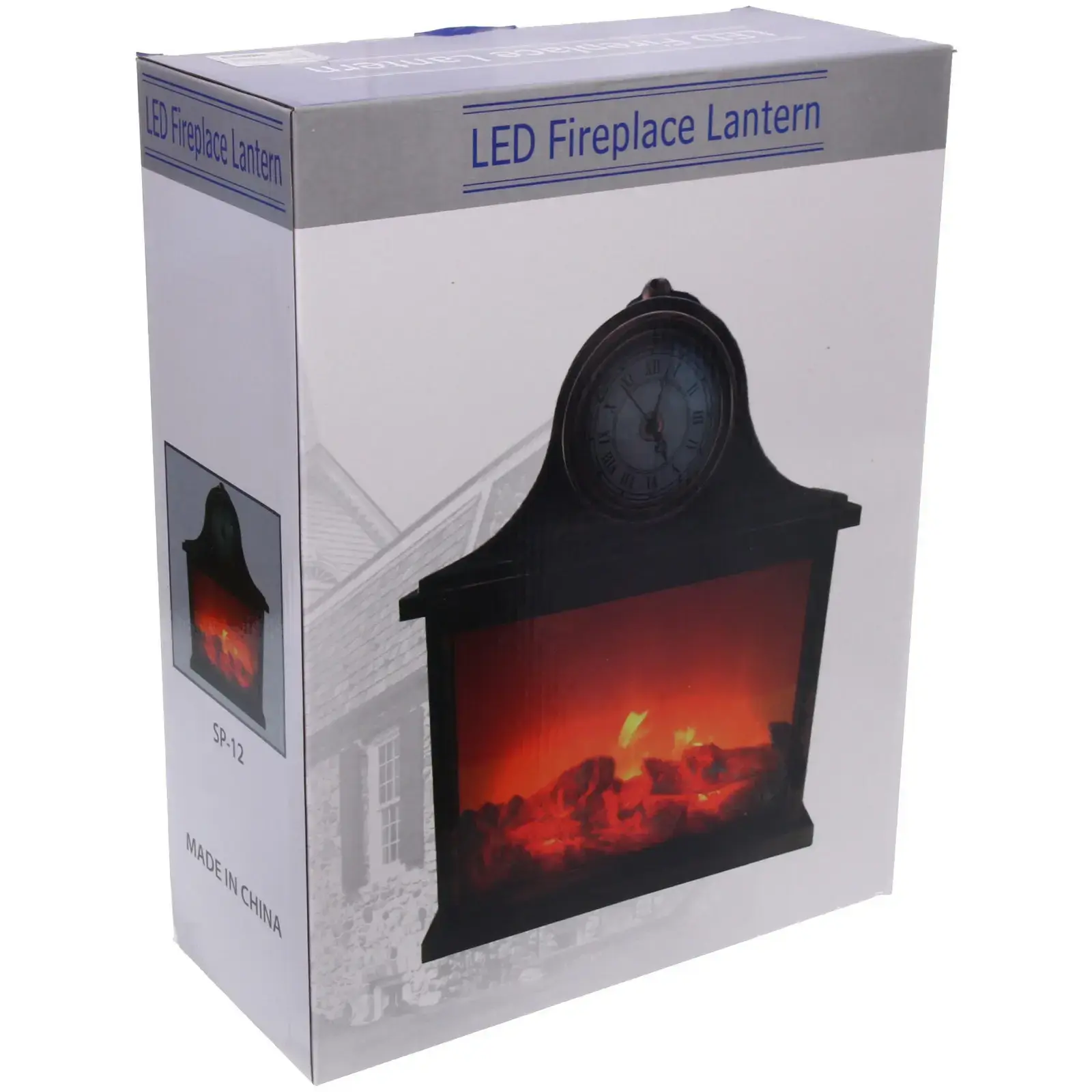 Сувенир имеет деревянный корпус темного цвета с металлическими элементами, что придает ему винтажный вид. В верхней части расположены круглые часы с римскими цифрами, а в центре — стеклянная панель с имитацией огня красного и оранжевого цветов. Внизу под панелью видна текстура, имитирующая дрова или камни, что добавляет реалистичности. Устройство легко подключается к сети с помощью шнура, который удобно прячется, если вы используете батарейки.