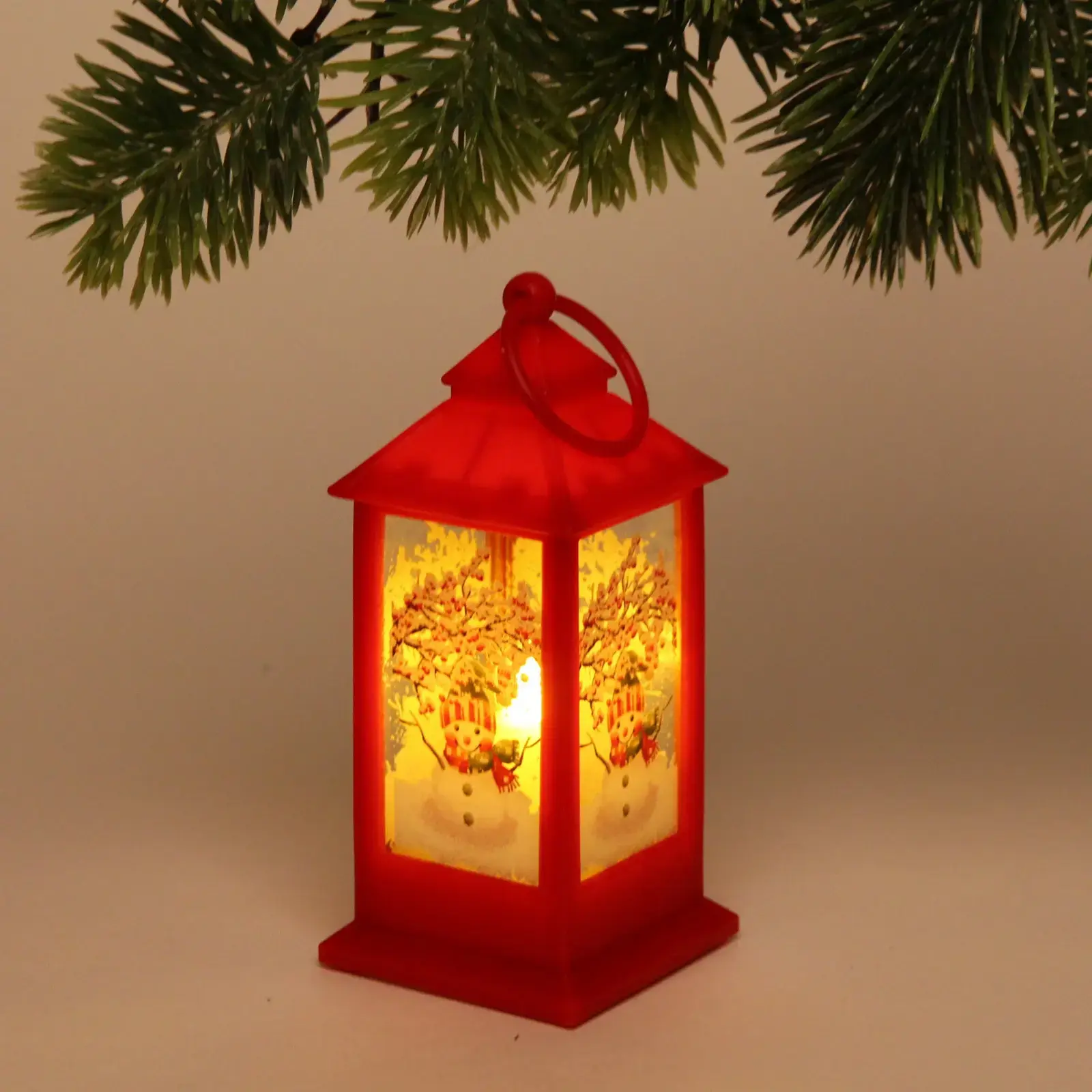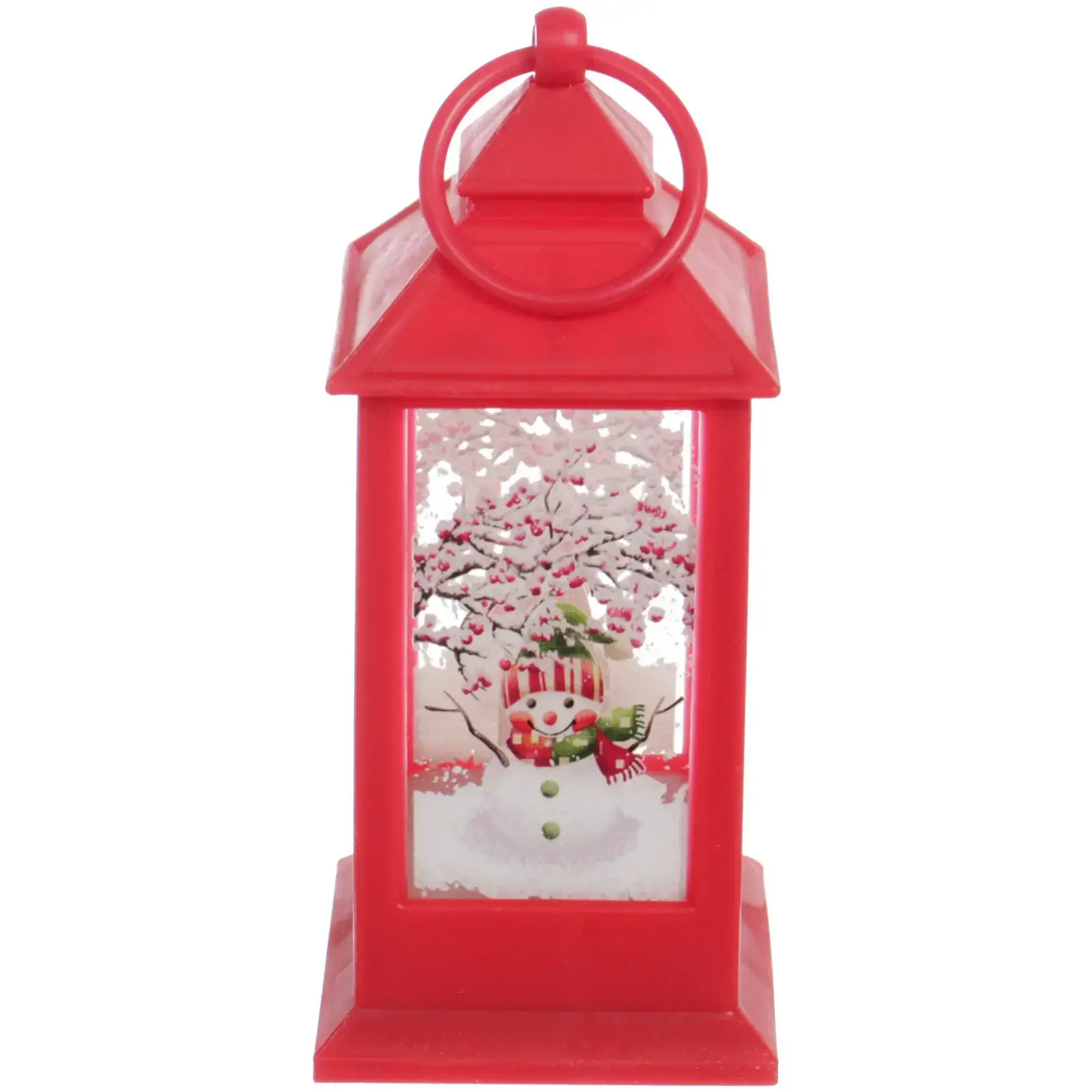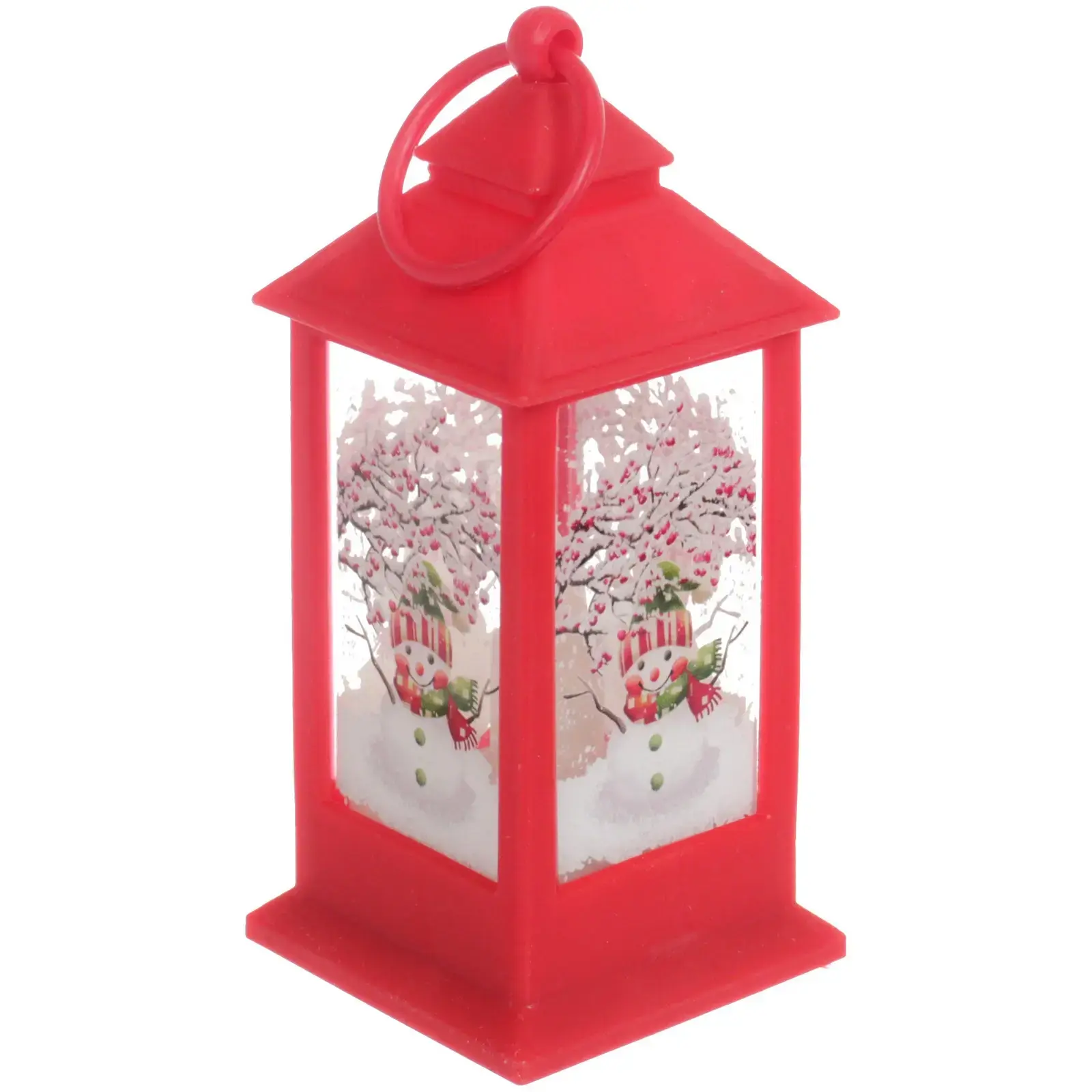 Фонарь выполнен из прочного пластика и металла, что обеспечивает его долговечность и устойчивость к внешним условиям. Внутри фонаря расположены два снеговика, одетых в шапки и шарфы, которые стоят на фоне снежного пейзажа. Этот элемент декора идеально подходит для использования в зимний период, особенно в преддверии Нового года и Рождества.