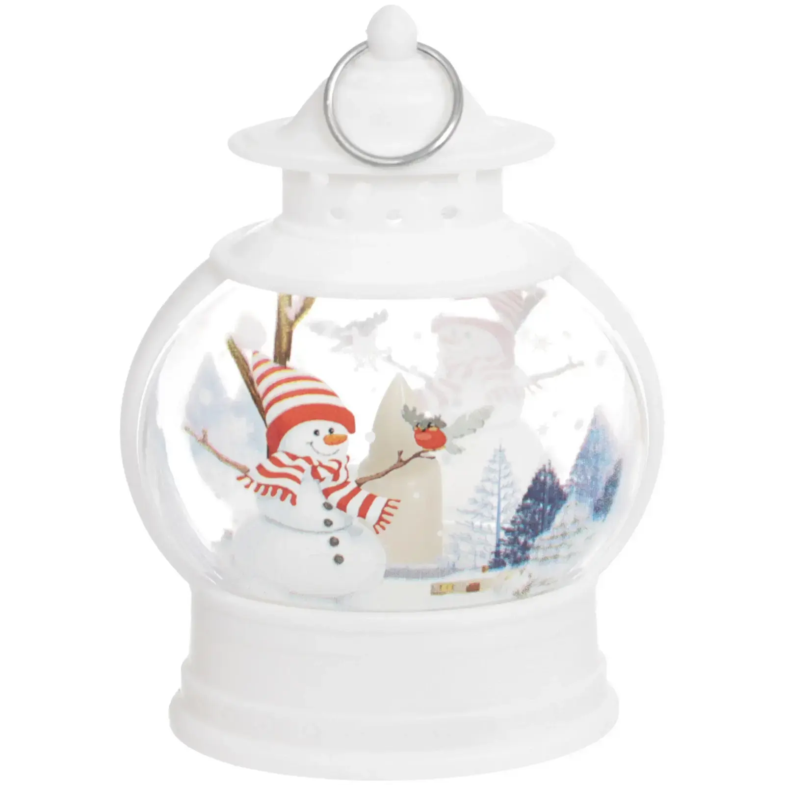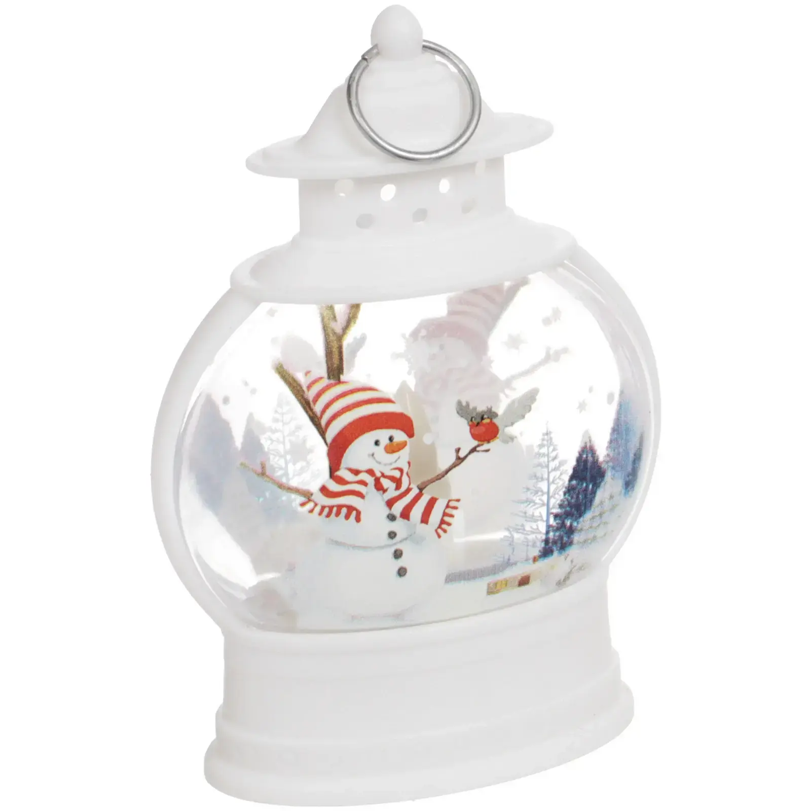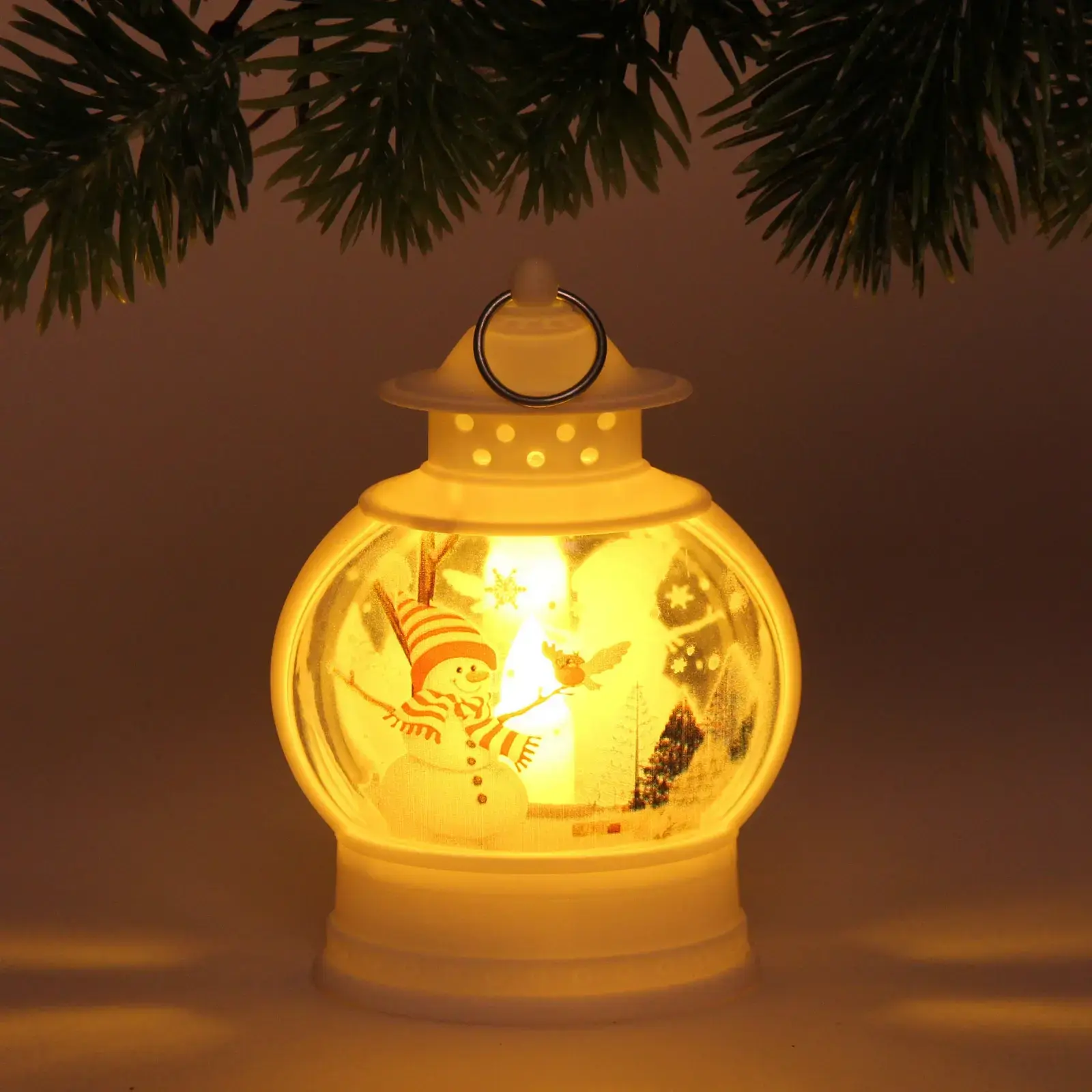 Светильник выполнен из качественных материалов: металл и пластик, что обеспечивает его долговечность и надёжность. Округлая форма и белый цвет делают его универсальным элементом декора, который легко впишется в любой интерьер. Внутри фонаря расположена фигурка снеговика, что добавляет ему уникальности и праздничного настроения.
