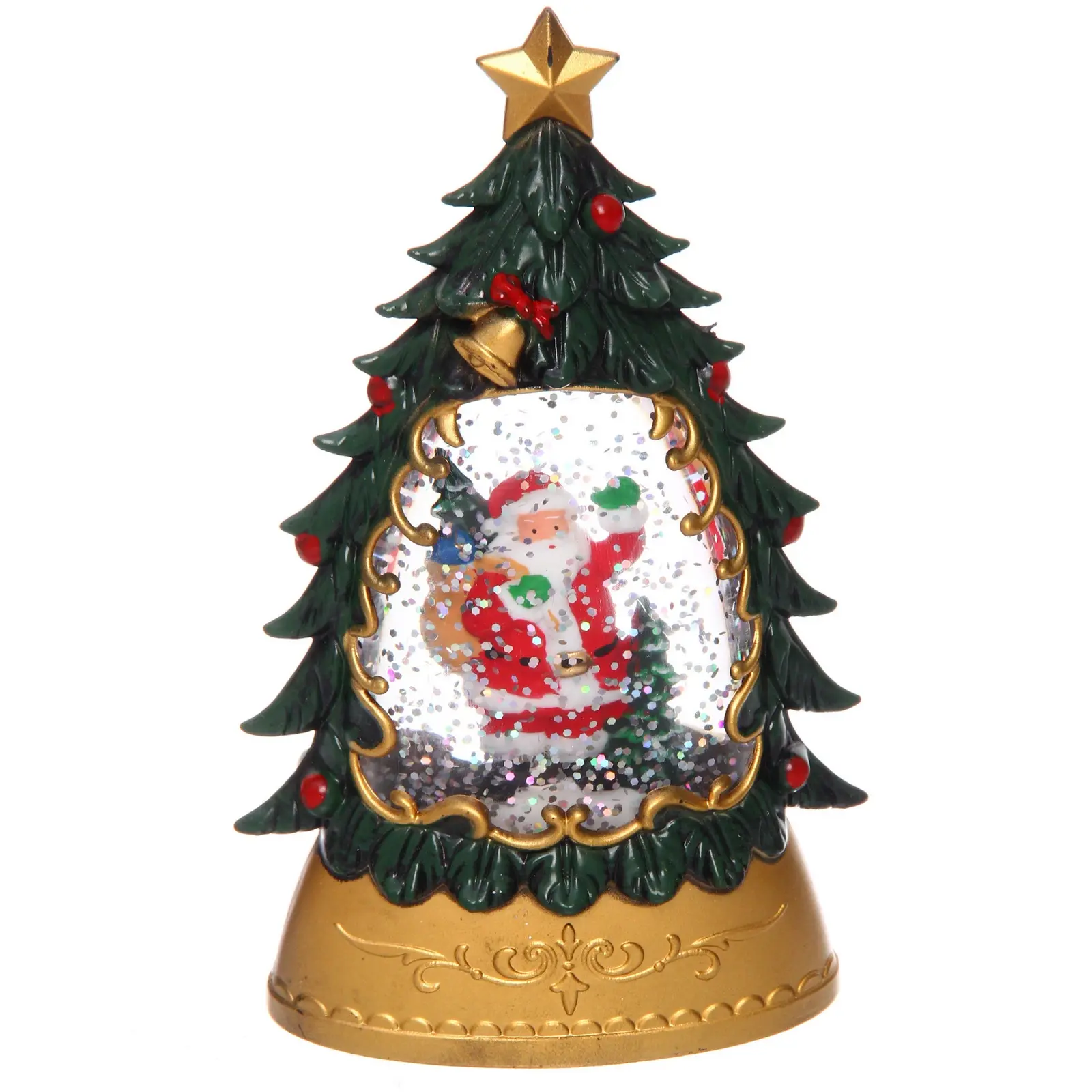 Изделие выполнено в виде стильной елочки с красными ягодами и золотой звездой, внутри которой находится фигурка Деда Мороза с мешком подарков. Золотистое основание с рельефным узором добавляет элегантности.