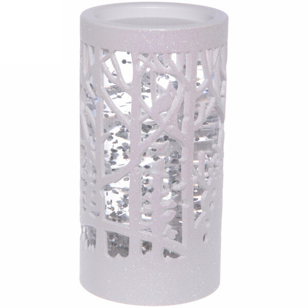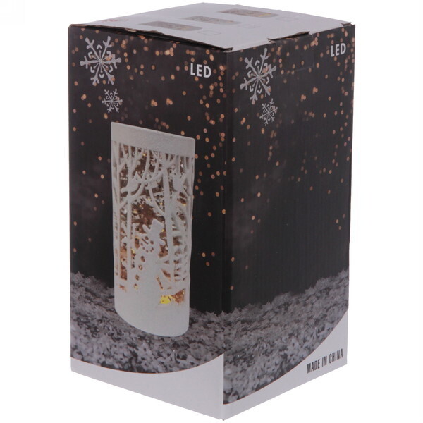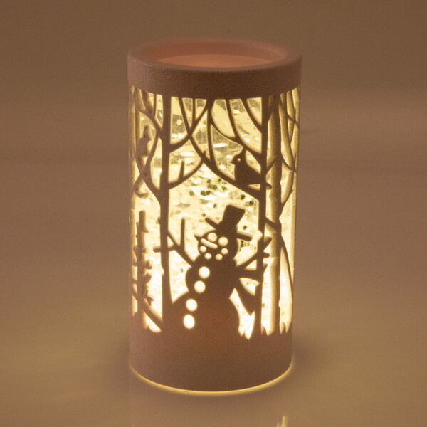 Светильник выполнен в форме цилиндра и украшен декоративными изображениями снежного человека и деревьев, что делает его универсальным для любого интерьера. Он идеально подходит для использования в гостиной, спальне или на праздничном столе. Просто включите его, и он создаст мягкое, приятное освещение, которое будет радовать вас и ваших близких.