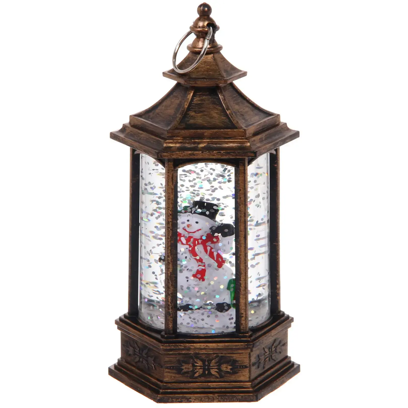 Светильник выполнен в виде фонаря с фигуркой снеговика внутри, что делает его универсальным для любого стиля интерьера. Он работает от трех батареек LR44, что обеспечивает его мобильность и возможность размещения в любом удобном месте. Размеры 5,5х13,8 см делают его компактным и легким для размещения на столе, полке или в качестве настольного украшения.