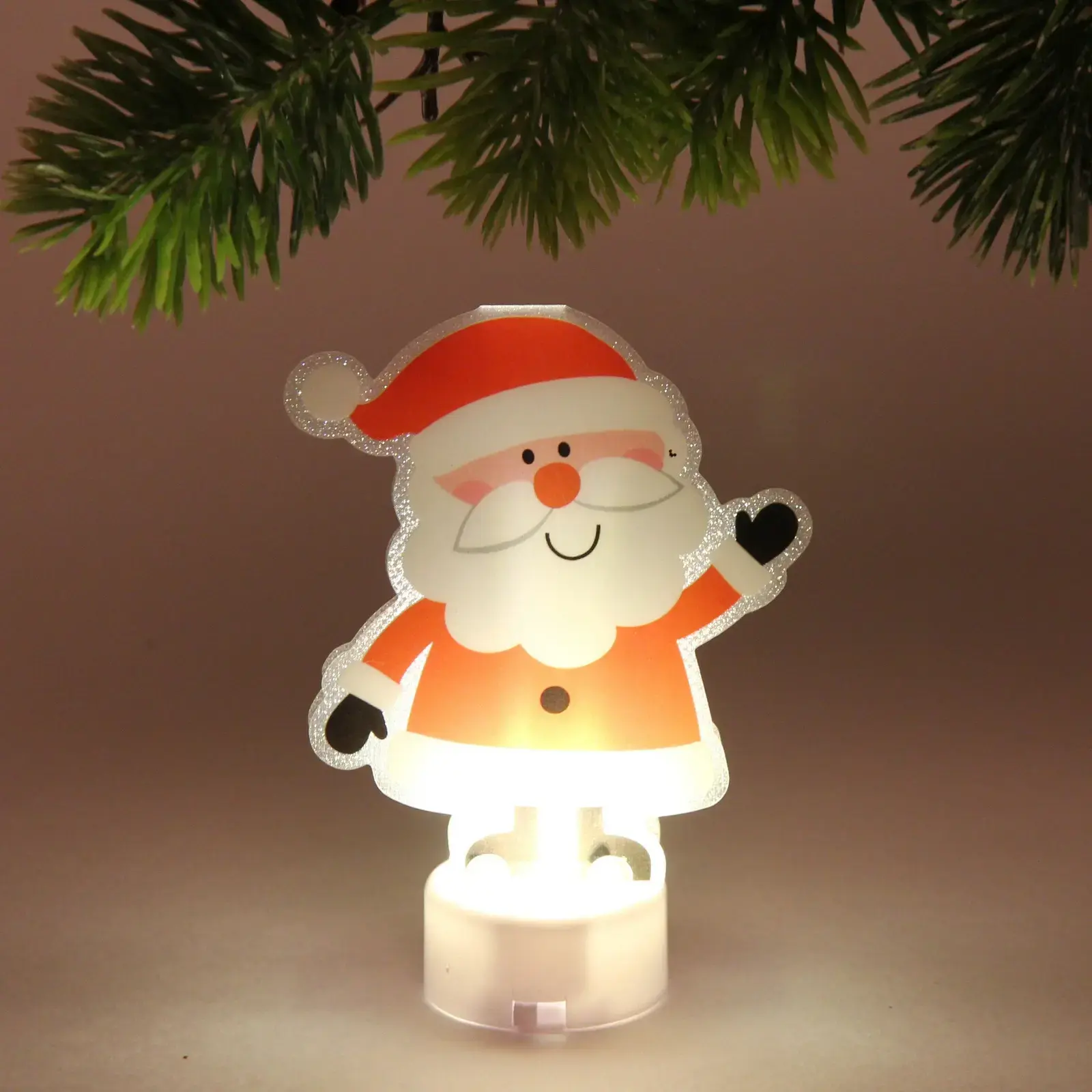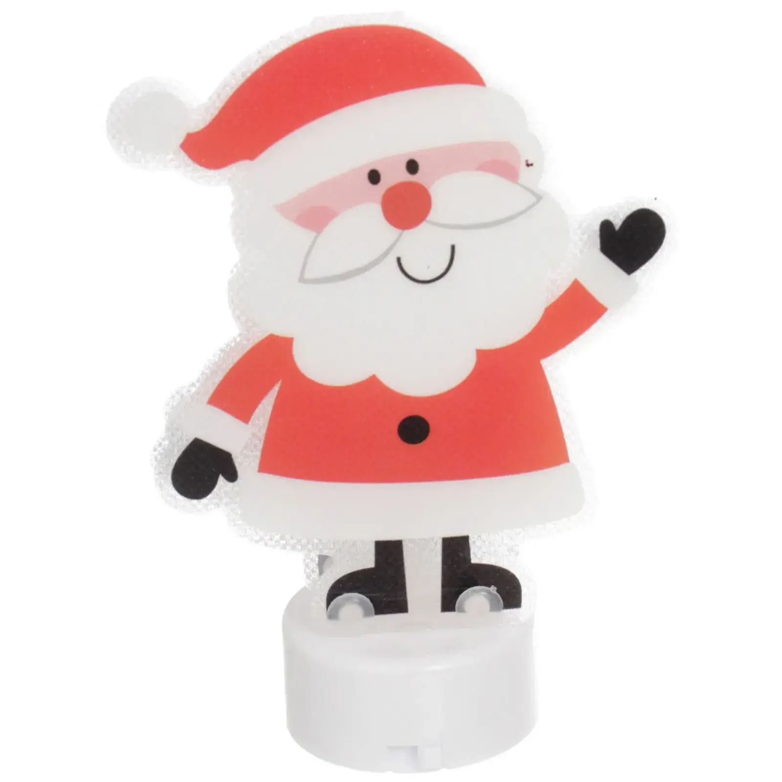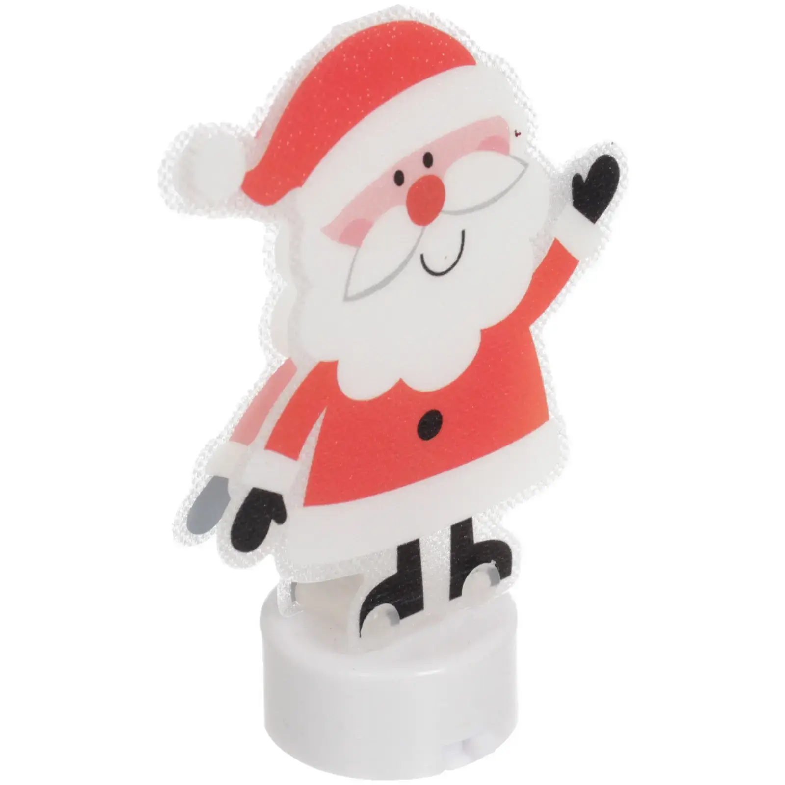Сувенир имеет размеры 10,5 см в высоту и 7,5 см в ширину, что делает его идеальным для настольного использования. Он выполнен в красном и белом цветах, что соответствует традиционным новогодним цветам. Подсветка добавляет дополнительный эффект, создавая атмосферу праздника.