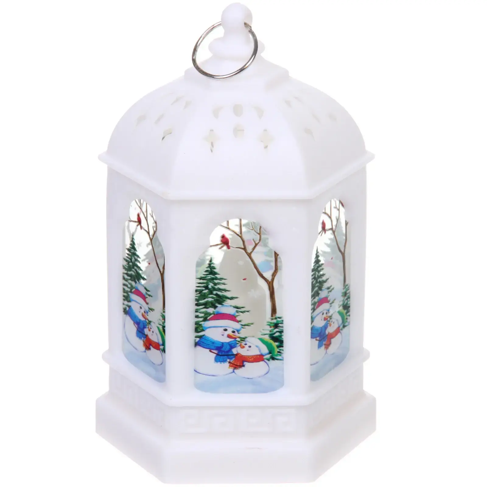 Этот удивительный сувенирный фонарь с подсветкой станет идеальным дополнением вашего новогоднего декора. Его уникальный дизайн и яркие зимние пейзажи создадут уютную и волшебную атмосферу в вашем доме. Фонарь выполнен из качественного белого пластика, что обеспечивает его долговечность и надежность. Он работает от трех батареек LR44, что делает его удобным в использовании и не требует подключения к электросети.