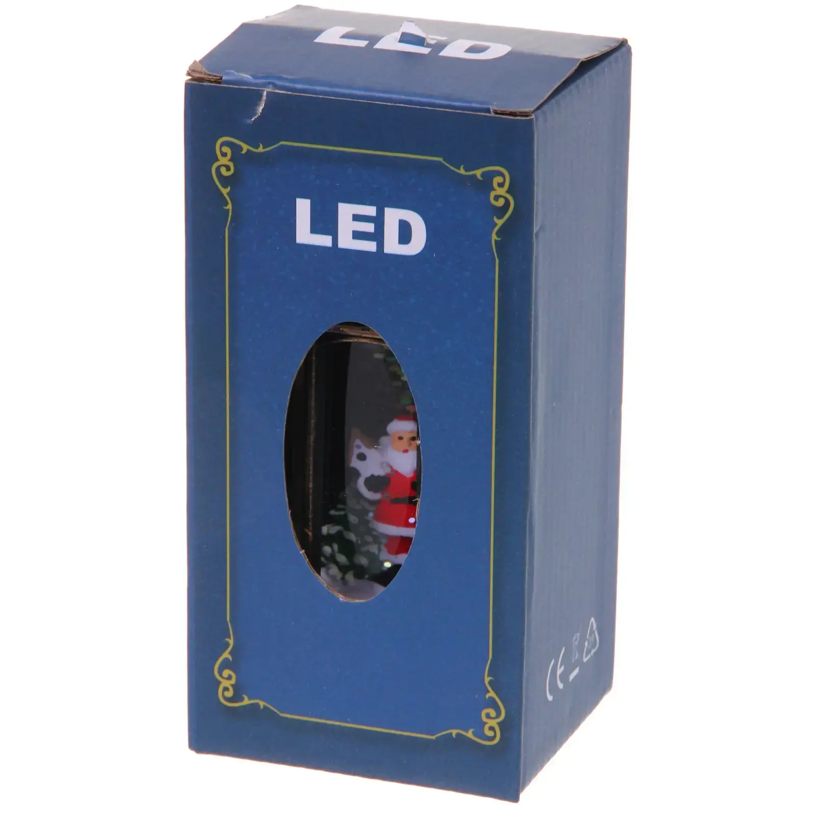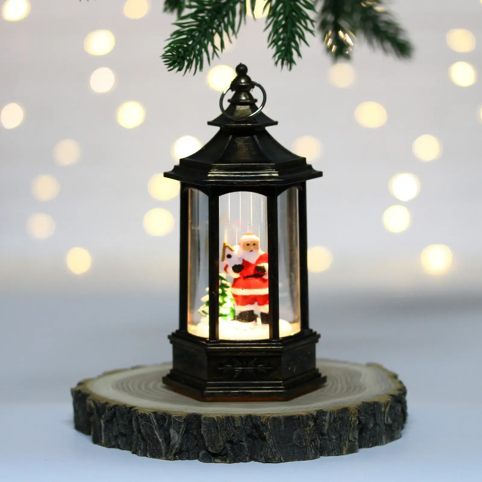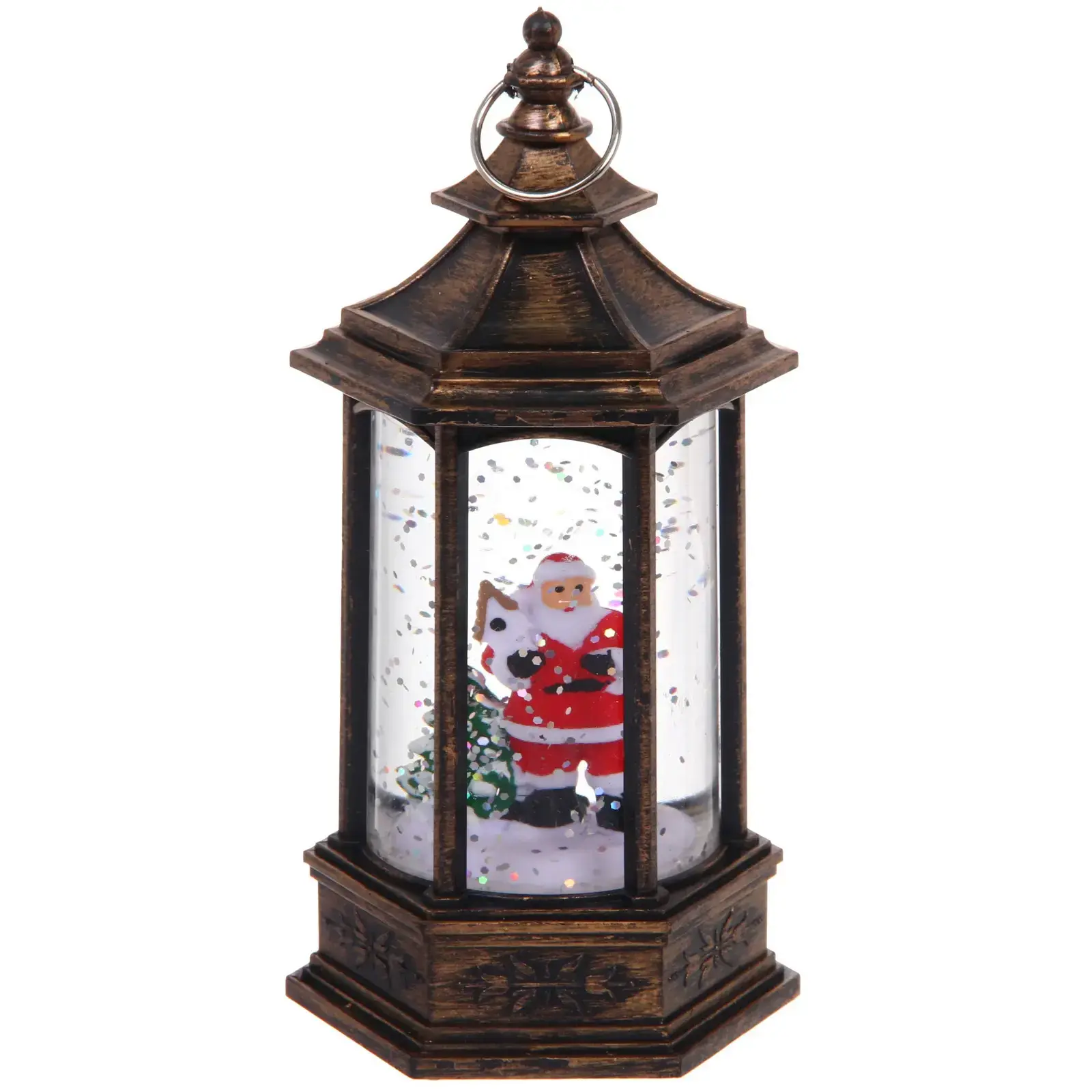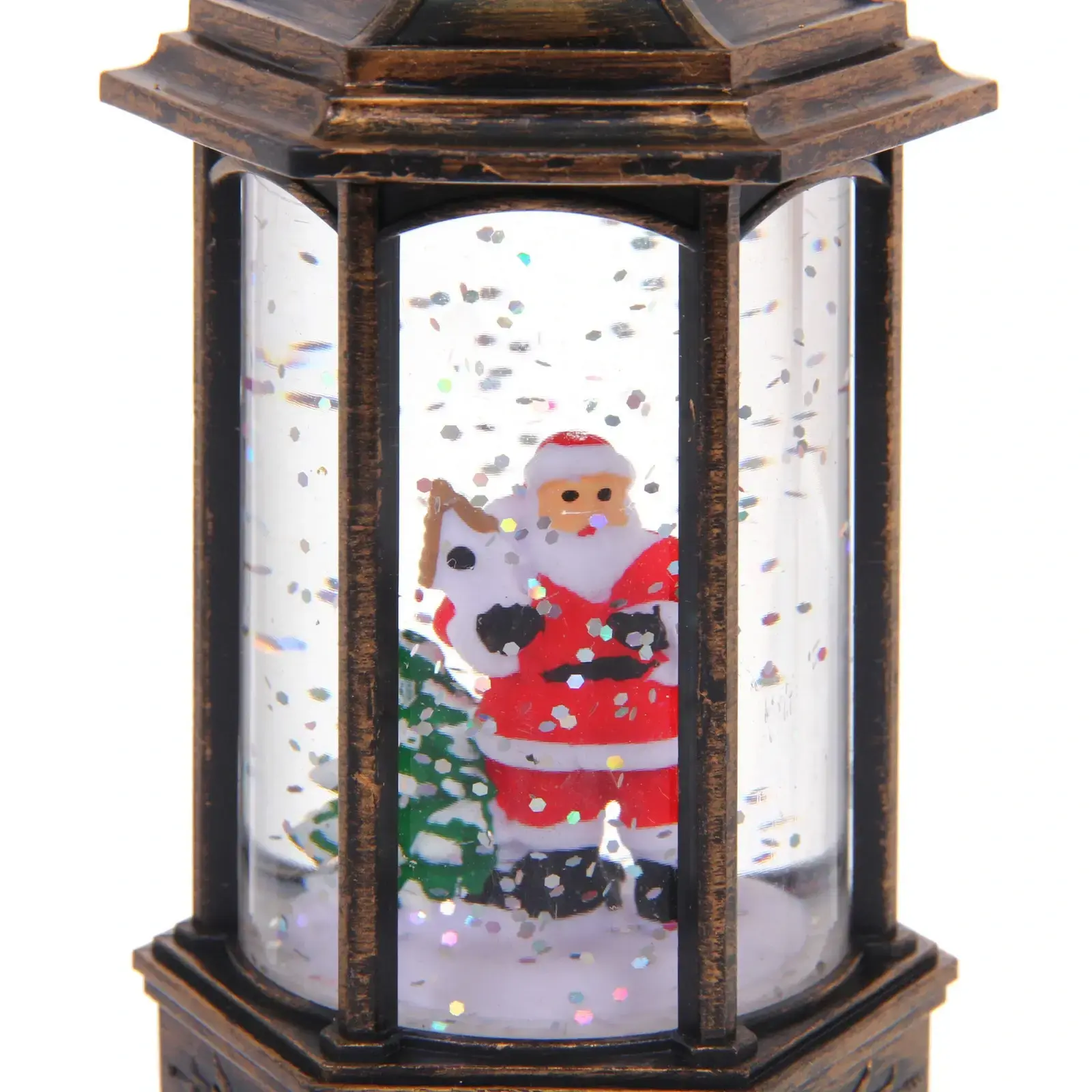 Внутри фонаря вы найдете очаровательные фигурки: Санта-Клауса с питомцем и миниатюрную елочку, окруженные эффектом искусственного снега.