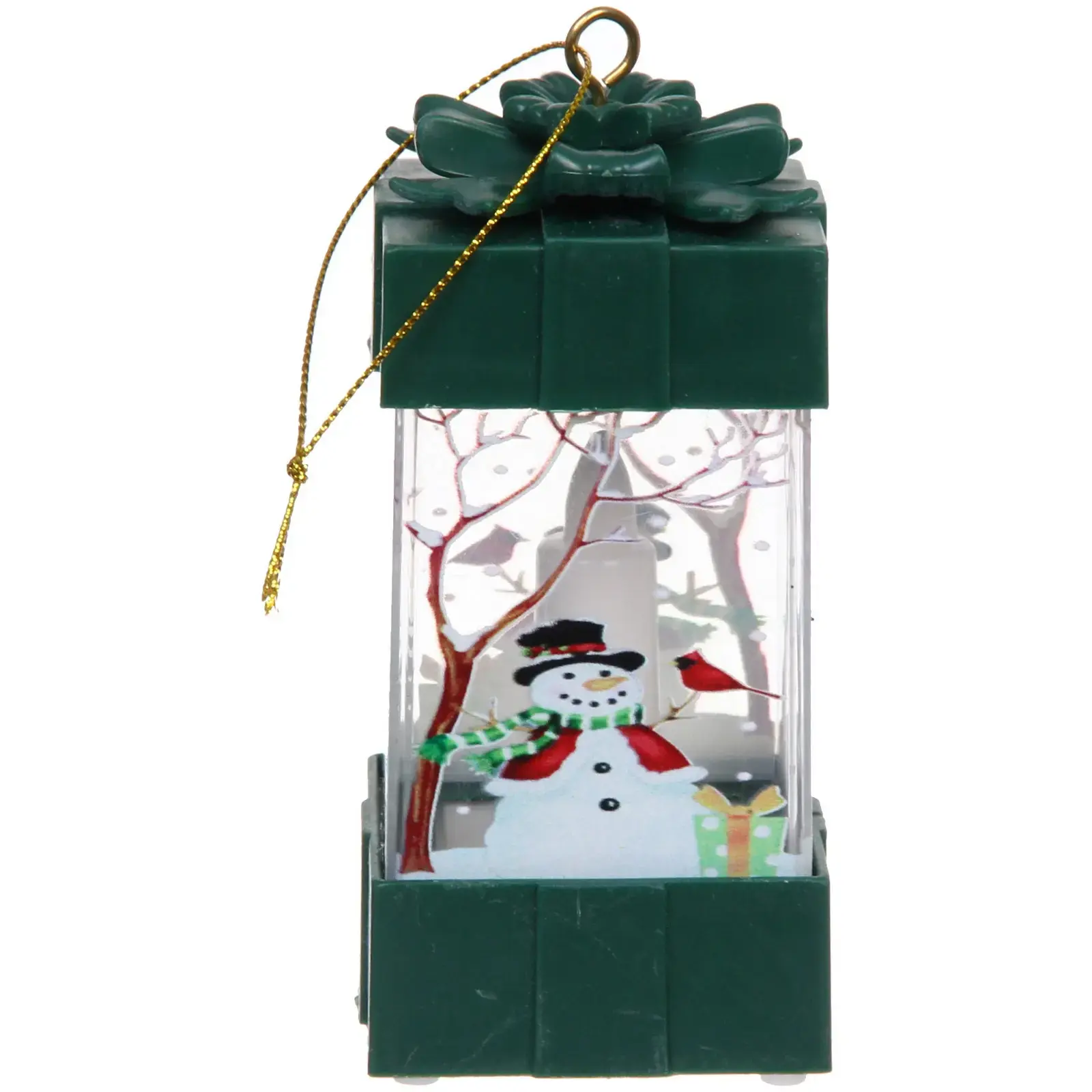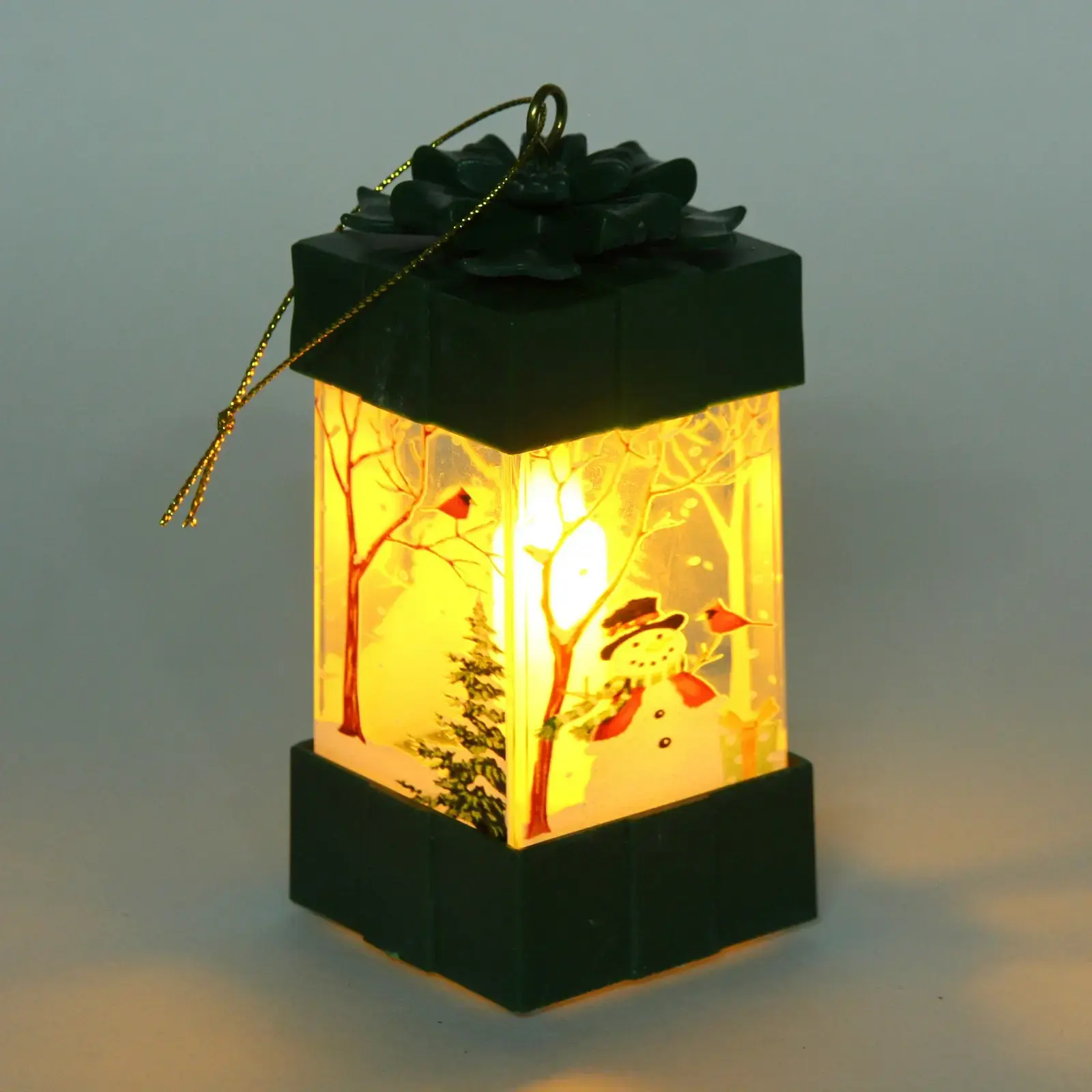 Фонарь выполнен в форме прямоугольного светильника с закругленными углами и украшен верхней частью в виде цветка. Он идеально подходит для использования в качестве настольного украшения или подвесного светильника. Благодаря прозрачным стенкам, вы сможете наслаждаться зимним пейзажем, изображающим снеговика, еловые деревья и снежные узоры, создавая атмосферу зимней сказки.