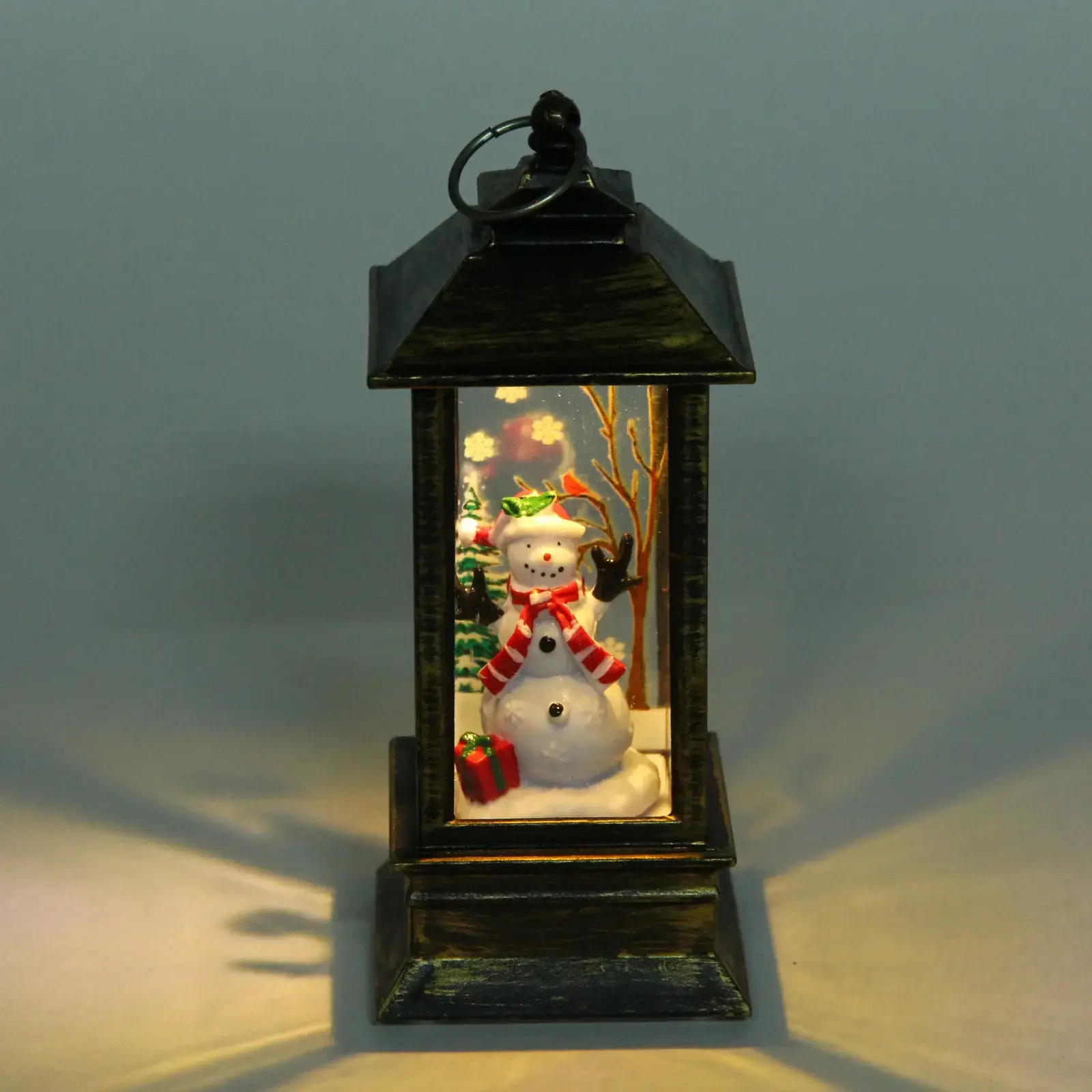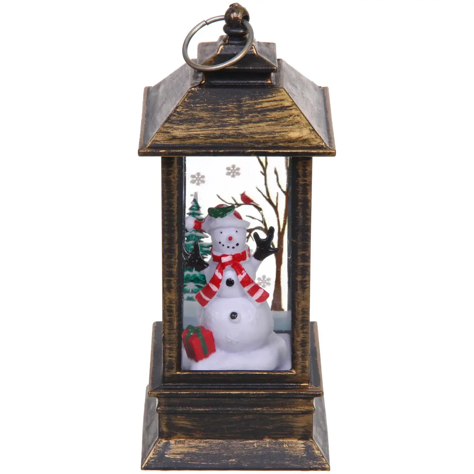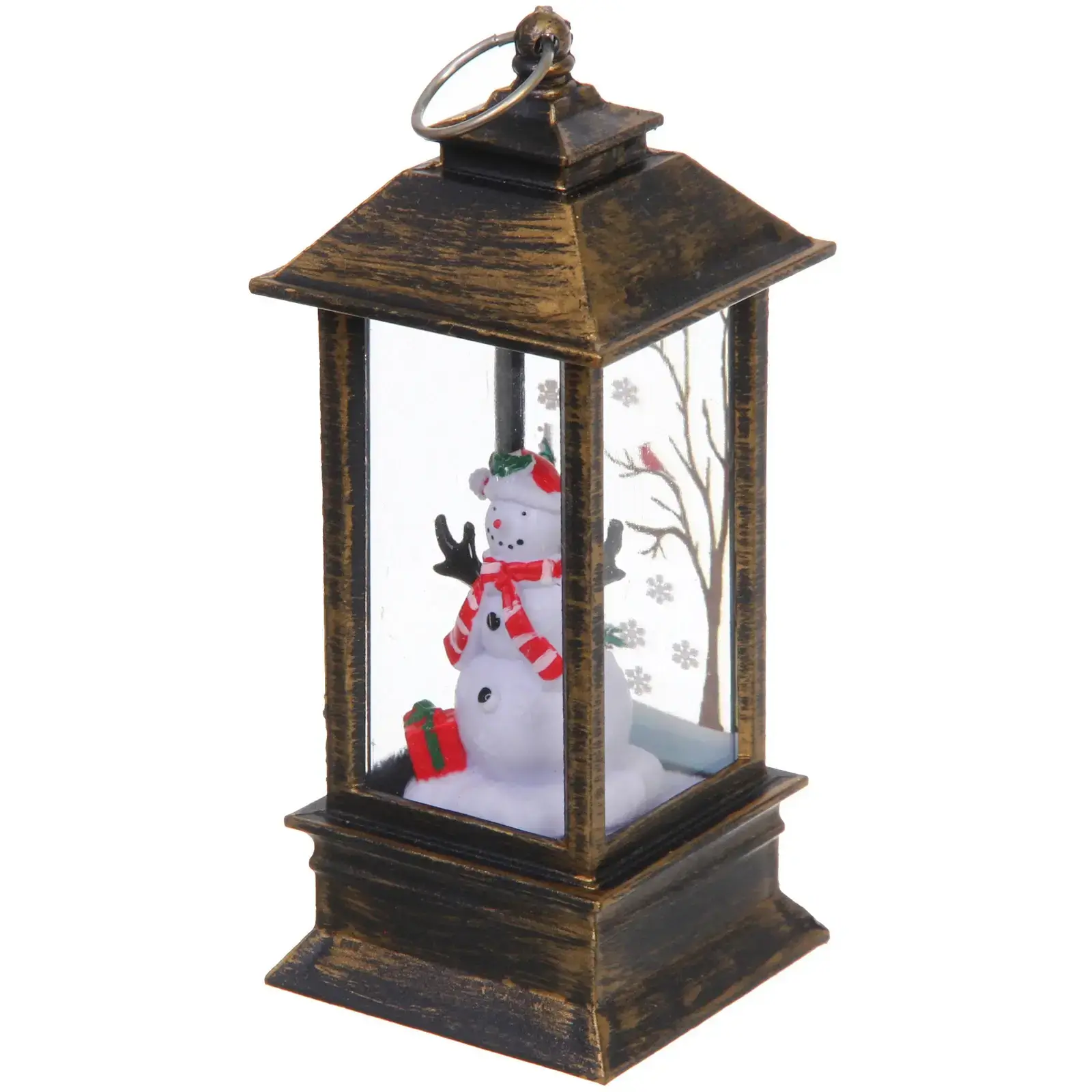 Светильник имеет стильный дизайн с черной металлической рамкой и прозрачными стенками, что позволяет видеть внутреннее оформление. Внутри находится фигурка снеговика, окружённая зимним пейзажем, что делает его идеальным элементом декора для новогодних праздников. Не упустите возможность добавить этот замечательный светильник в вашу коллекцию новогодних украшений!