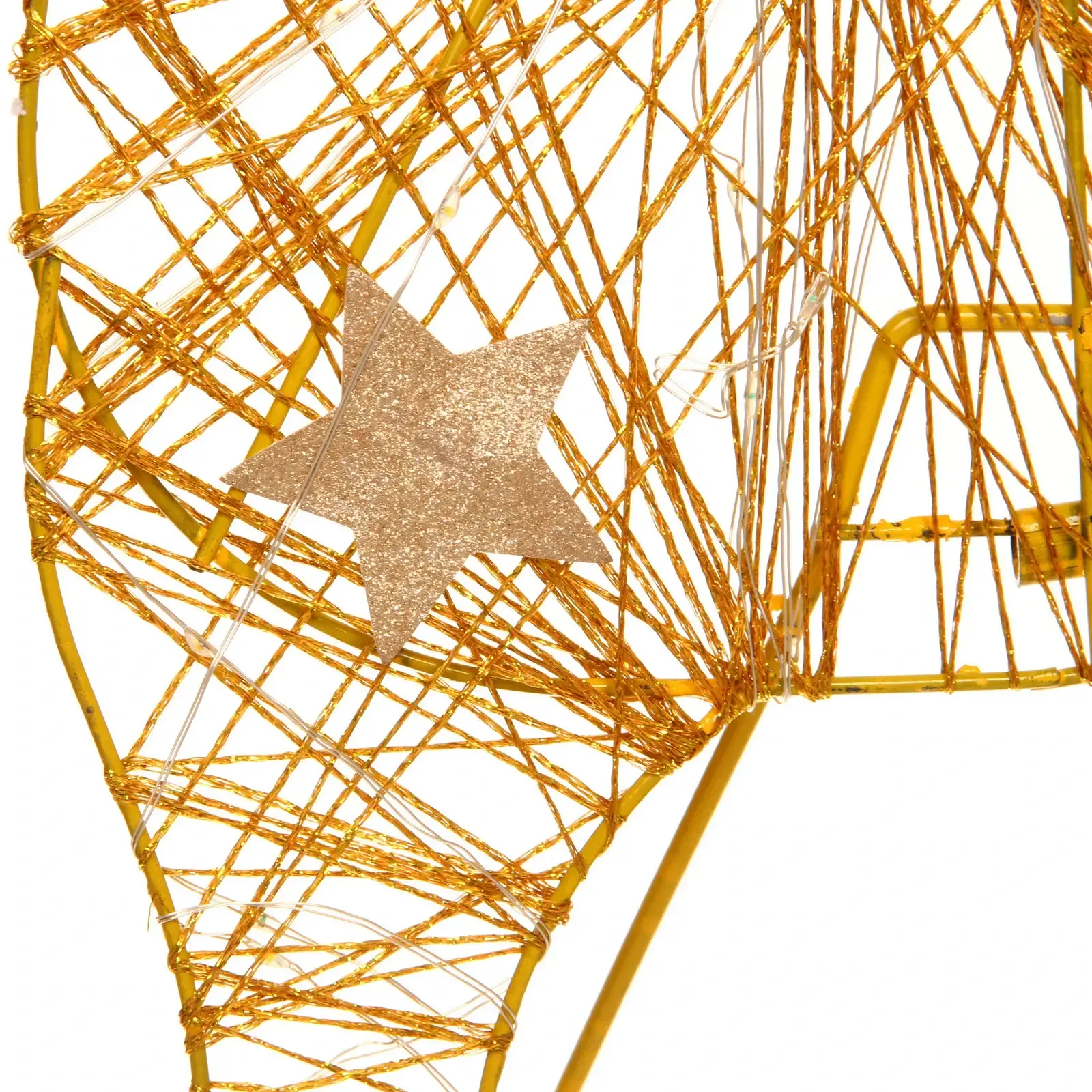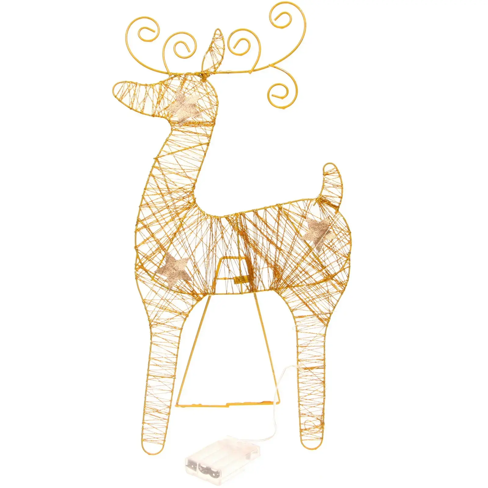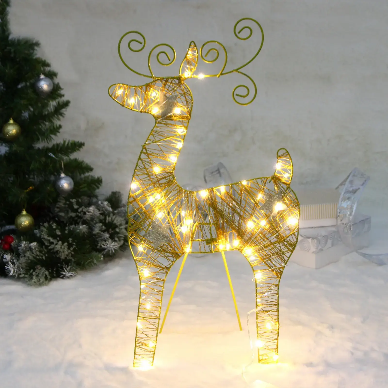 Сувенир выполнен в золотистом цвете, что придает ему элегантный вид. Его конструкция включает в себя проволочную обмотку, по которой размещены светодиоды, создающие эффект сияния. Размеры оленя делают его заметным элементом декора, который будет радовать вас и ваших близких в течение всего праздничного сезона.