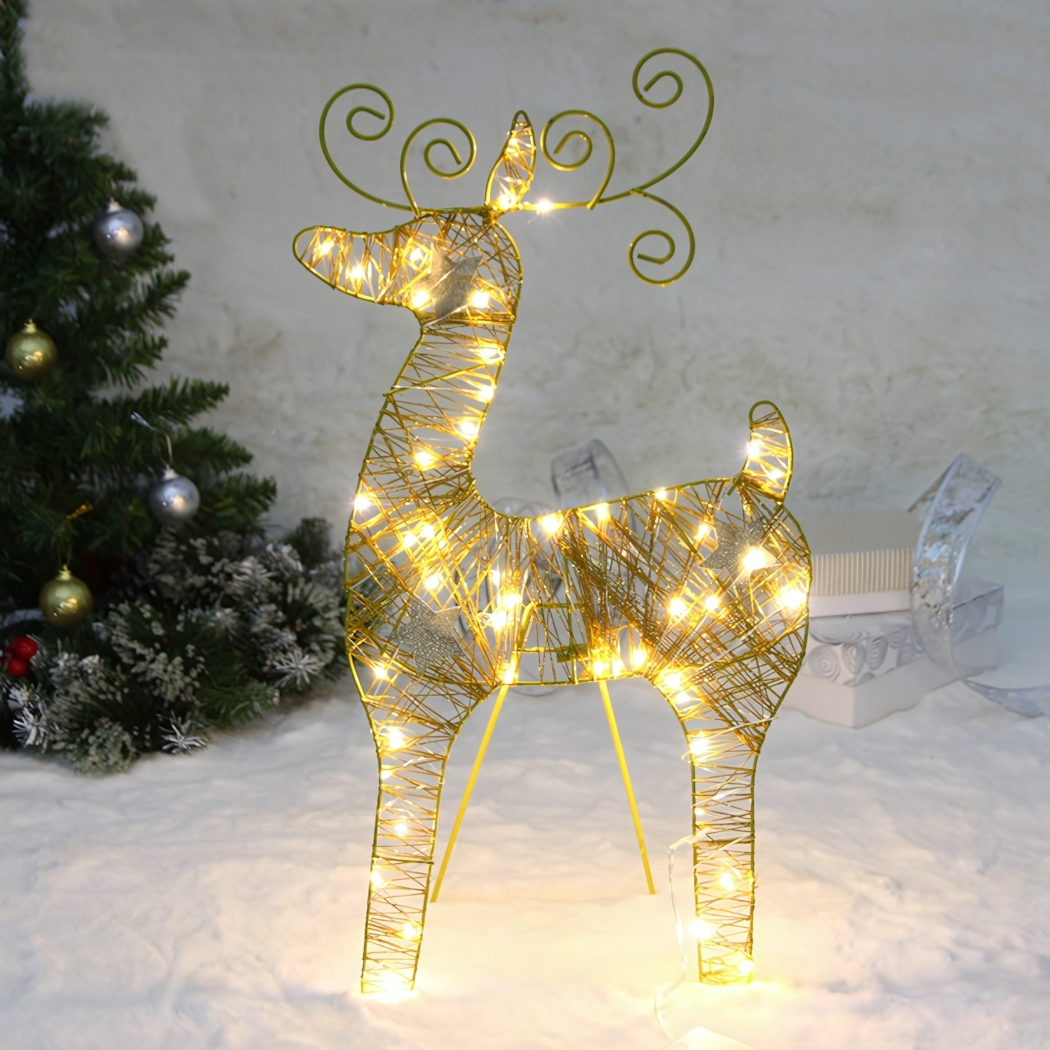 Размер – 47 см, цвет – теплый белый, материал – металл и пластик. Свет освещает изделие по всей длине, создавая эффект, будто олень полностью обрамлен световой гирляндой. Питание от трёх обычных батареек AA, которые легко заменяются.