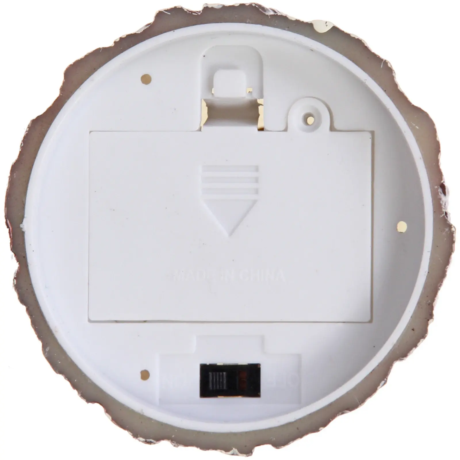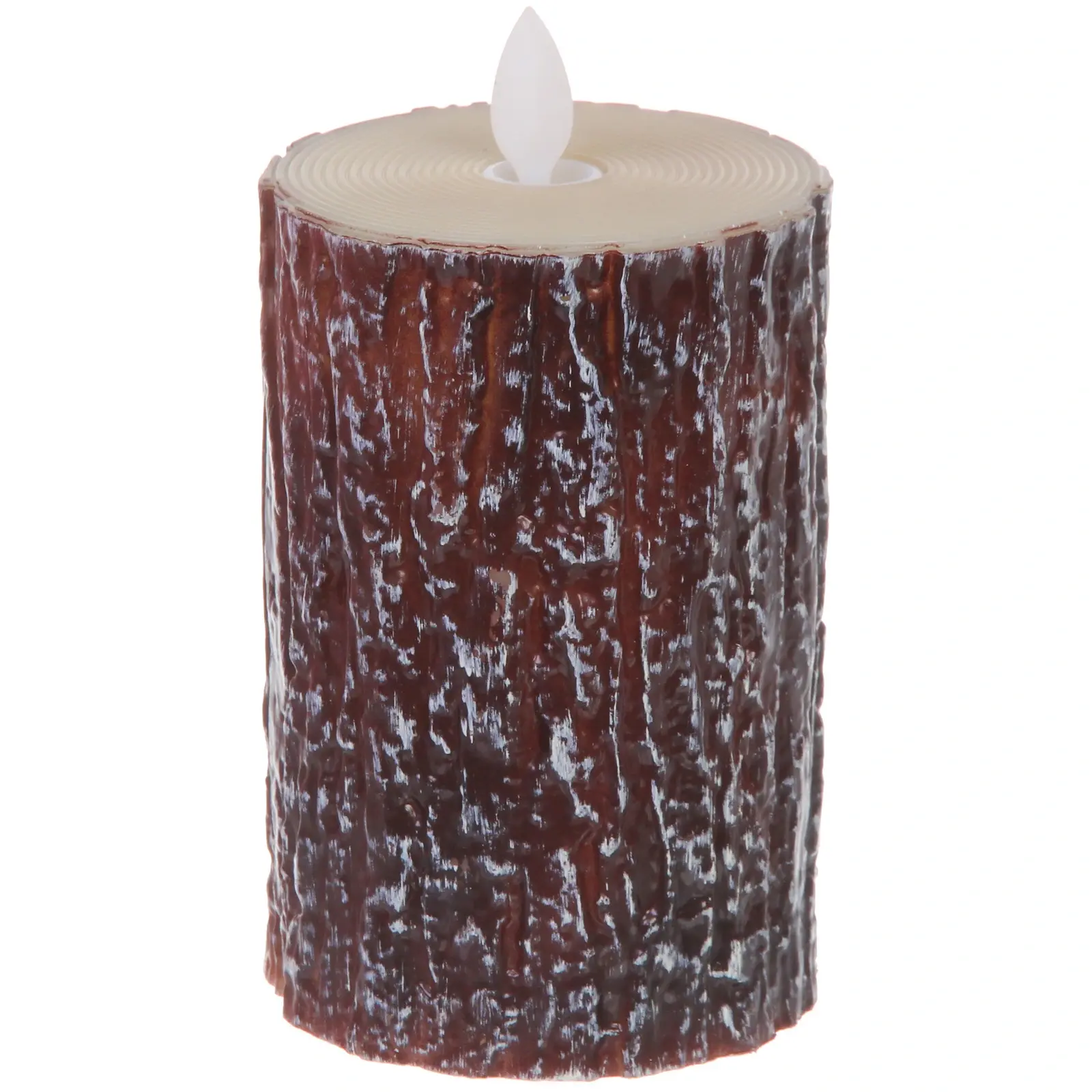 Размеры: 7,5 см в диаметре, 12,5 см в высоту. Материал: пластик. Цвет: тёмно-коричневый с текстурой дерева, имитация старения. В комплект входят батарейки для работы.