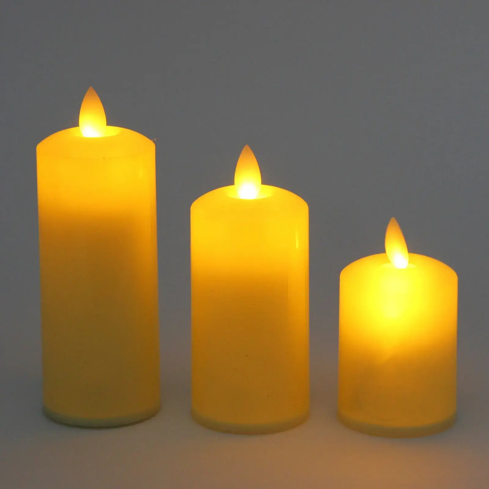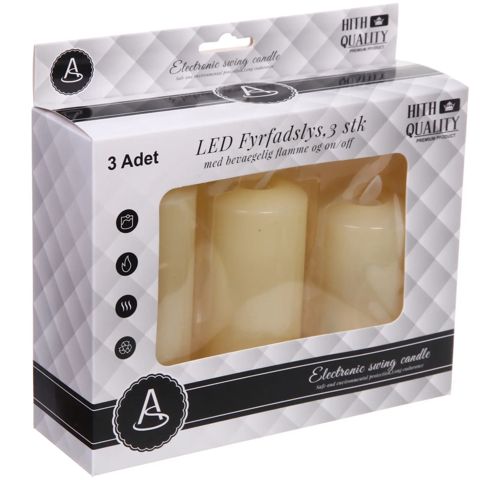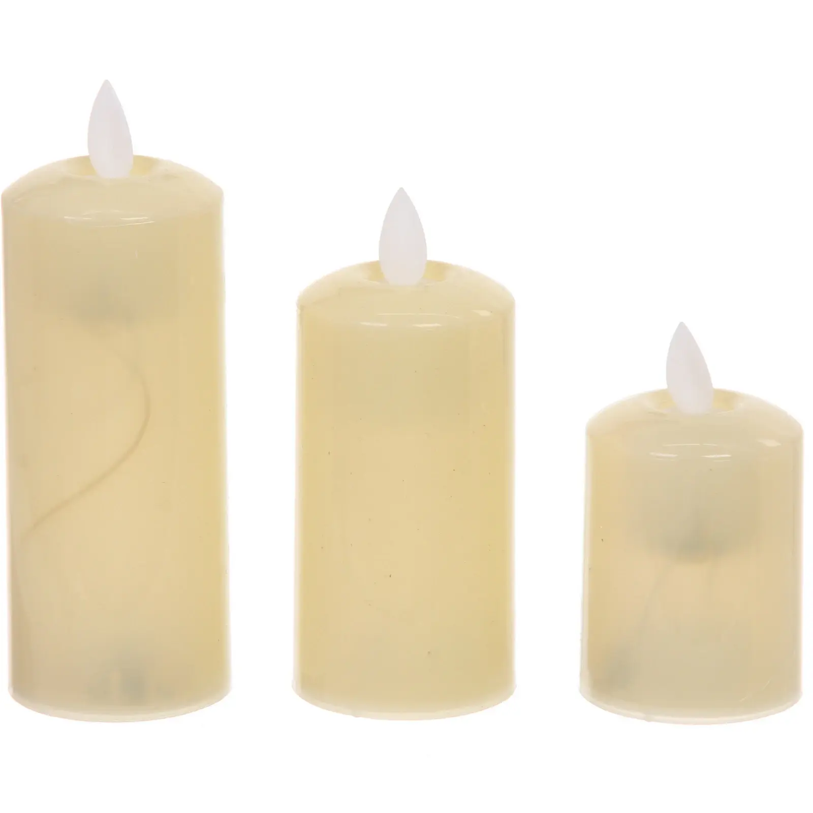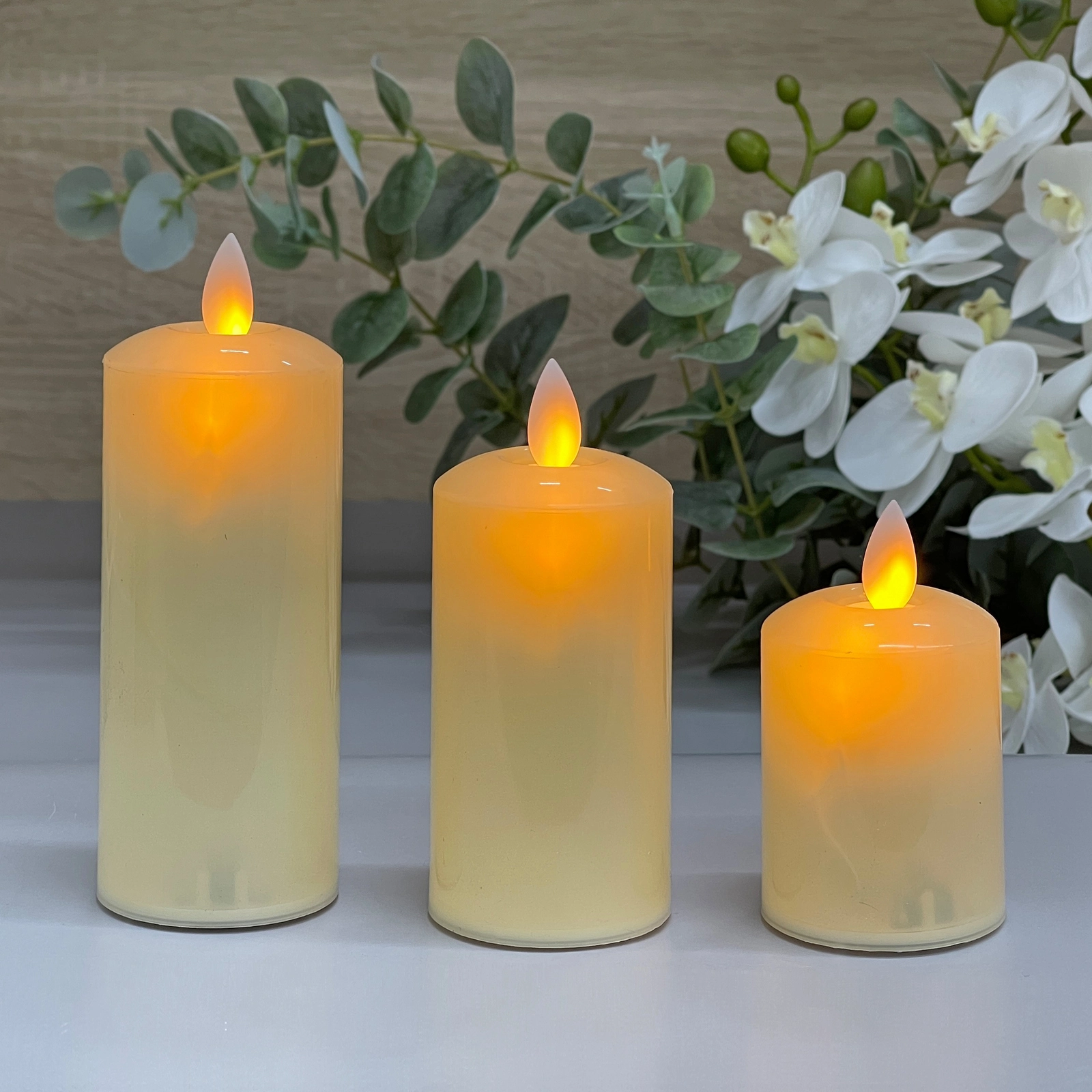 Свечи выполнены из пластика с имитацией парафина, имеют цилиндрическую форму с закруглённым верхом и мягким, равномерным светом, создающим эффект настоящих свечей. В верхней части каждого изделия — имитация пламени с светящимся язычком, что добавляет атмосферности.