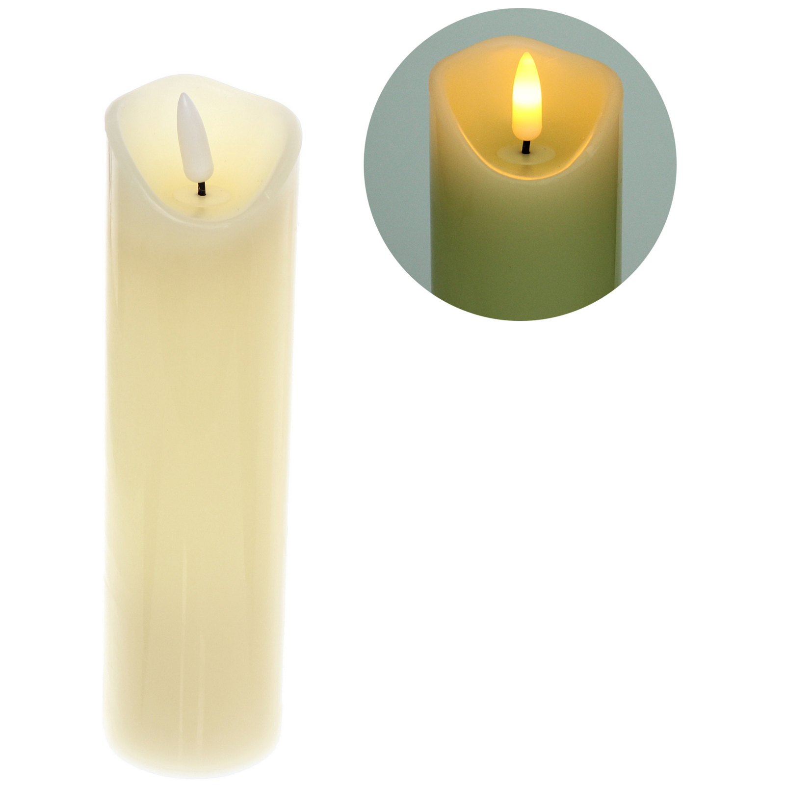 Размер: длина 5,3 см, высота 20 см, поверхность гладкая, выполнена из пластика и воска с имитацией свечения пламени.