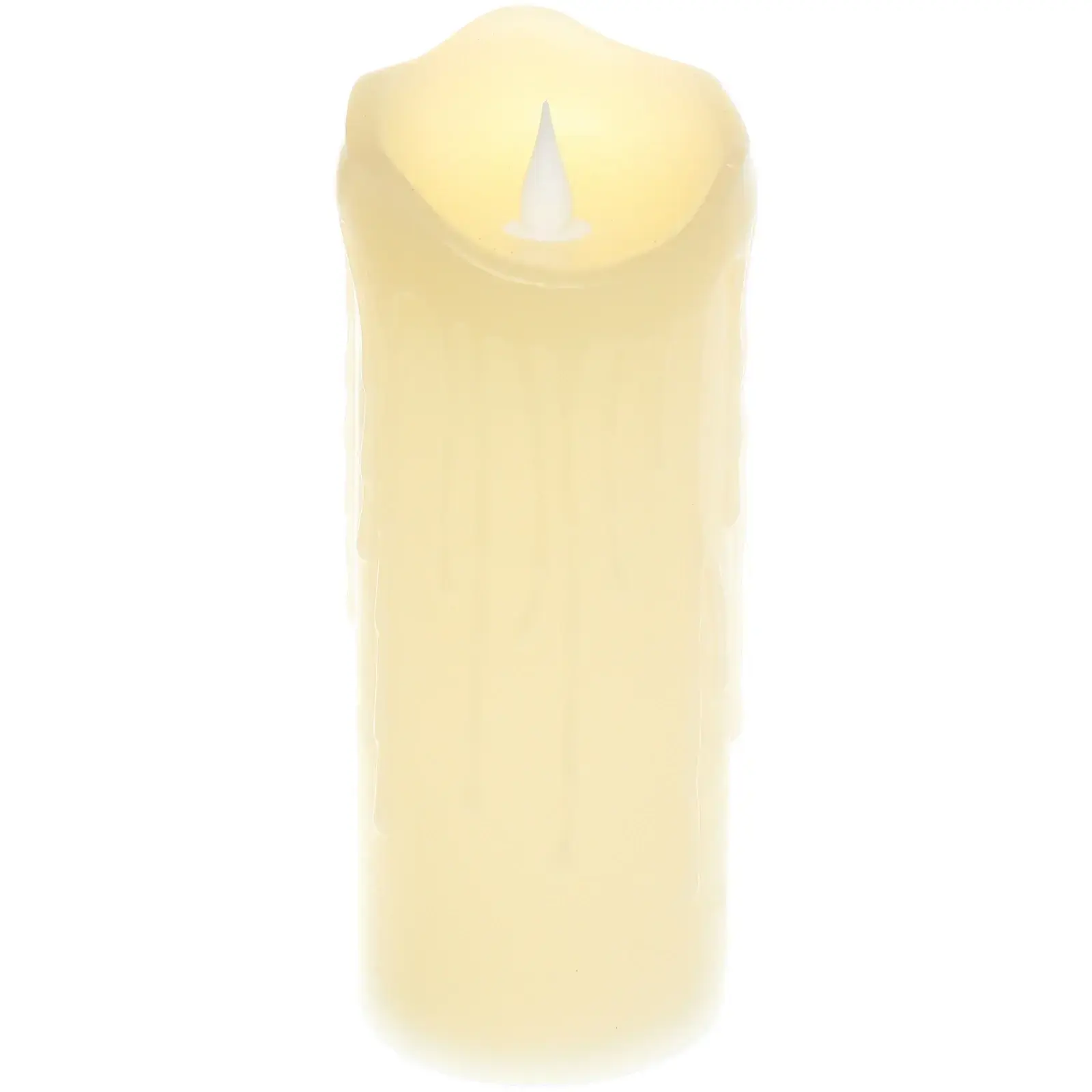 Размер — 7,5×20 см. Материалы — воск и пластик. Цвет в ассортименте, отгружается один товар, цвет определяется случайным образом. Верхняя часть выполнена с имитацией оплавленного края, внутренняя подсветка в форме язычка пламени создаёт эффект настоящей свечи.