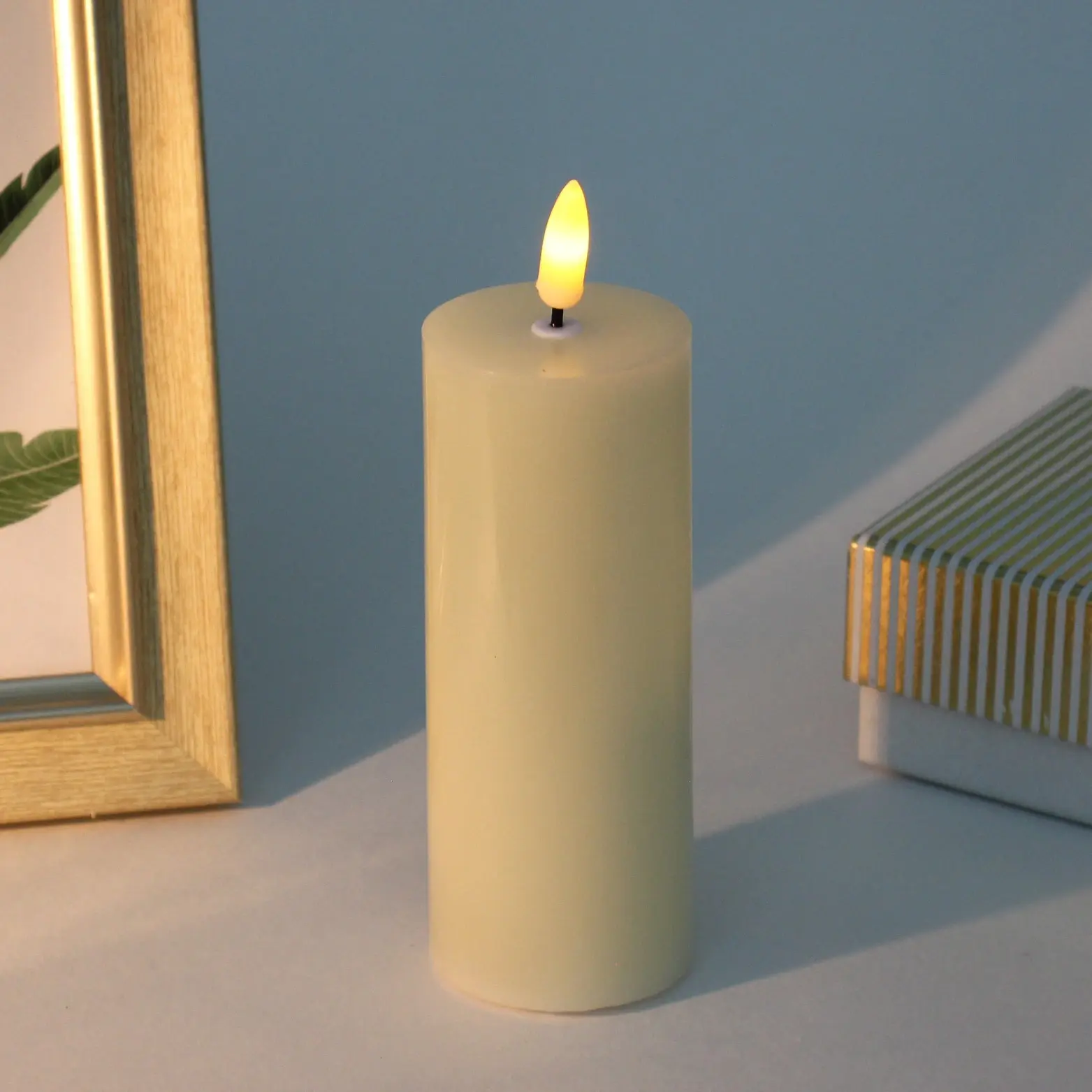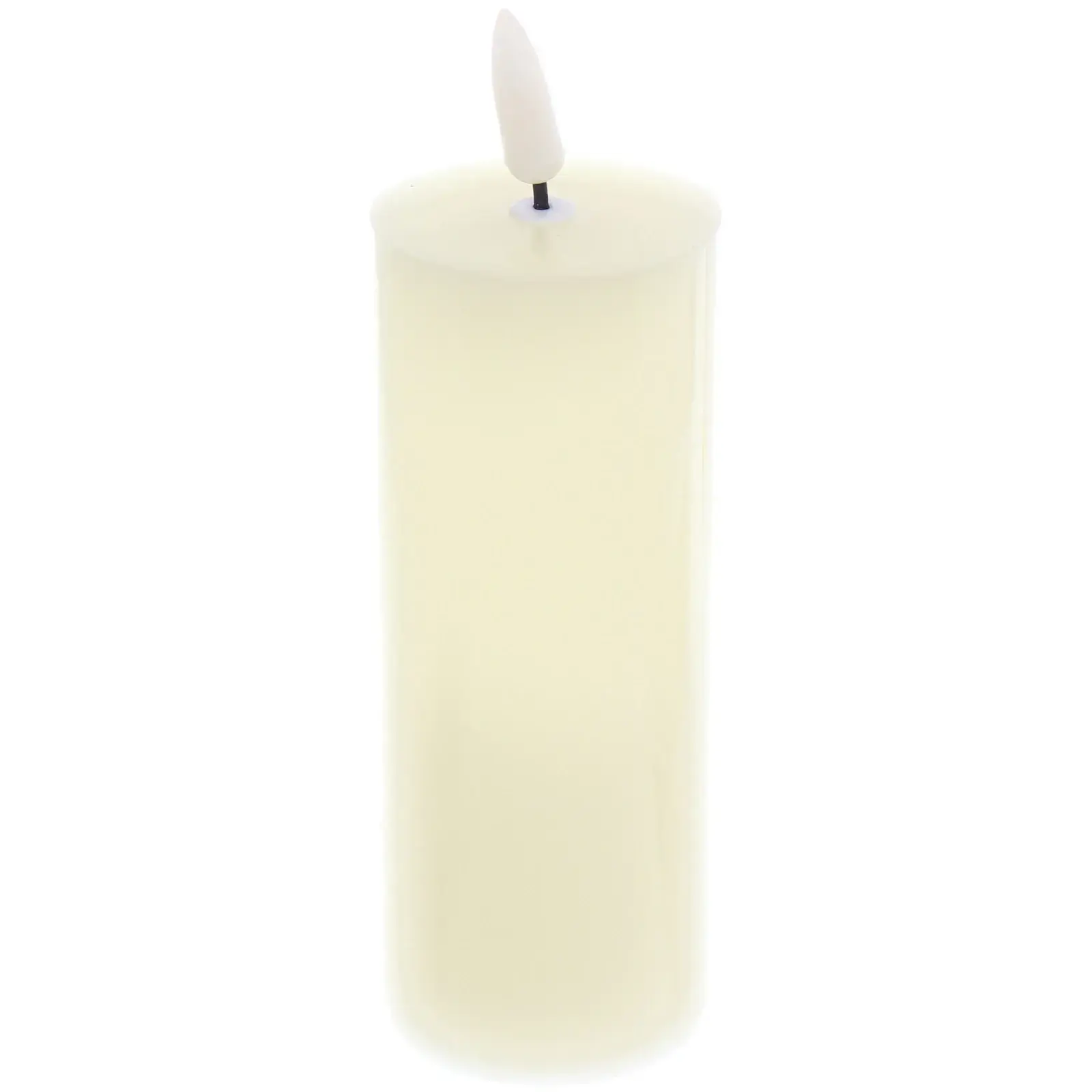 Цилиндрическая форма высотой 12,5 см и диаметром 5 см выглядит аккуратно и гармонично на любой поверхности. Корпус выполнен из воска с пластиковыми элементами для имитации фитиля и пламени. Верхняя часть имеет реалистичную текстуру расплавленного воска для максимальной похожести на настоящую горящую свечу.