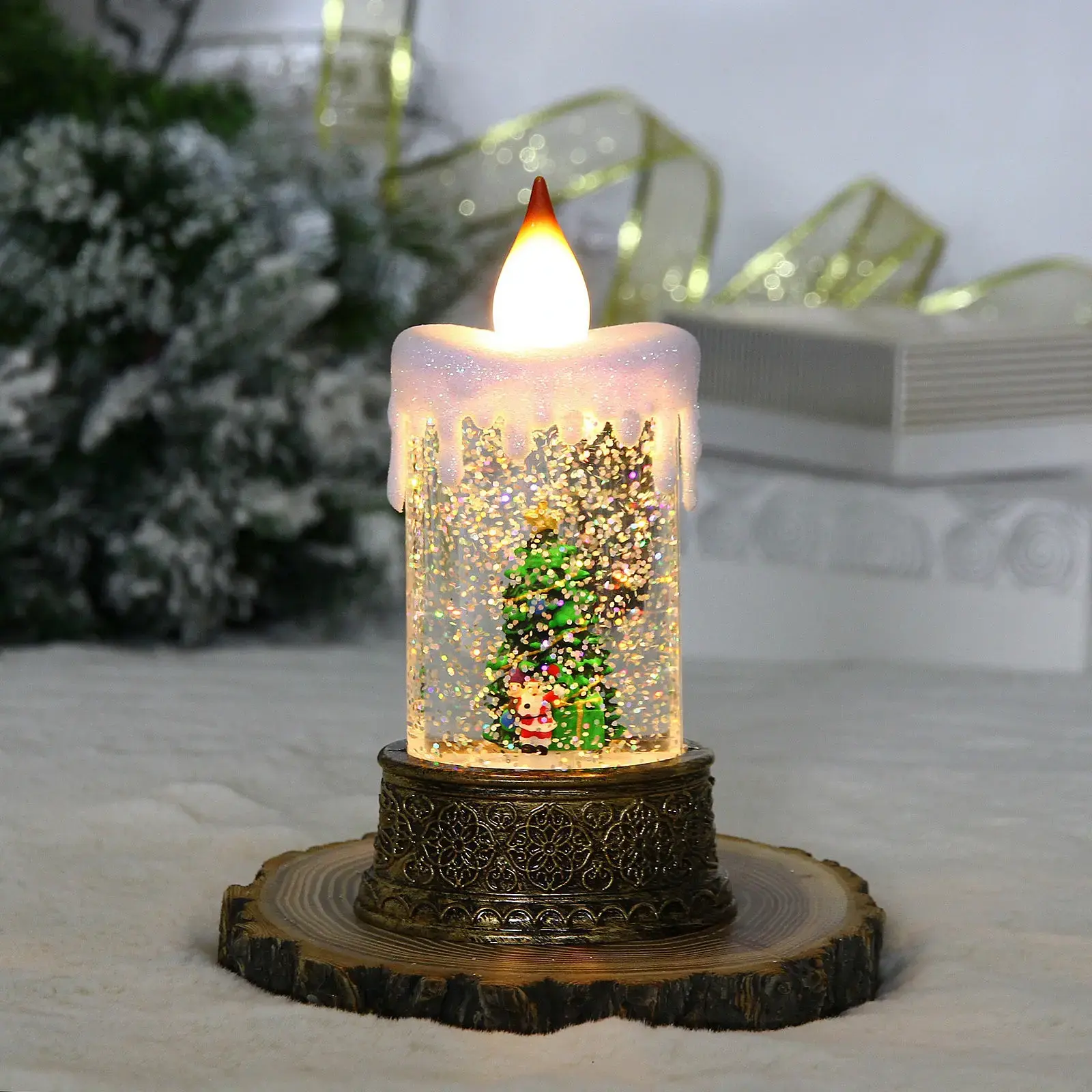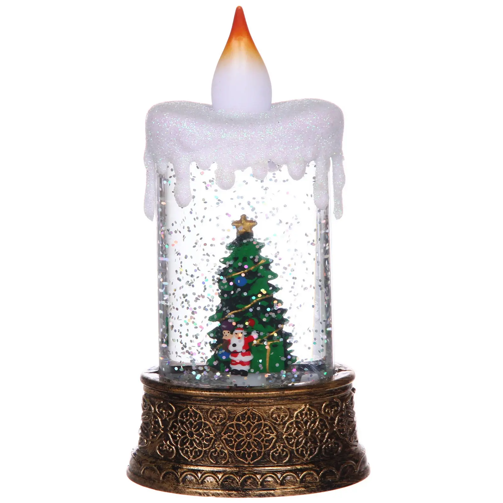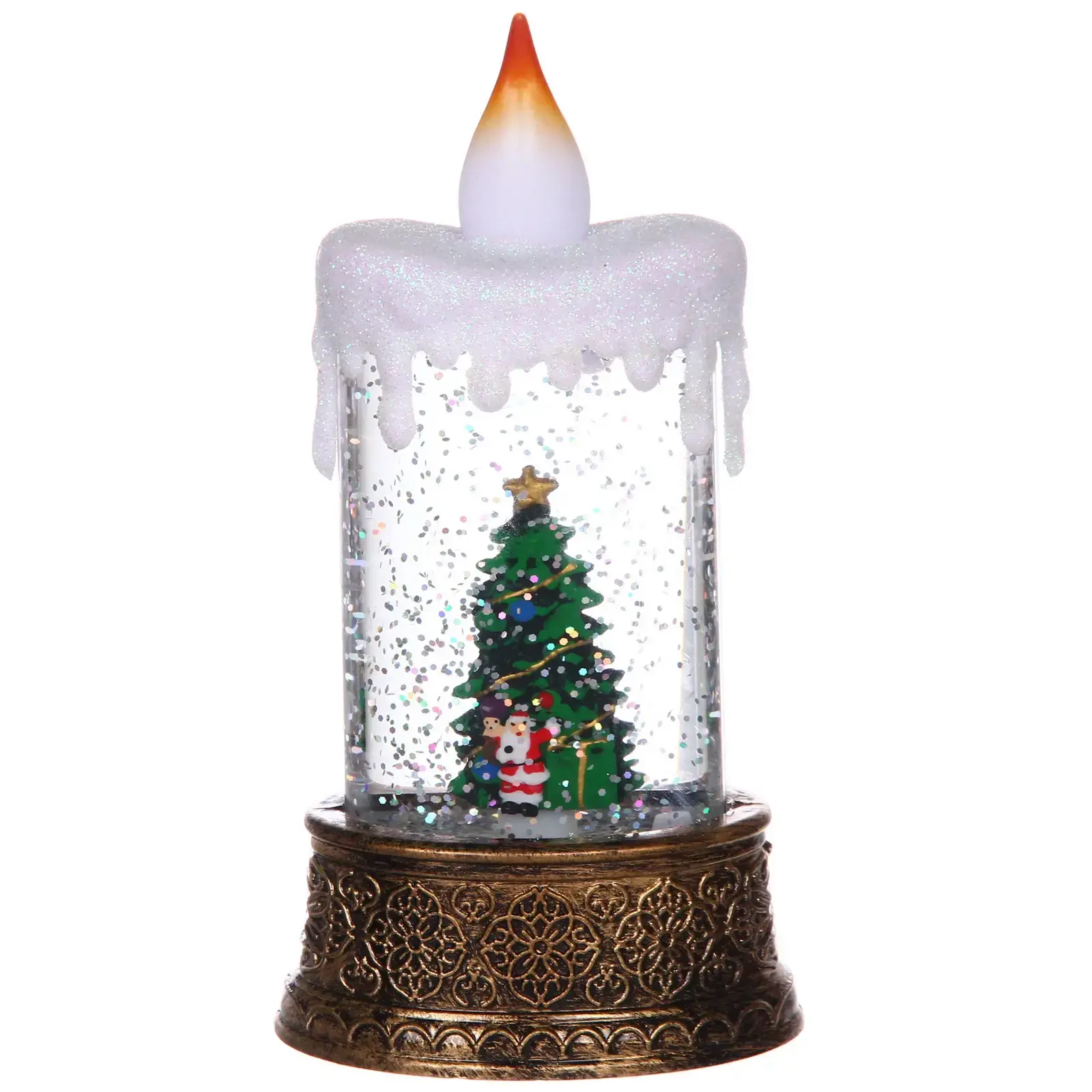 Внутреннее наполнение с миниатюрной елкой, украшениями и фигурками Санта-Клауса с оленем создает целостную праздничную композицию. Подсветка имитирует мерцающий огонь свечи, добавляя теплоты и уюта.