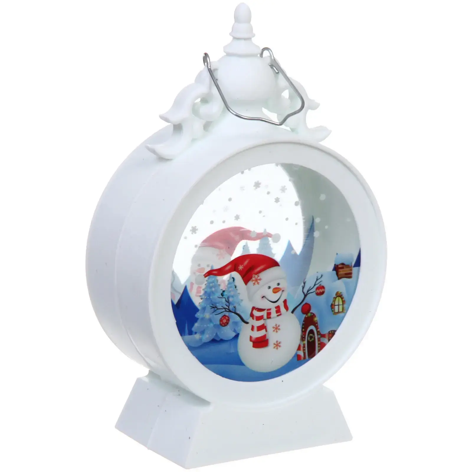 Светильник выполнен в форме снеговика с красной шапкой и шарфом, что делает его привлекательным для детей и взрослых. Он отлично подходит для украшения новогоднего стола, камина или как ночник в детской комнате. Благодаря компактным размерам 9,3*15,2 см, его легко разместить на любой поверхности, а ручка в верхней части позволяет удобно переносить светильник.