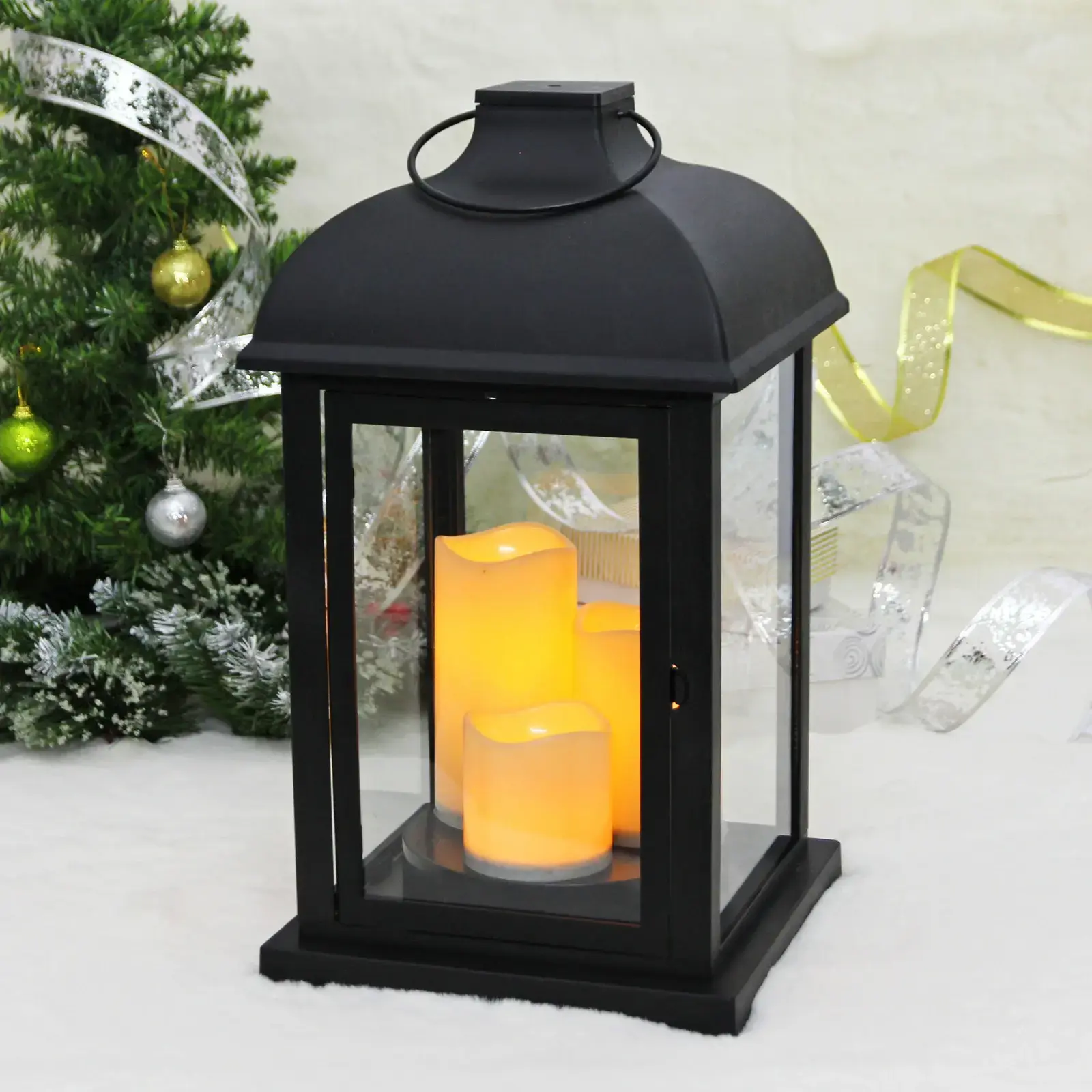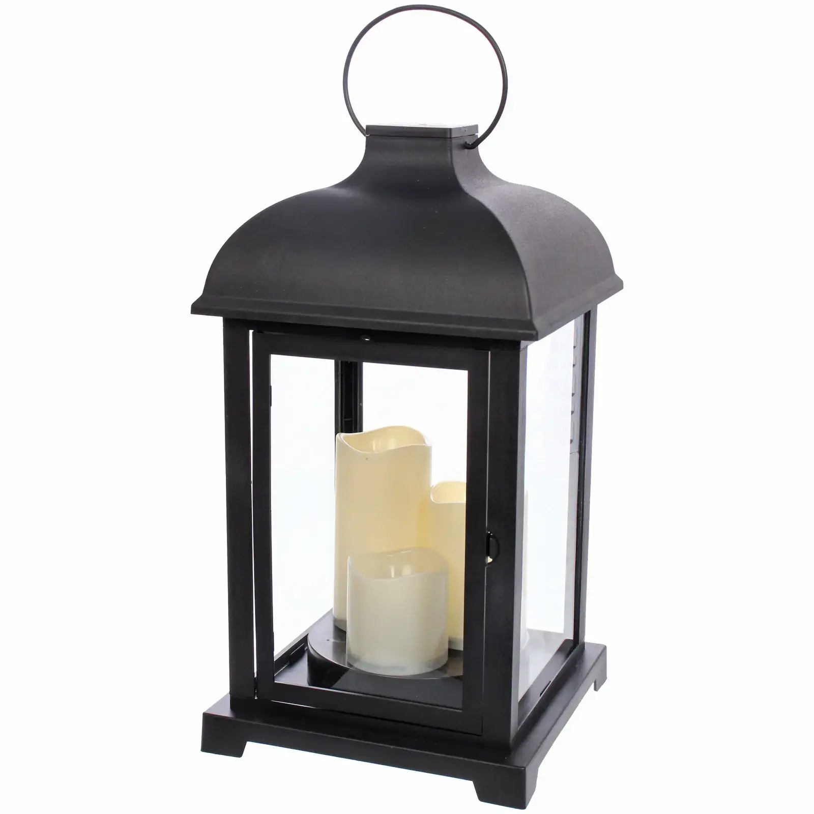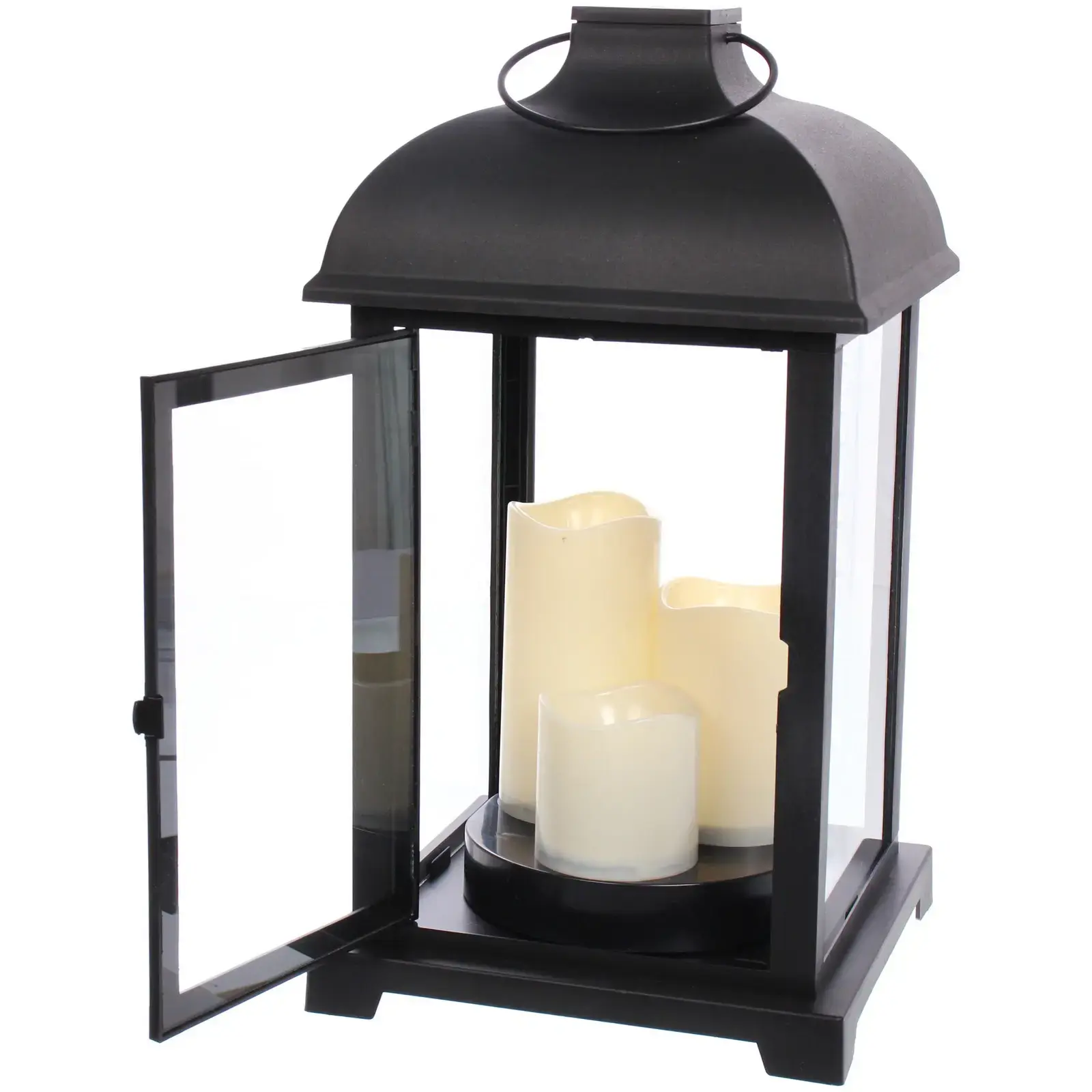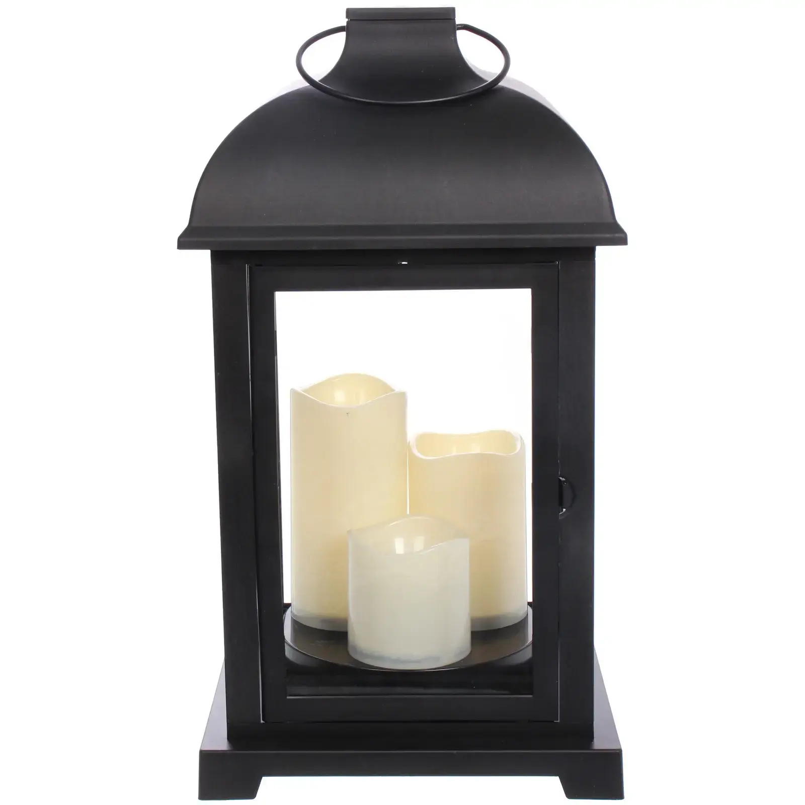 Черный матовый корпус сочетается с любым стилем интерьера, а прозрачные стеклянные панели подчеркивают объемную композицию из свечей разной высоты. Закругленная крыша и фигурные элементы создают эффект старинного фонаря.