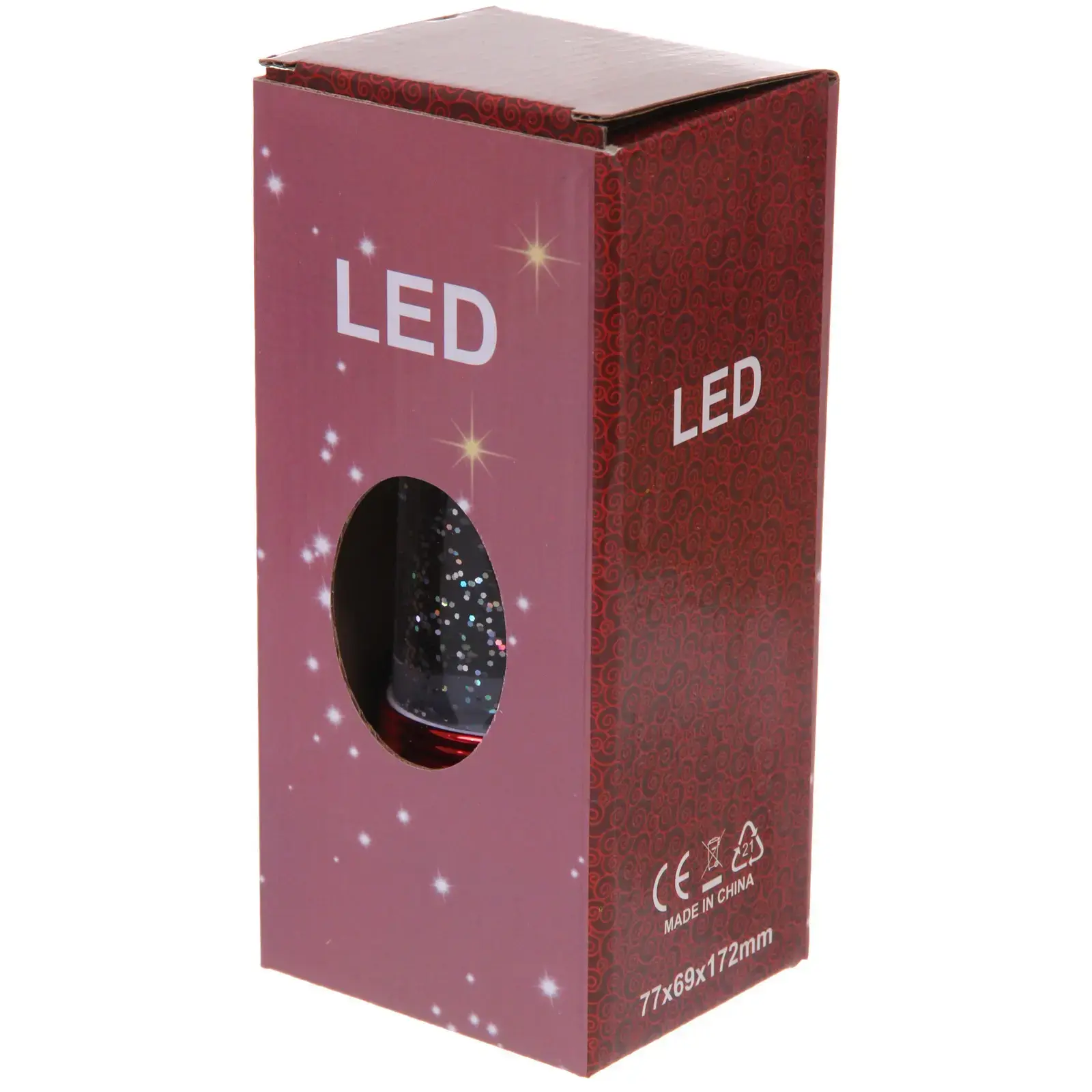 Верхняя часть светильника заполнена жидкостью с блестками, создающими эффект мерцания. Красная металлическая подставка с ручкой придает устойчивость конструкции, а деревянное основание добавляет натуральности дизайну.