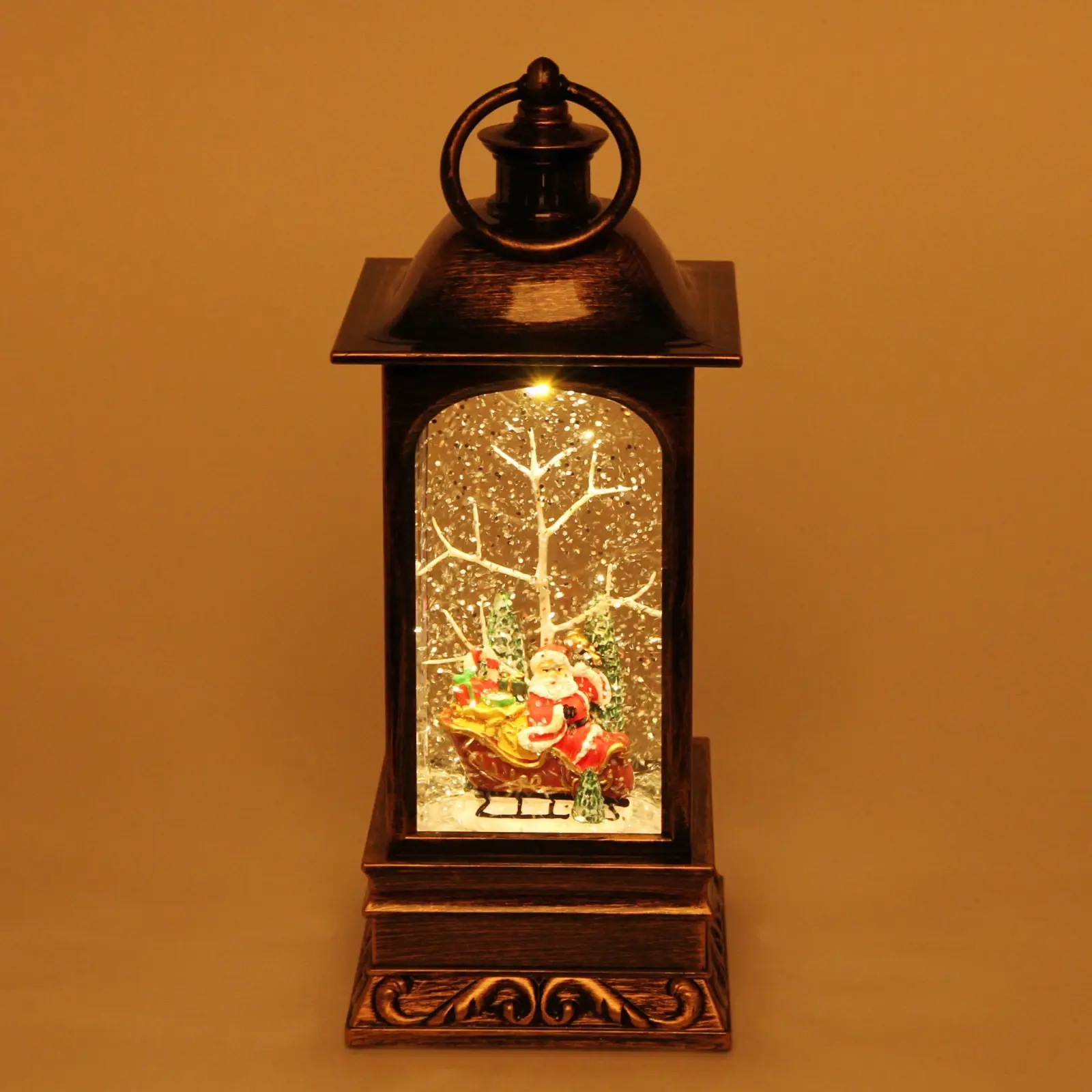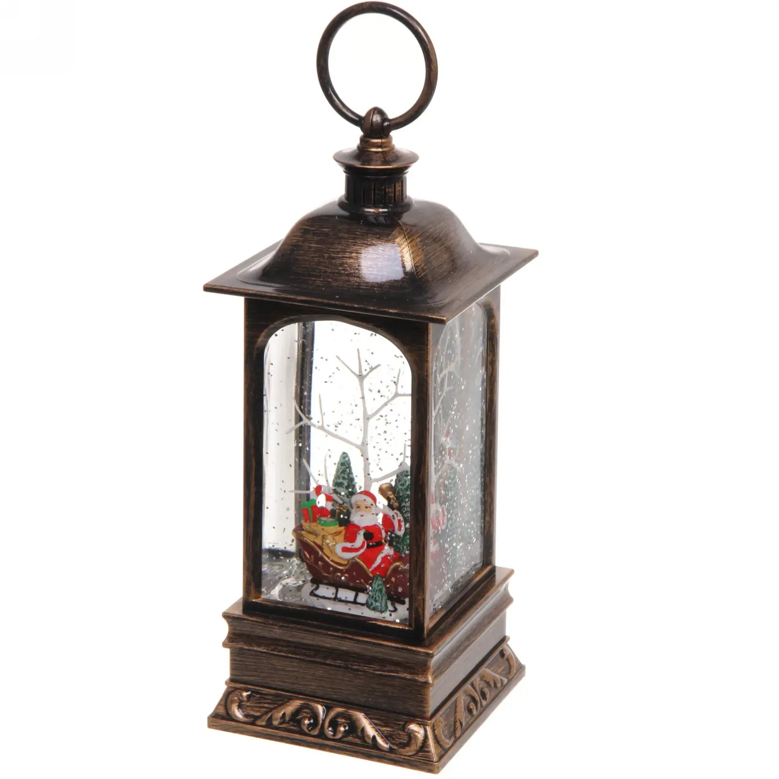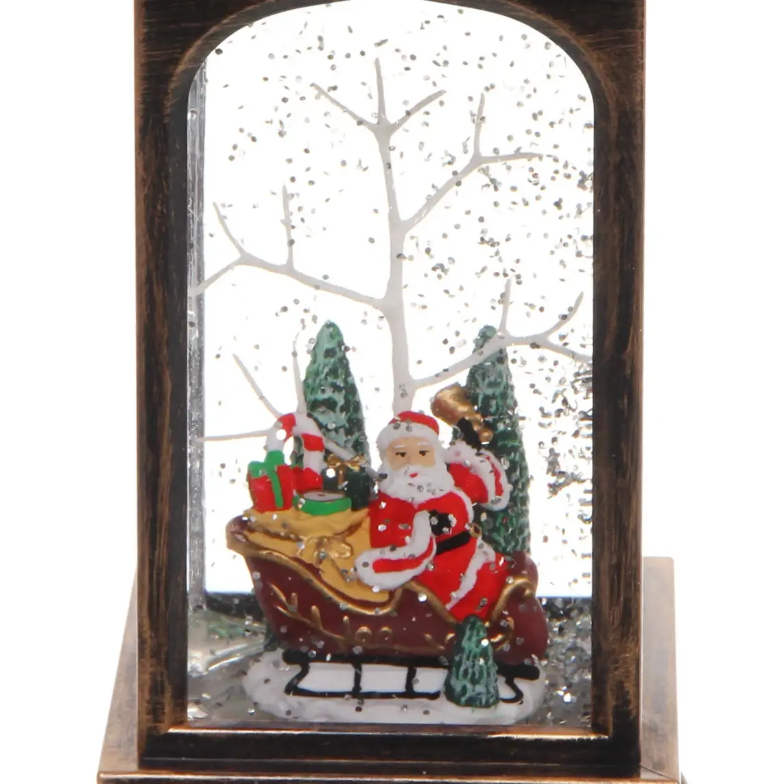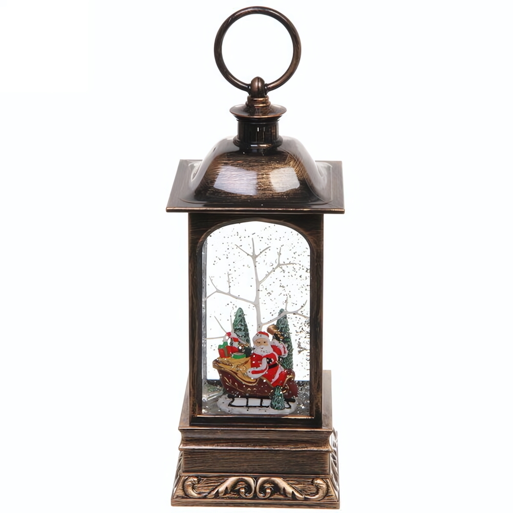 Каждый элемент фонаря тщательно продуман: стеклянные панели с иллюминацией добавляют загадочности, а фигурка Санта-Клауса на санях с подарками напомнит о волшебстве детства. Бронзовый цвет и блестящая отделка делают фонарь стильным и современным, идеально подходящим для любого интерьера. Уникальный дизайн позволит этому светильнику стать отличным акцентом в декоре.