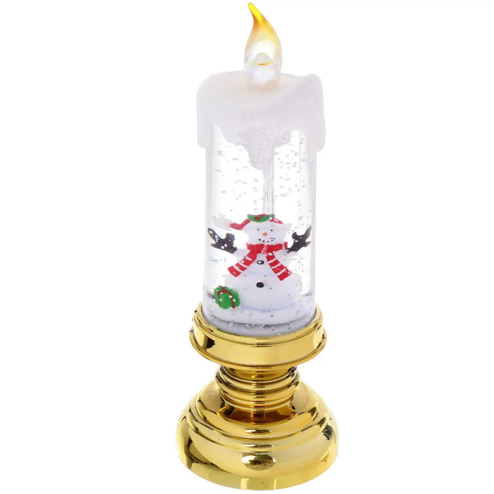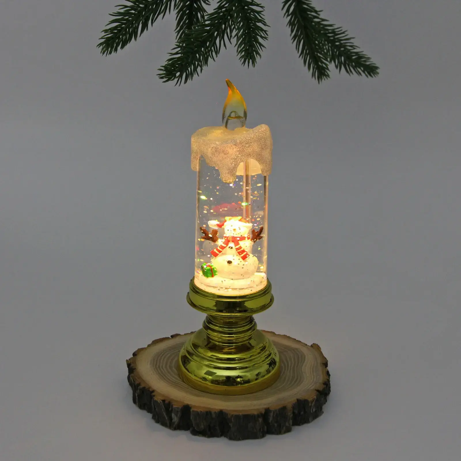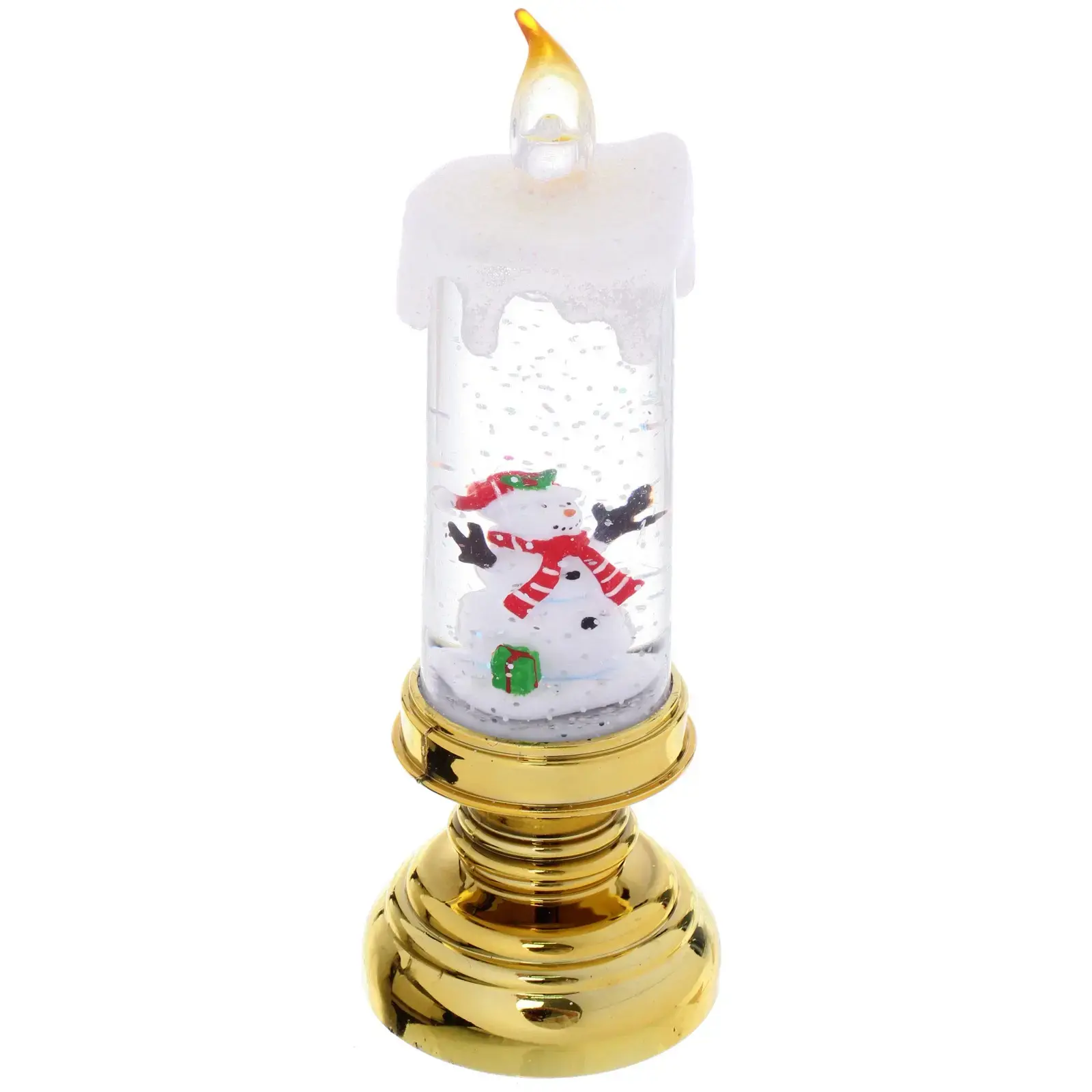 Светильник изготовлен из прозрачного пластика с золотистой отделкой. Внутри колбы находится декоративный снеговик высотой 10 см, украшенный красным шарфом. Основание выполнено в золотистом цвете, что добавляет изделию элегантности.